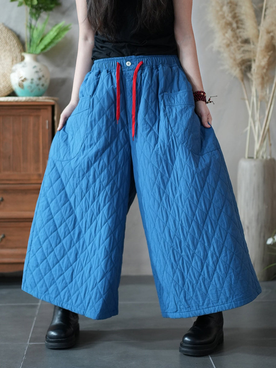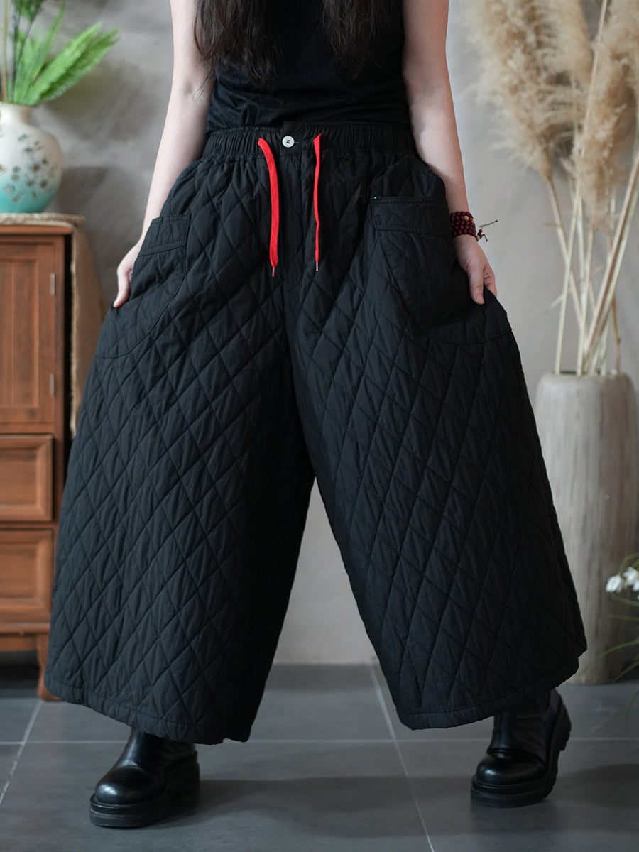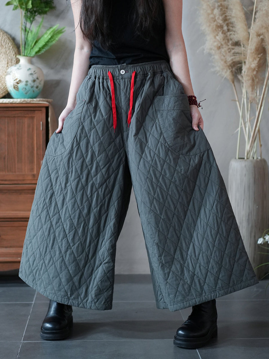 Calça feminina de inverno com modelagem artística, cor lisa e acolchoada, pernas largas.