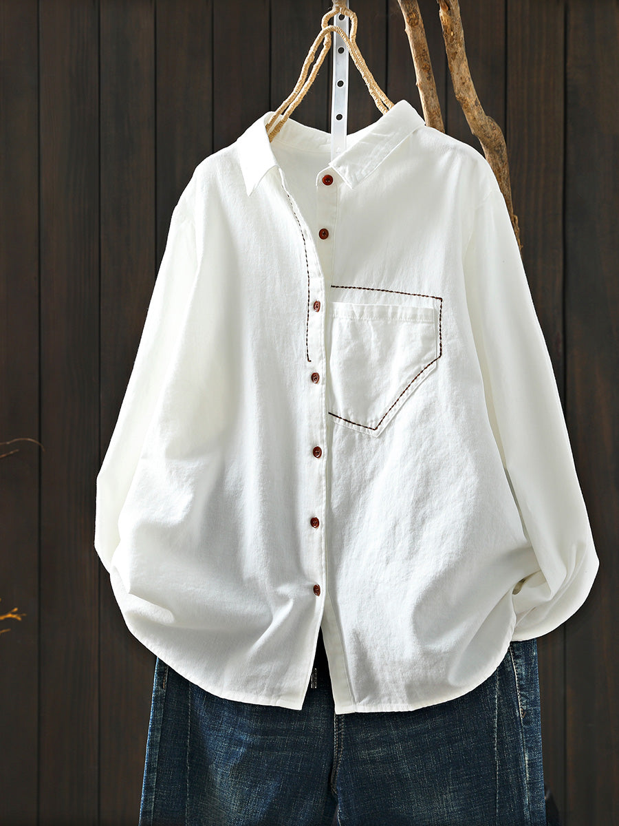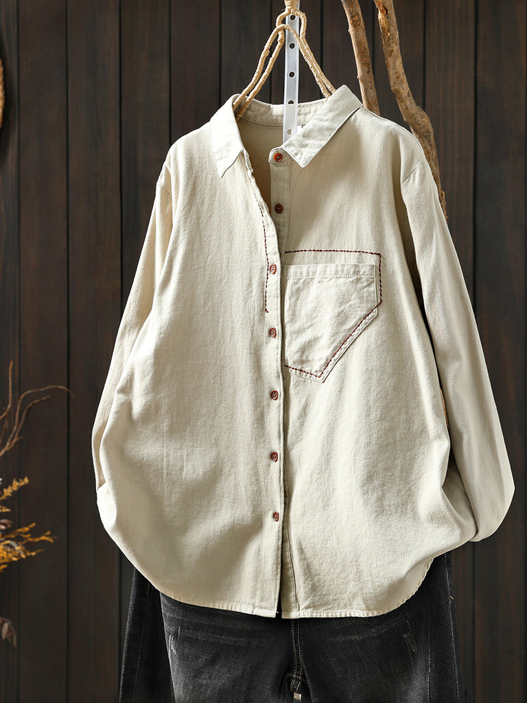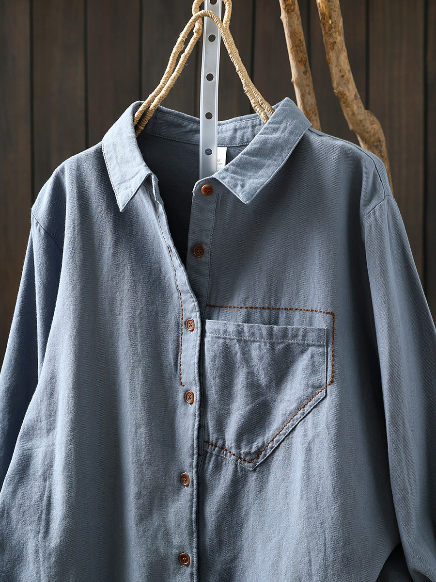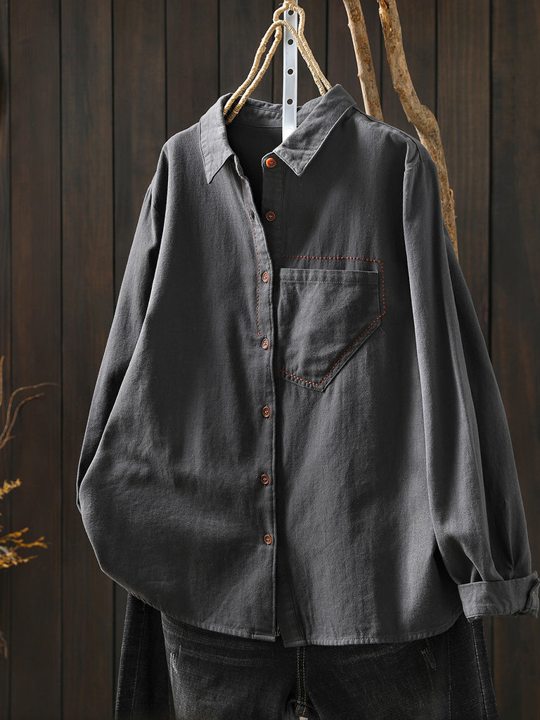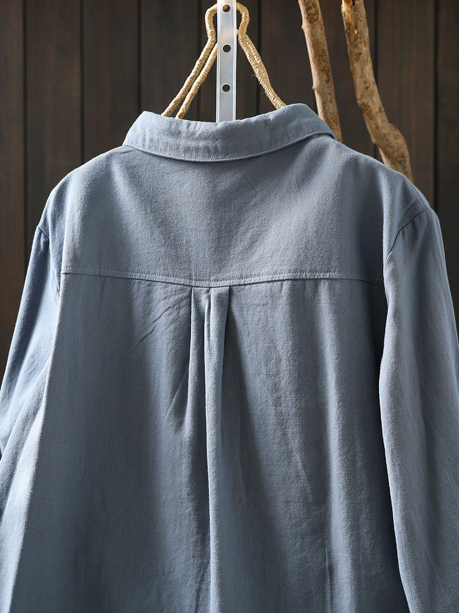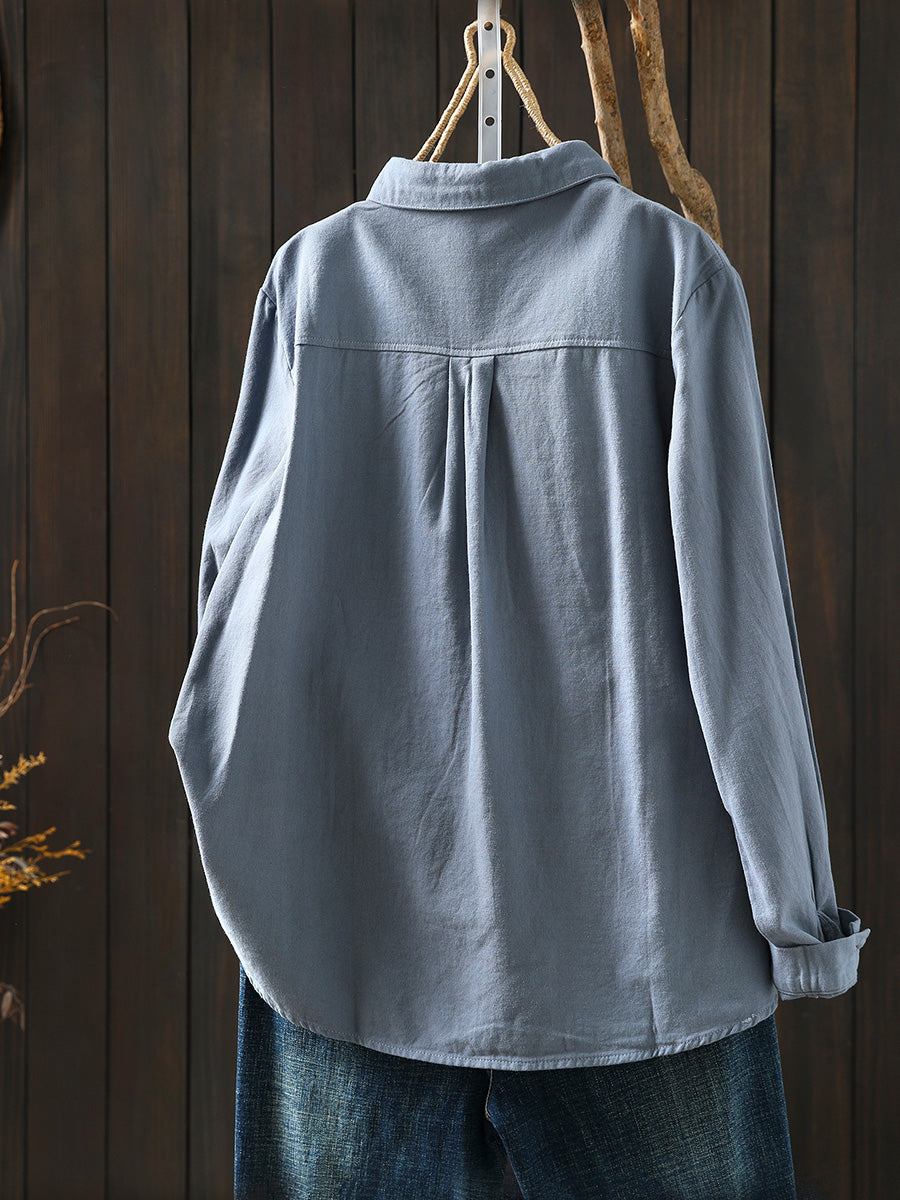 Blusa feminina de inverno com estampa artística em cor lisa e gola dobrável.