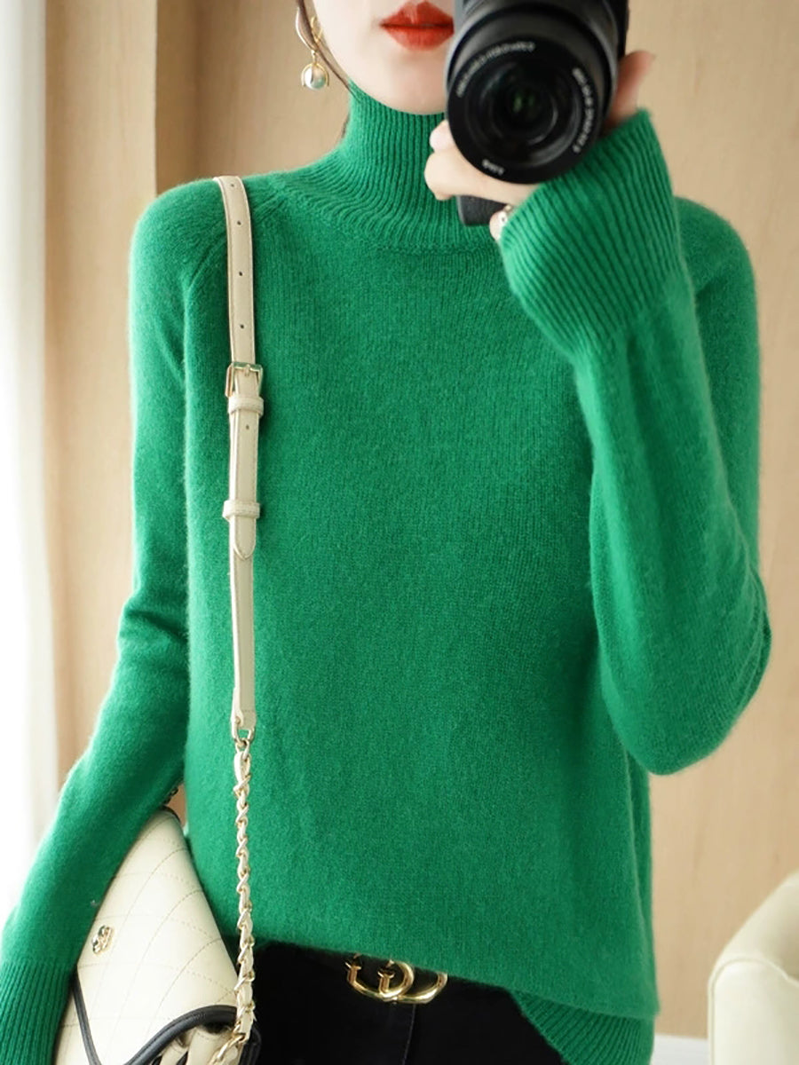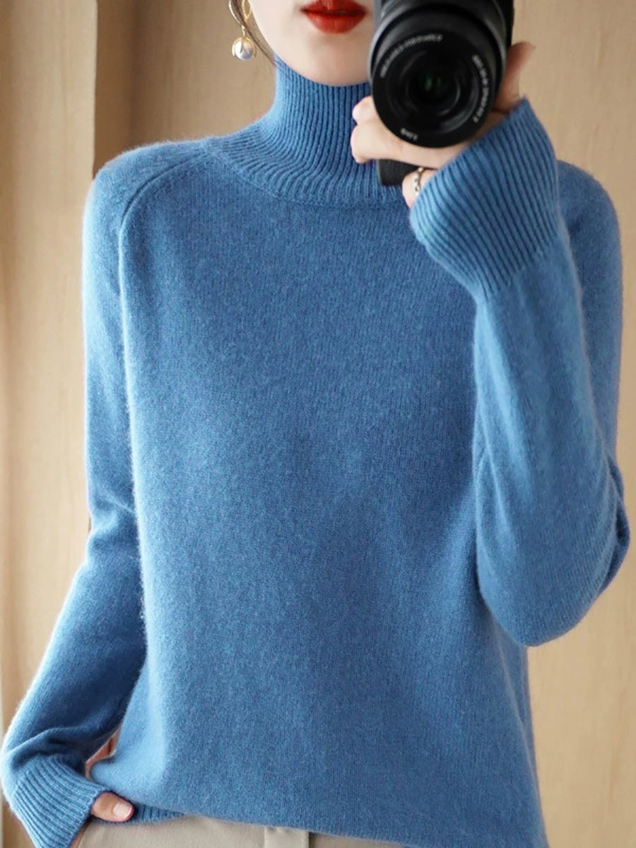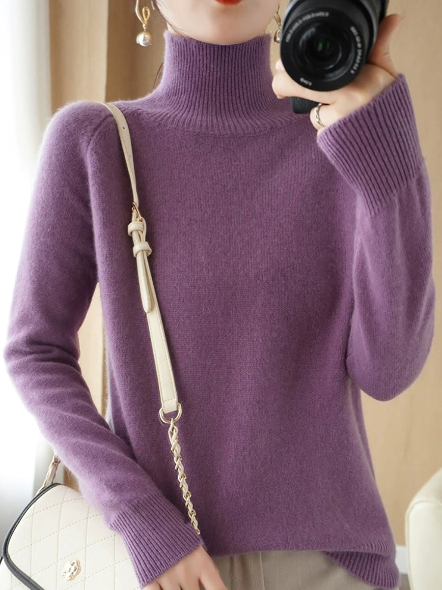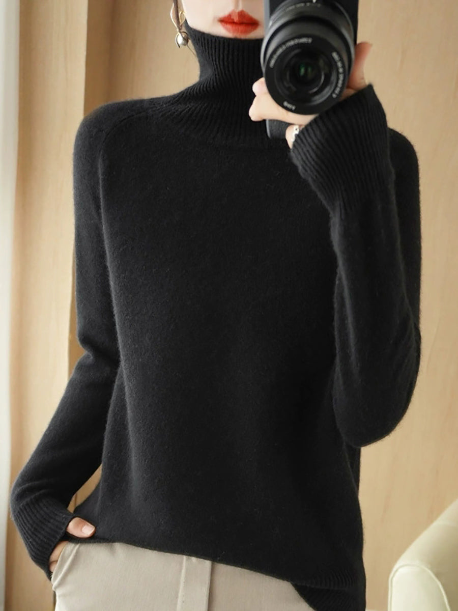 Suéter feminino de gola alta em cores lisas e estilo artístico para o inverno.