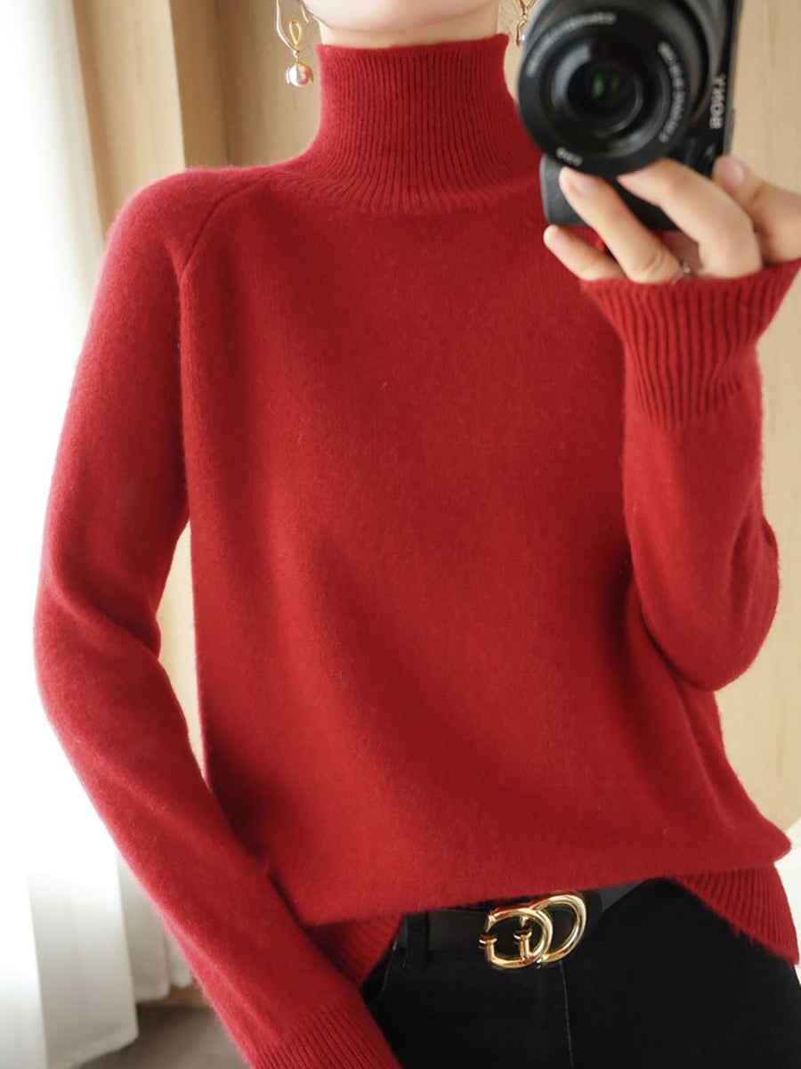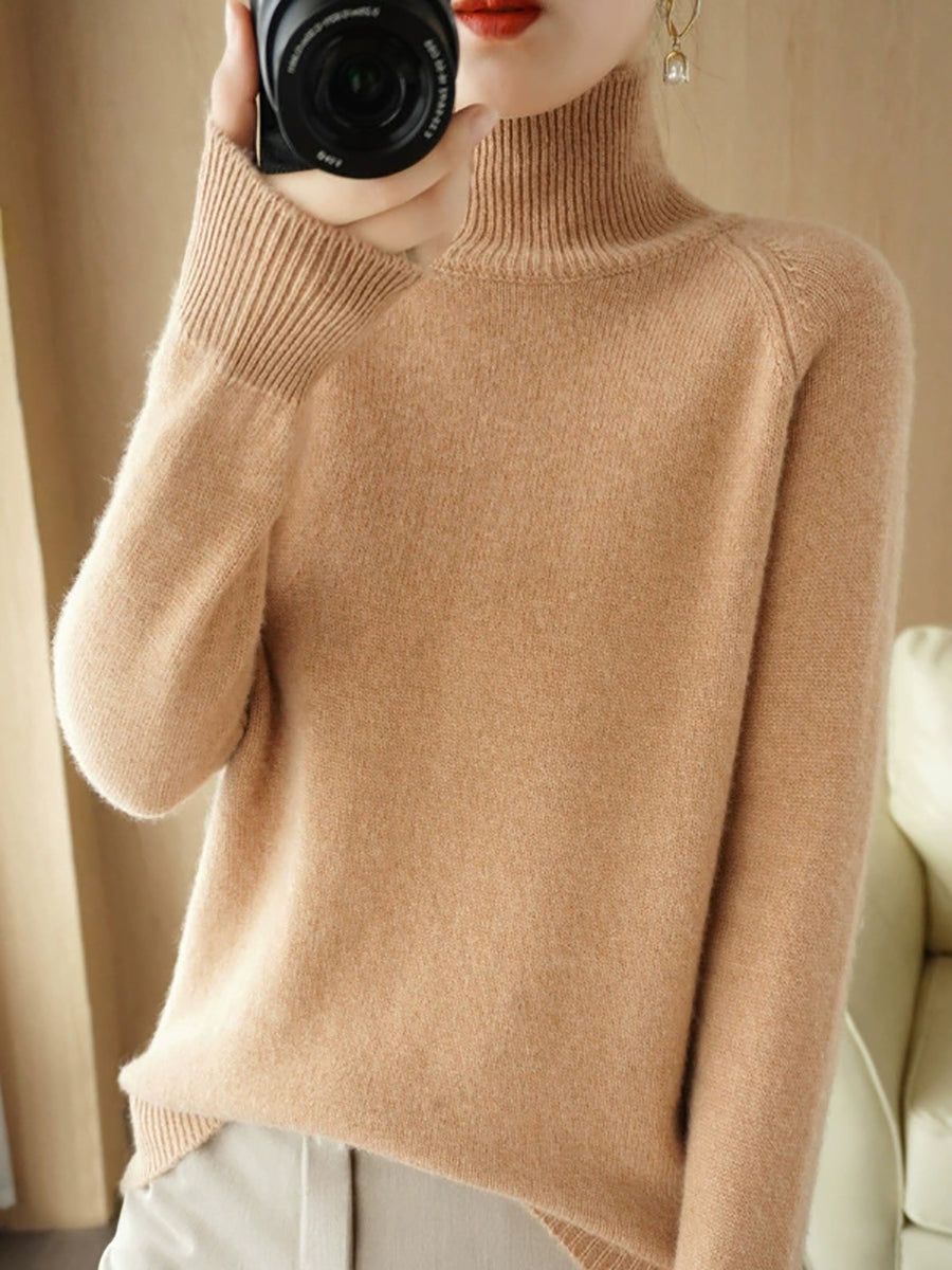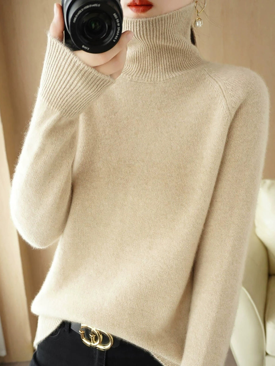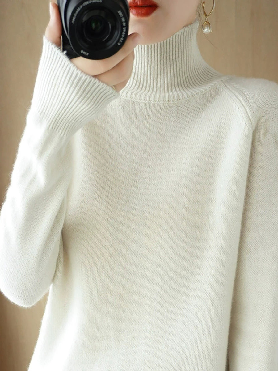 Suéter feminino de gola alta em cores lisas e estilo artístico para o inverno.