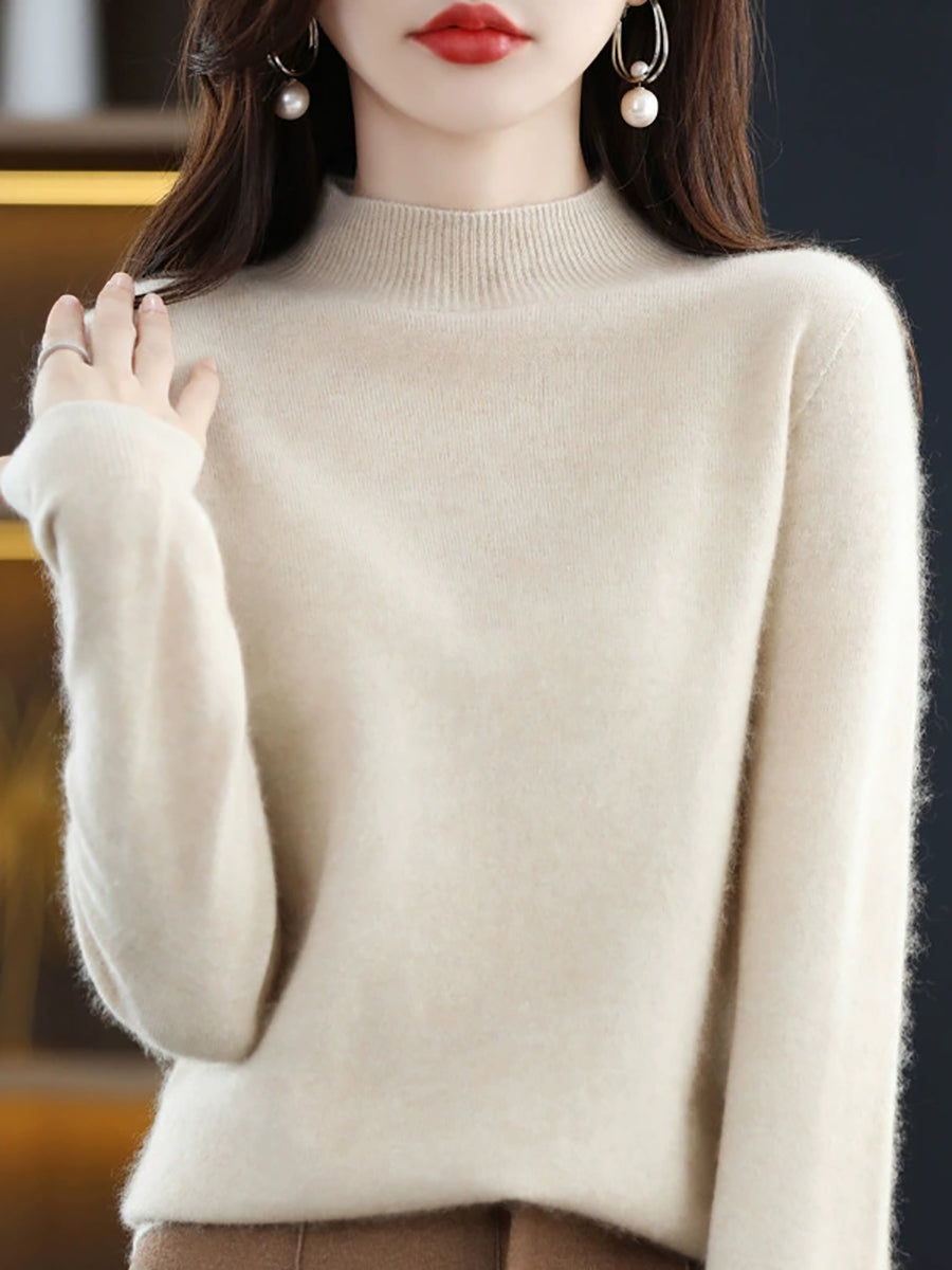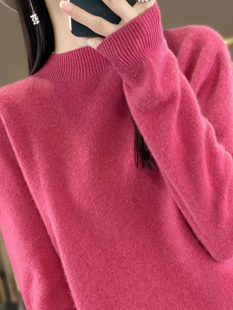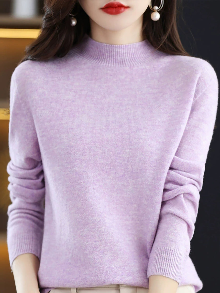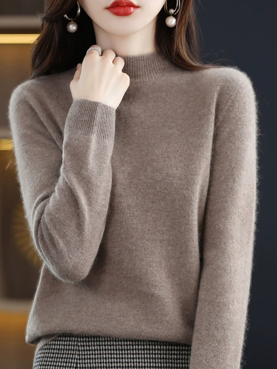 Suéter feminino de inverno com gola alta em lã de cor lisa e estilo artístico.
