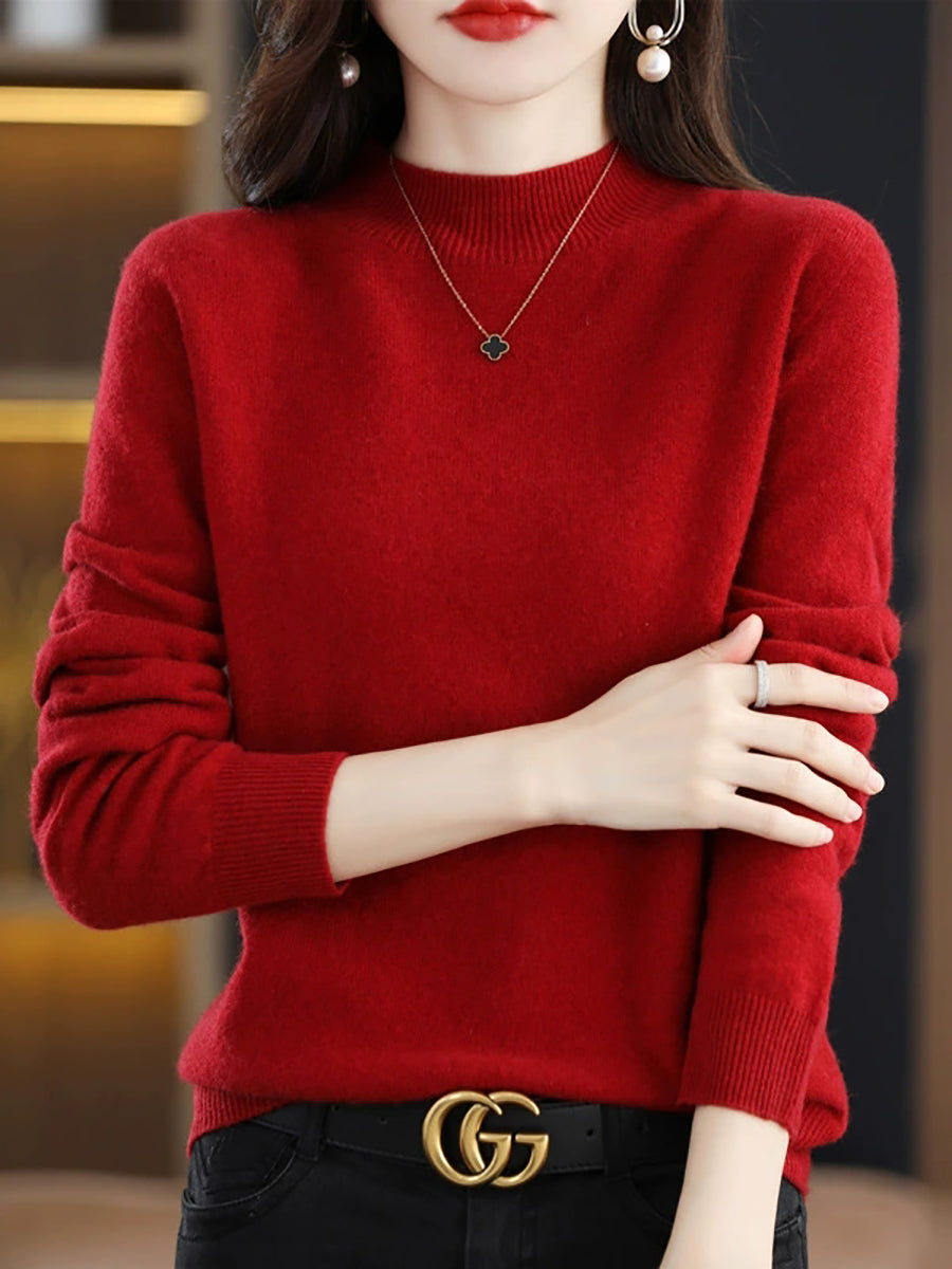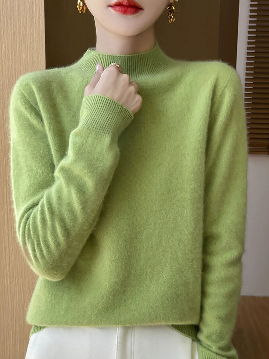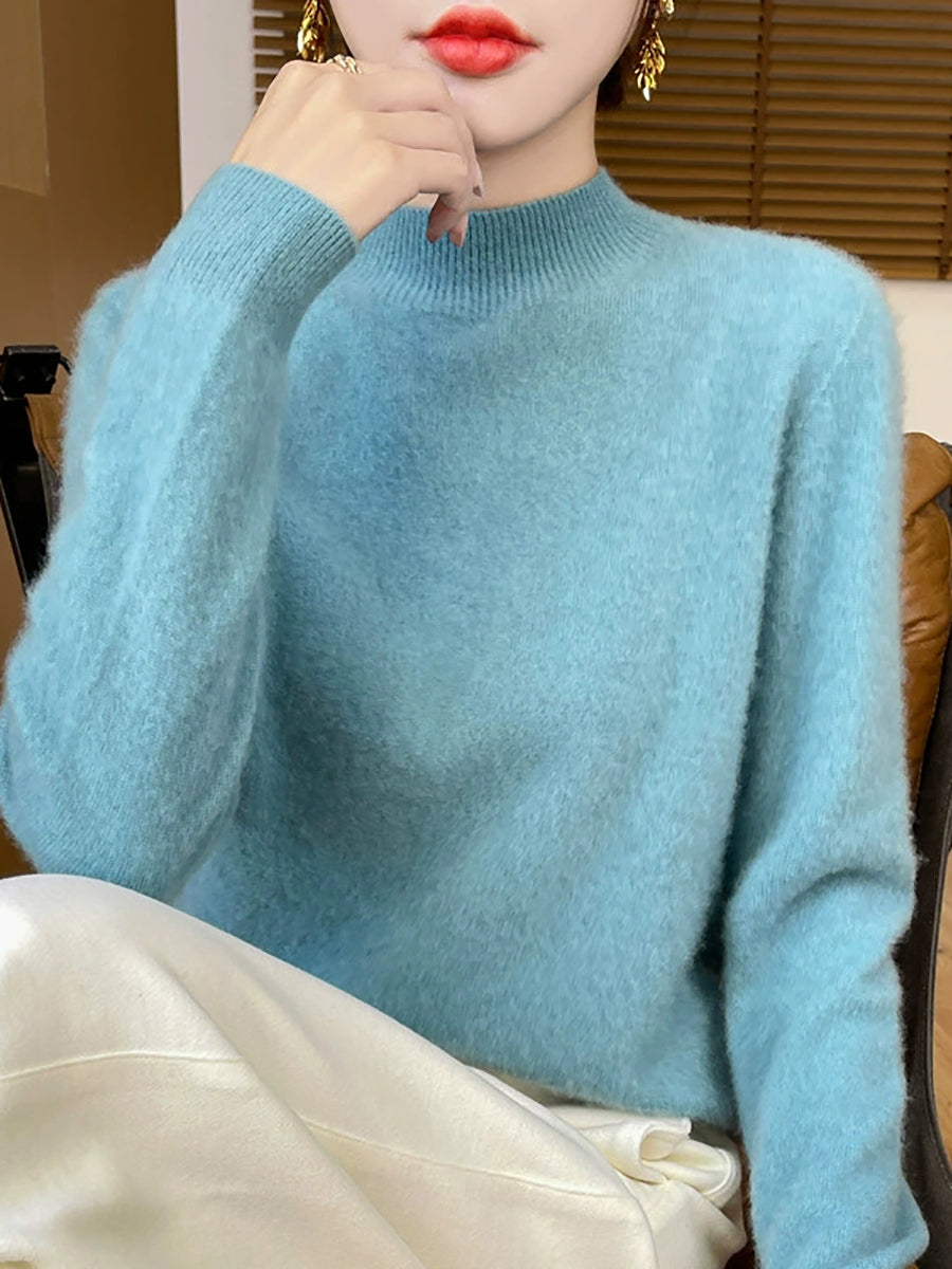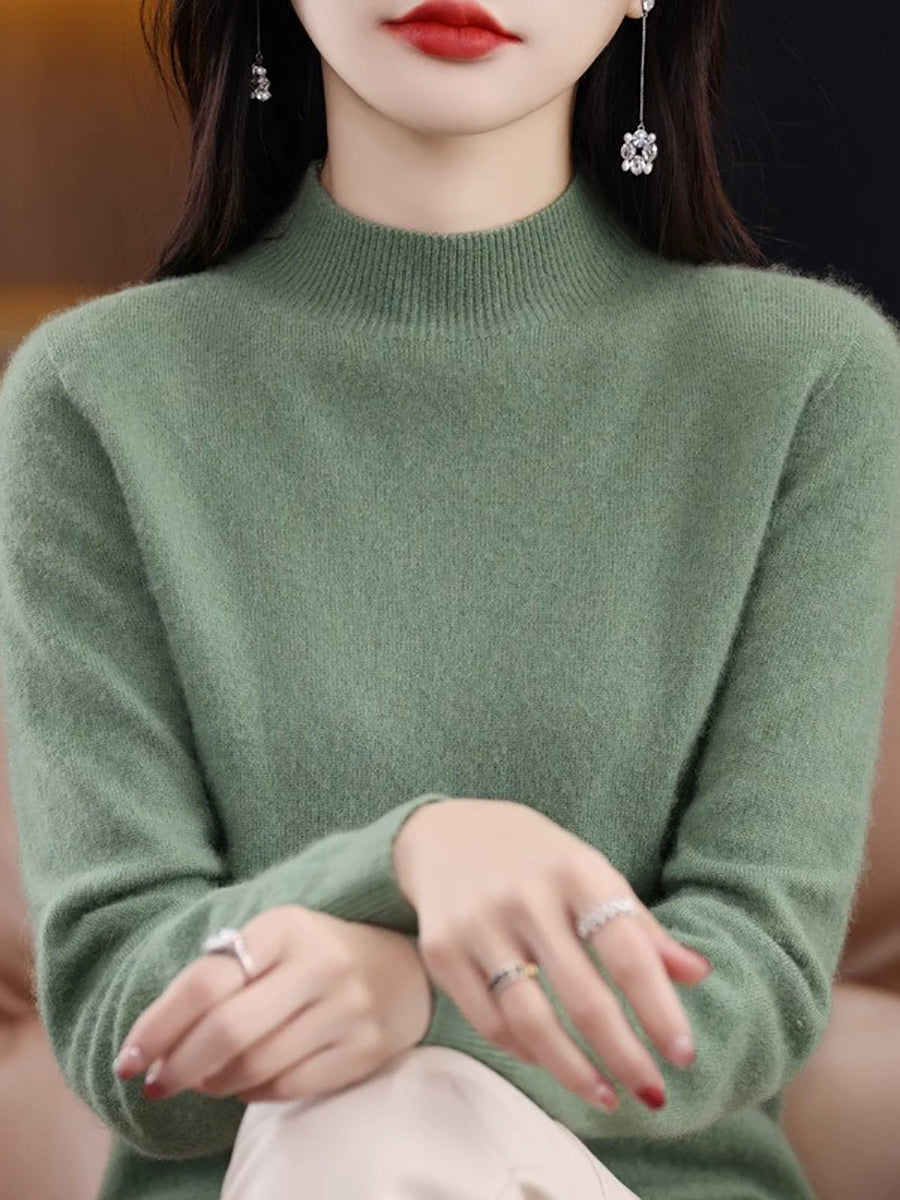 Suéter feminino de inverno com gola alta em lã de cor lisa e estilo artístico.