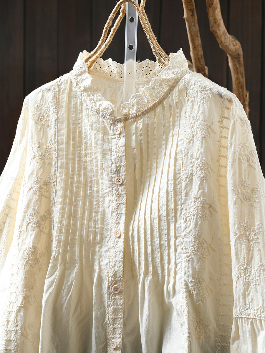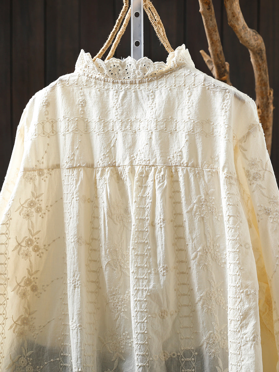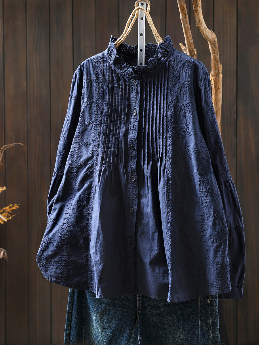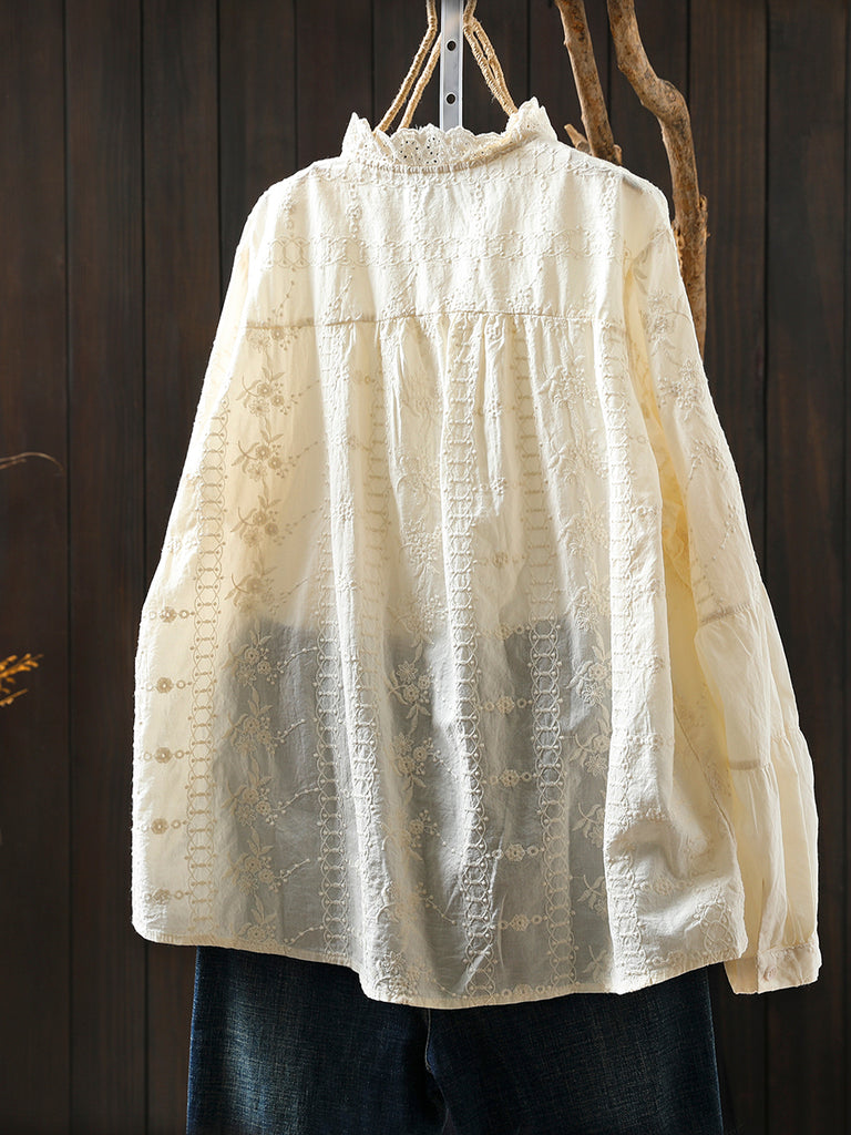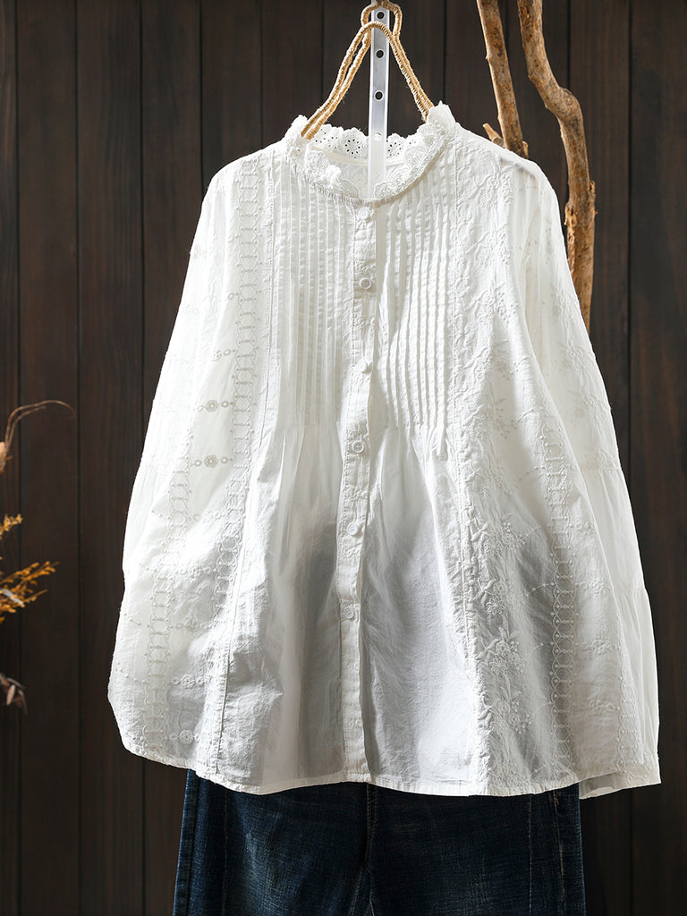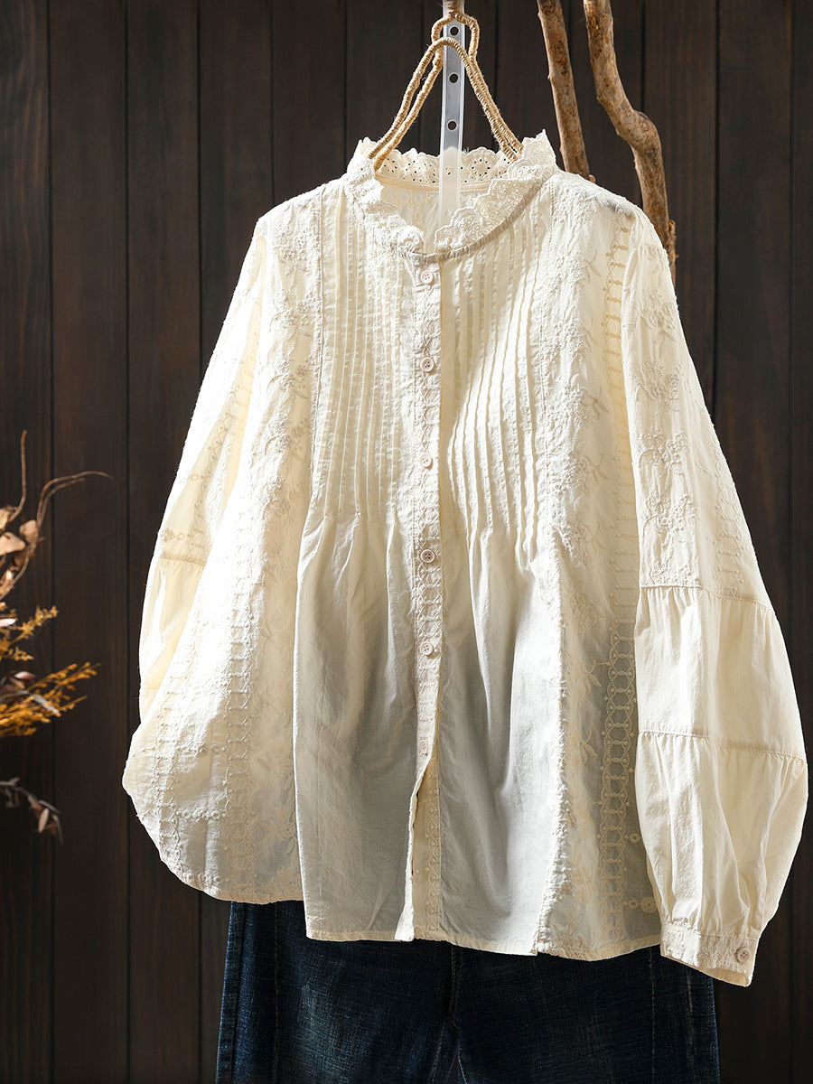 Camisa feminina de inverno com gola alta bordada, estilo artístico, 100% algodão.