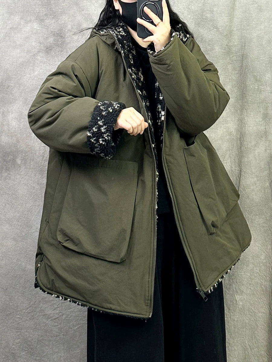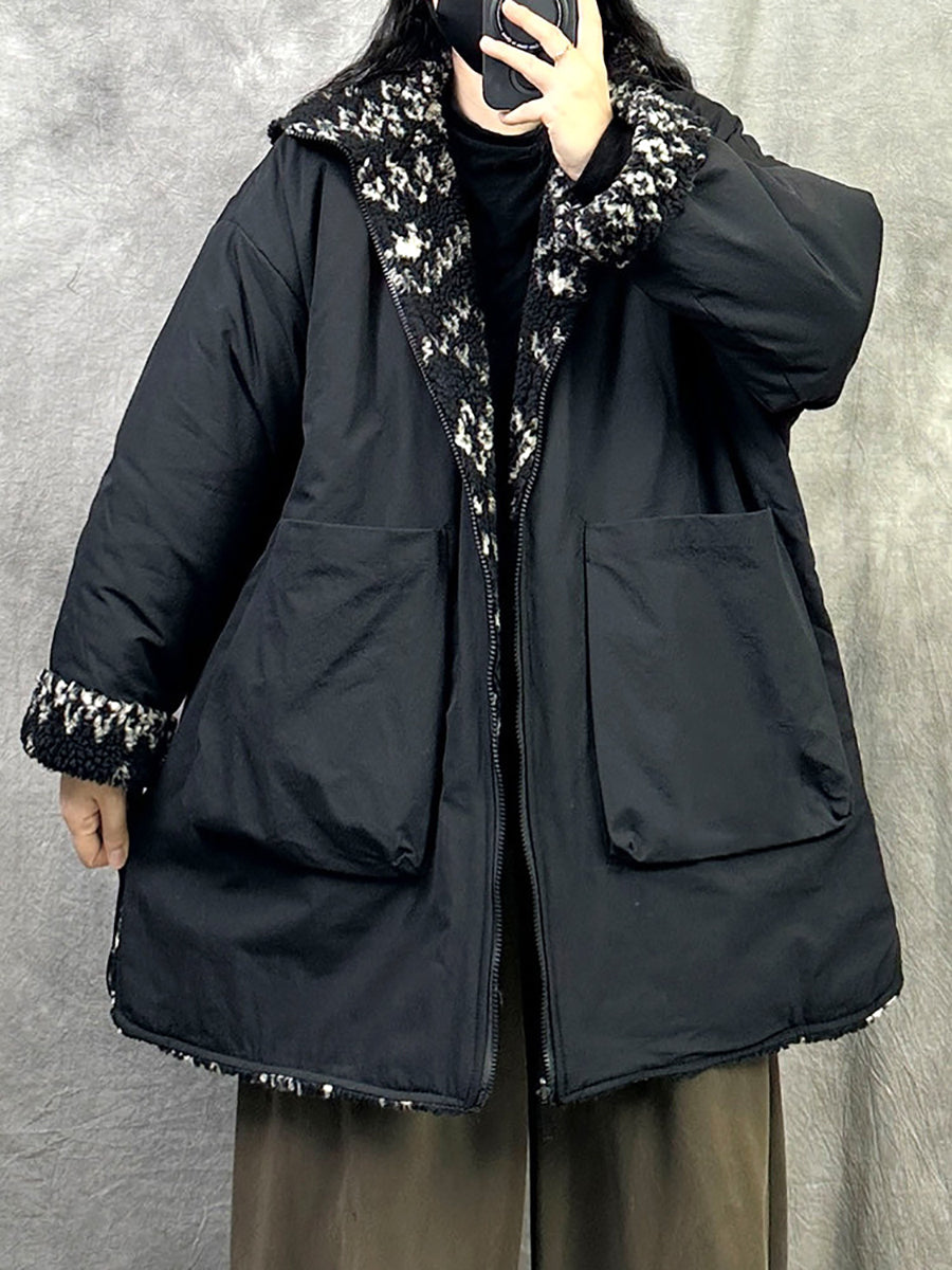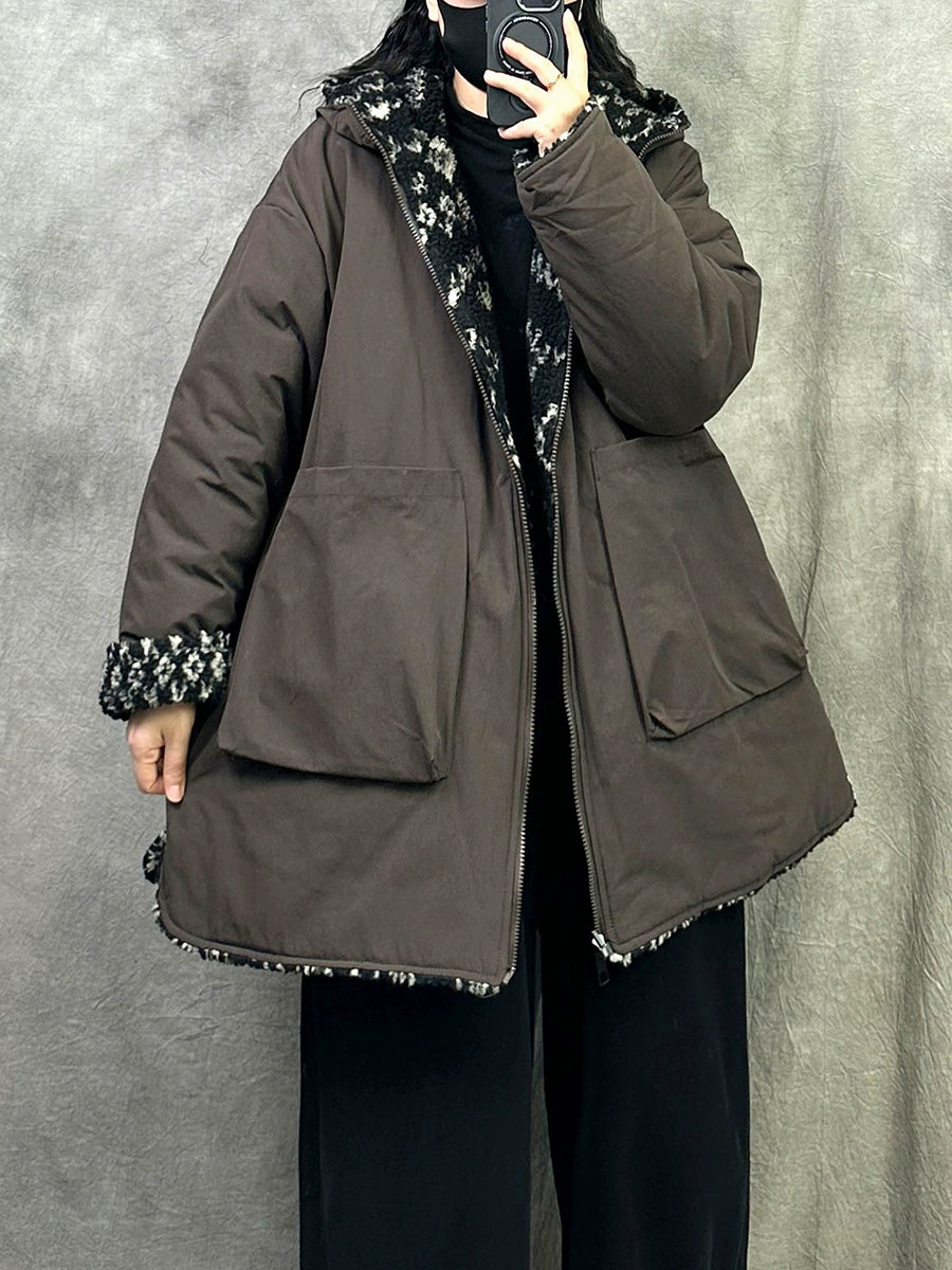 Casaco feminino de inverno casual em fleece com capuz que pode ser usado dos dois lados.