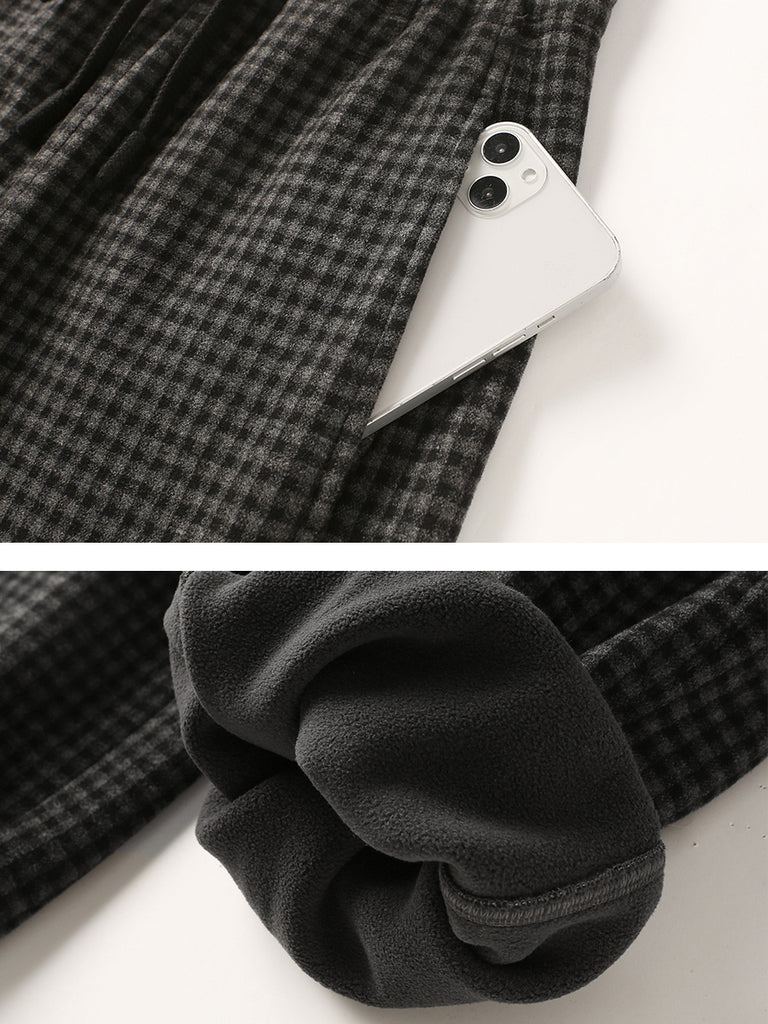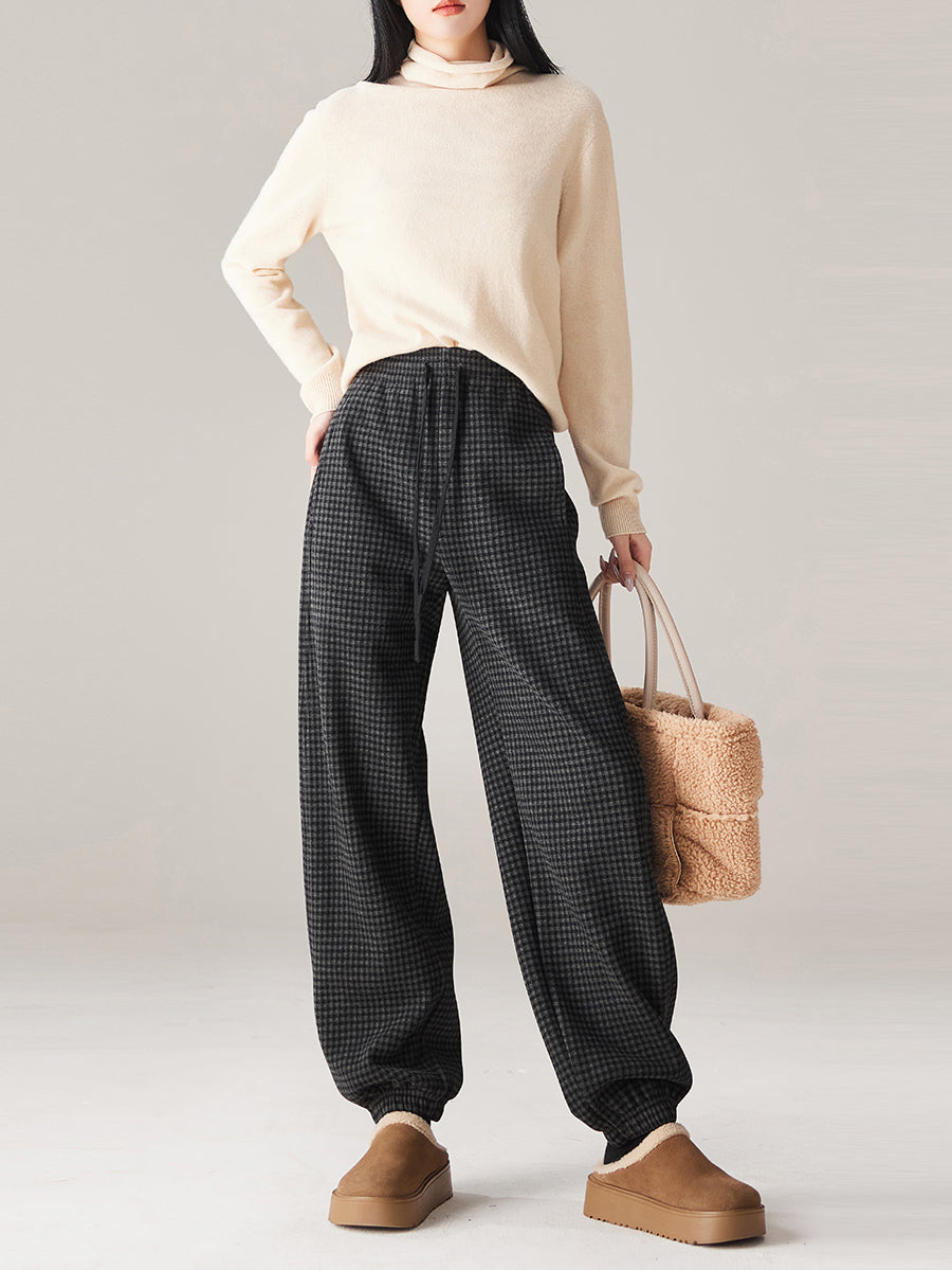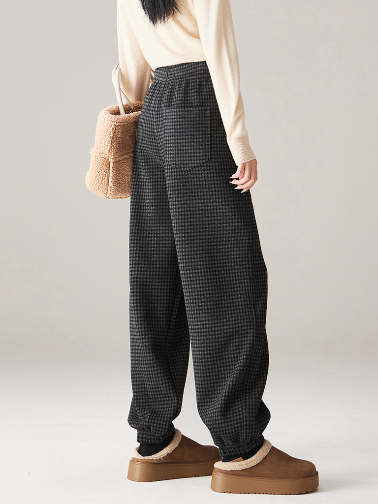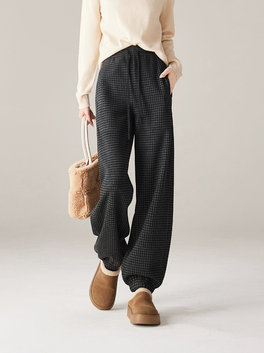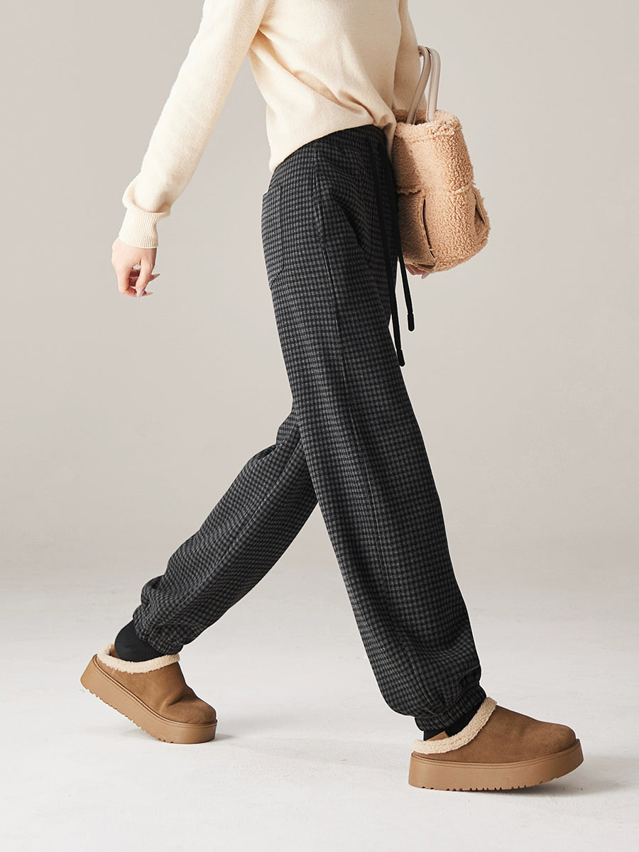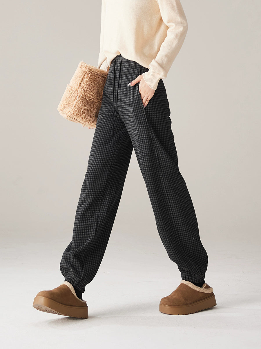 Calça feminina de inverno casual xadrez com forro de lã e modelagem justa.
