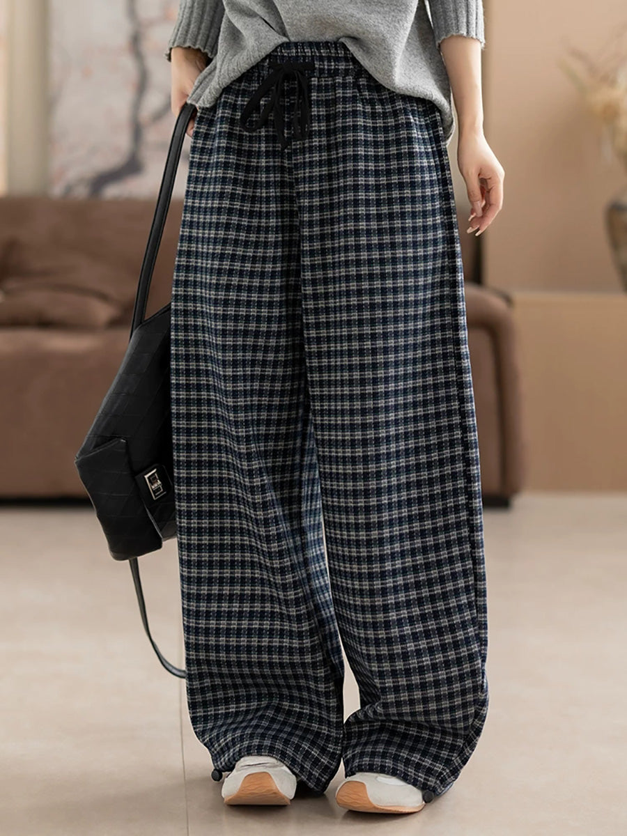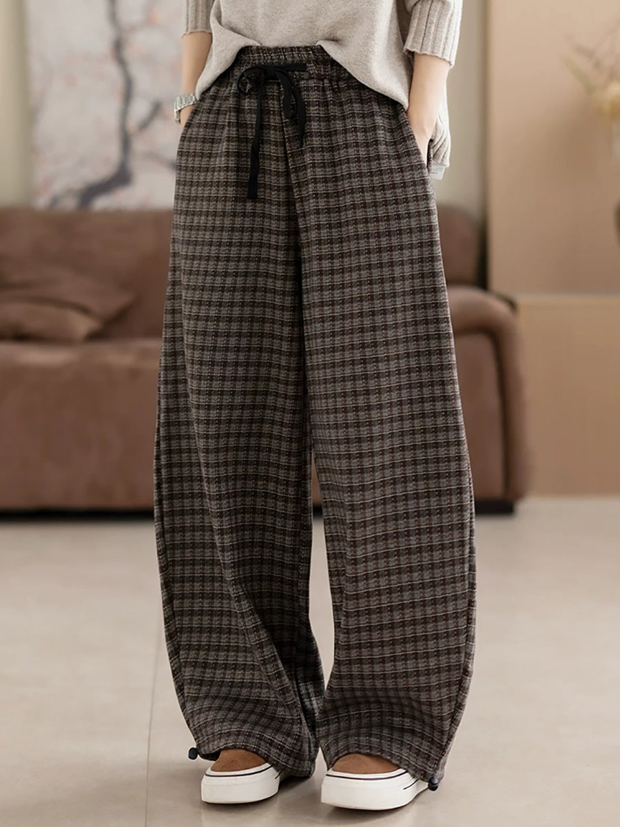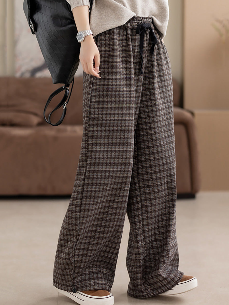 Calça feminina de inverno casual xadrez com forro de lã e pernas largas