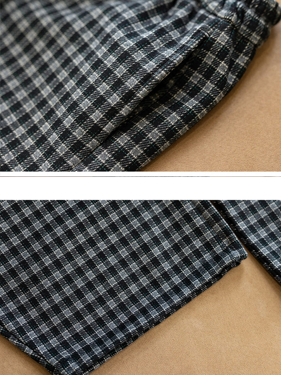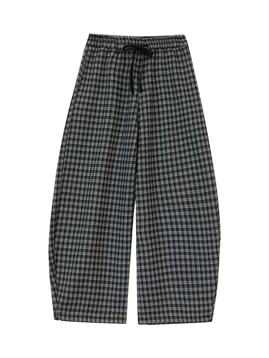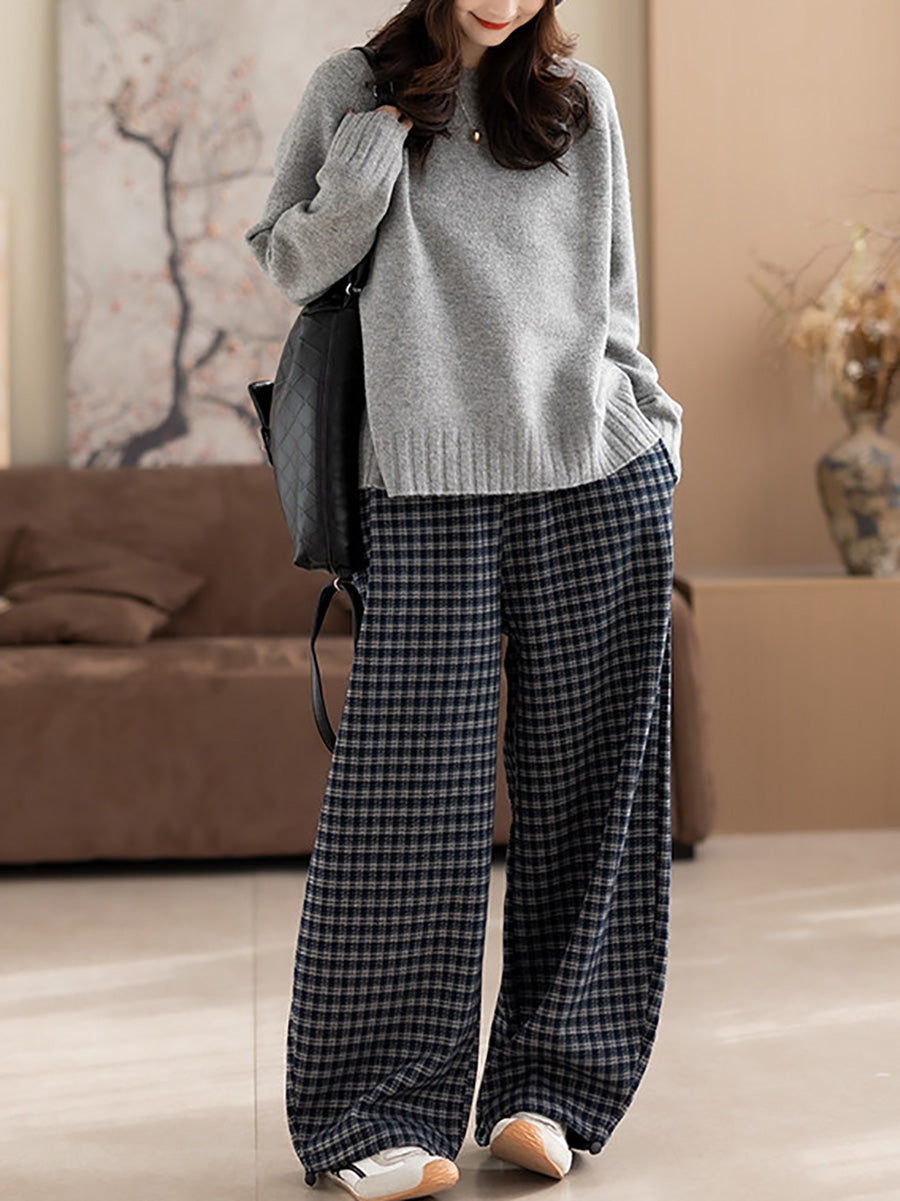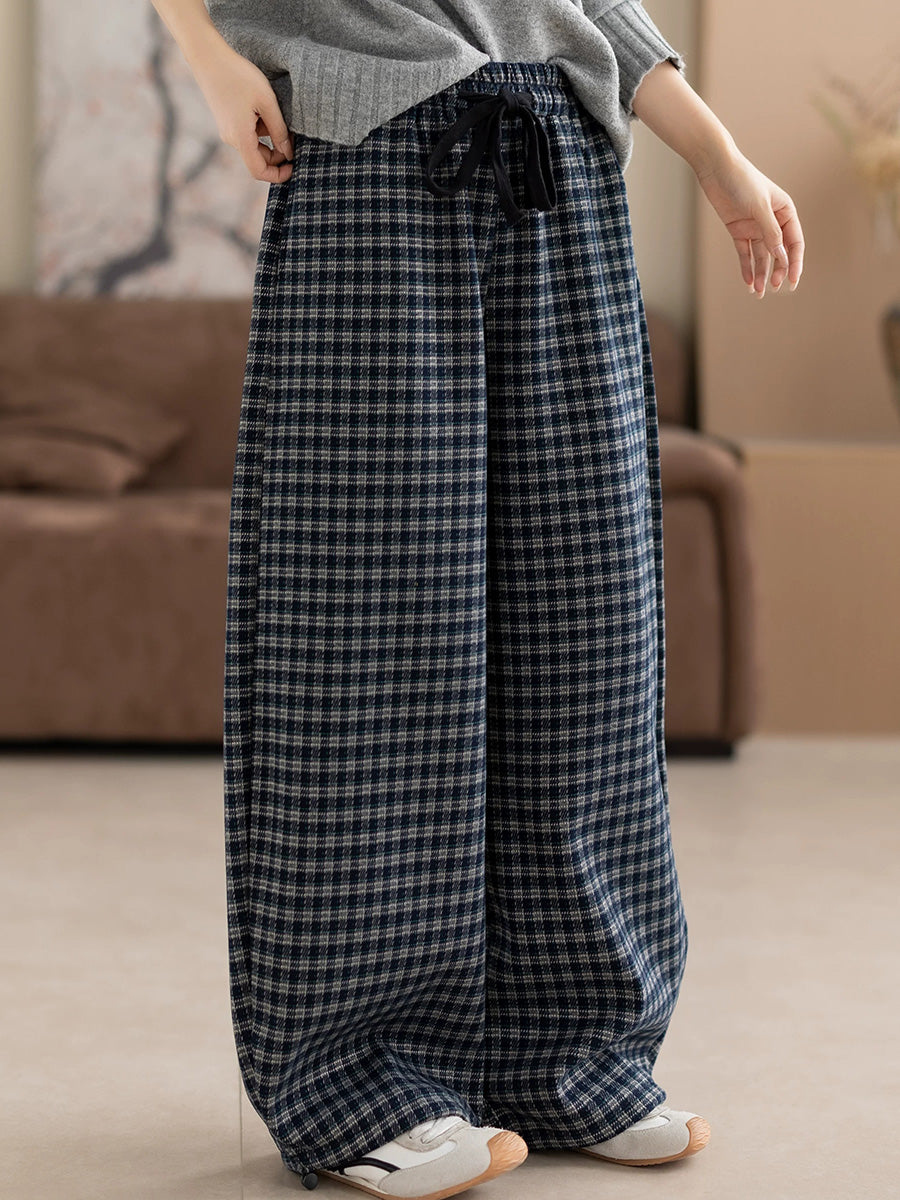 Calça feminina de inverno casual xadrez com forro de lã e pernas largas