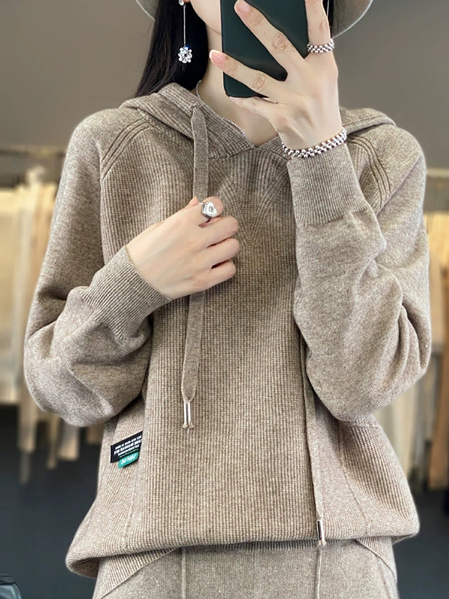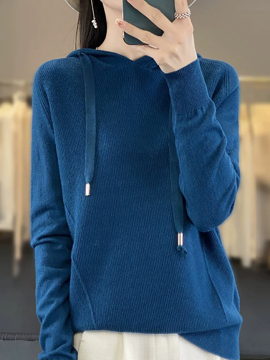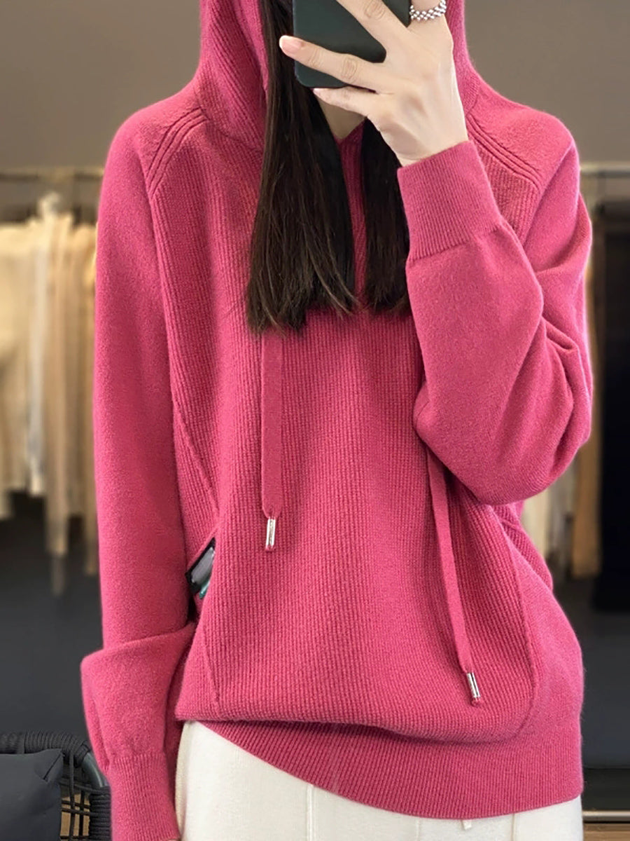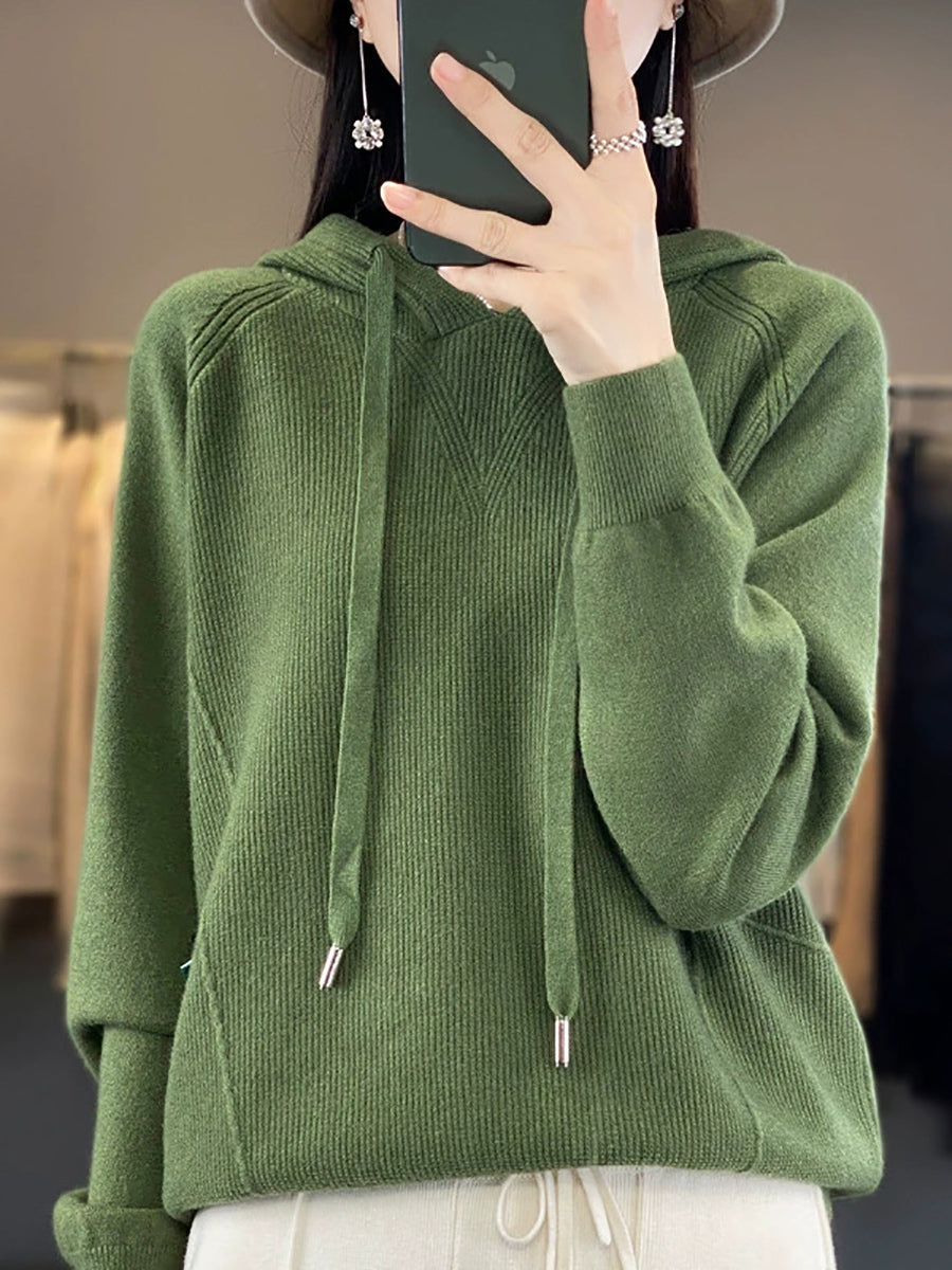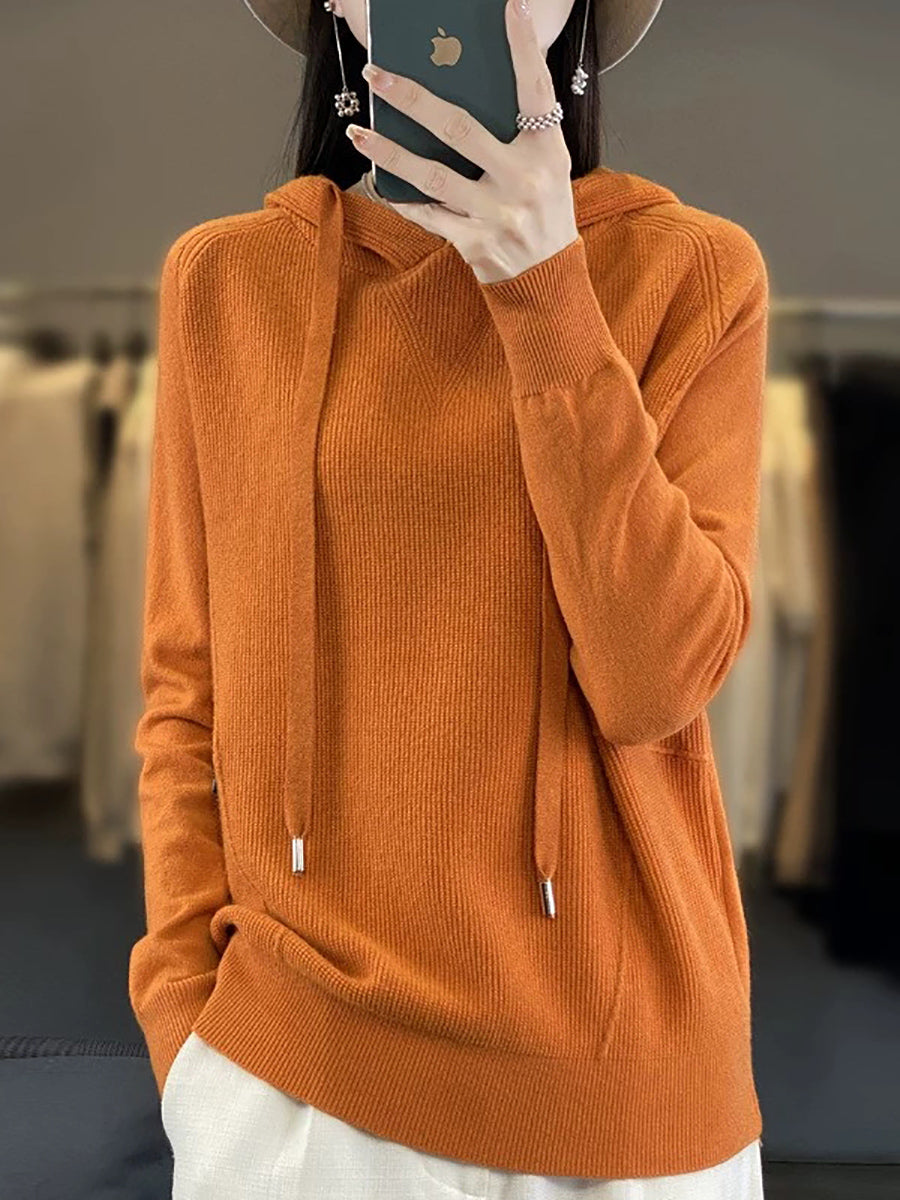 Moletom feminino casual de inverno em tricô de cor lisa com capuz