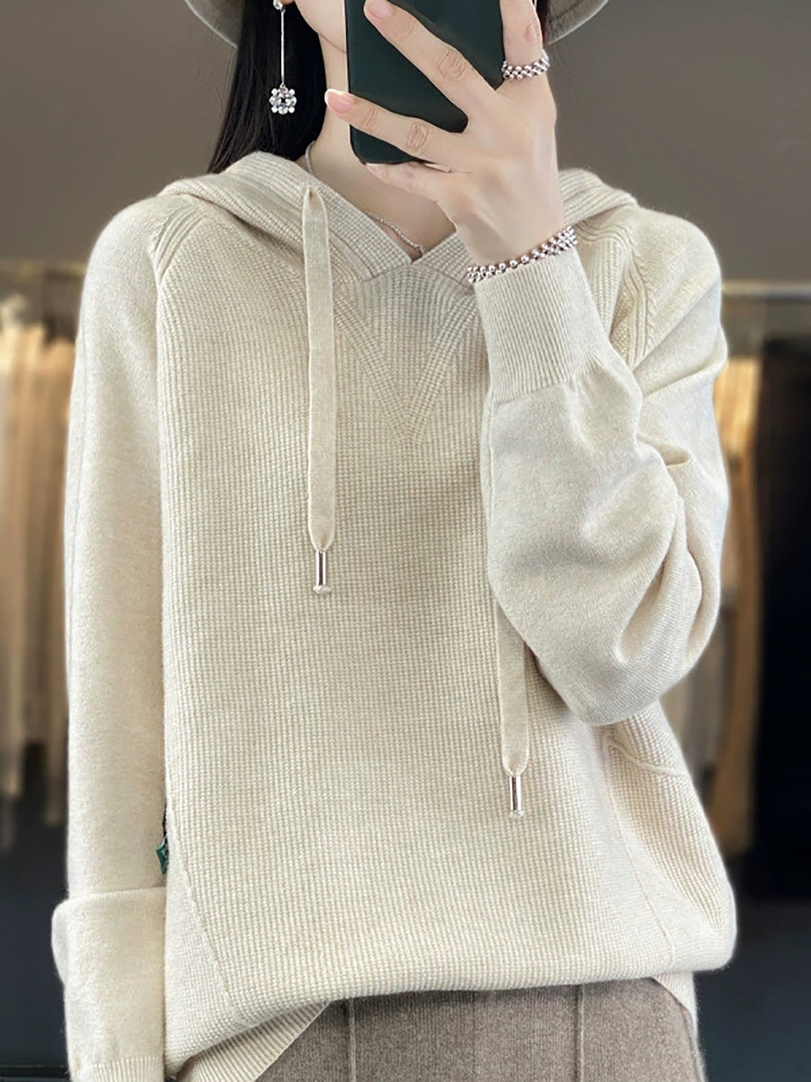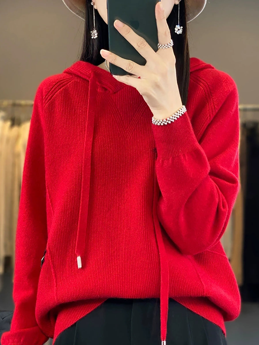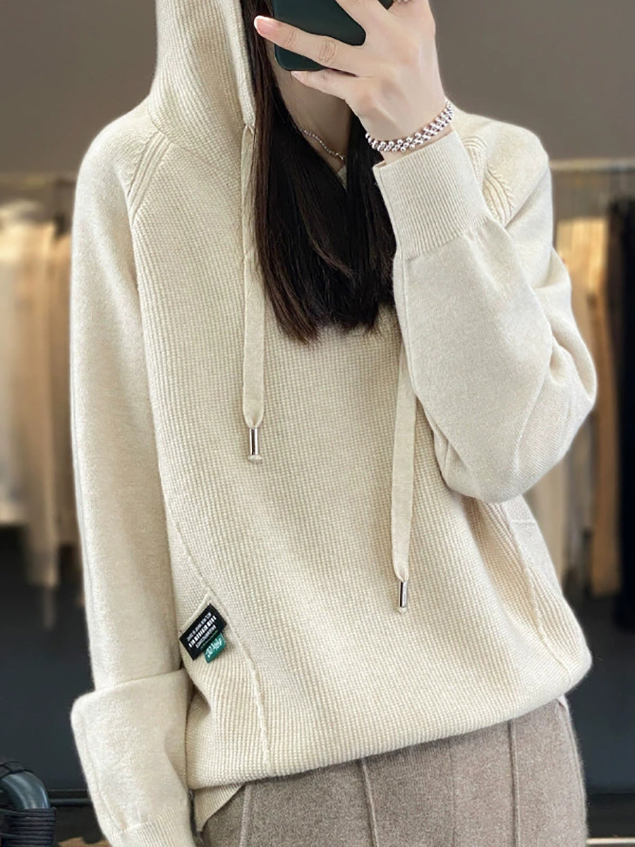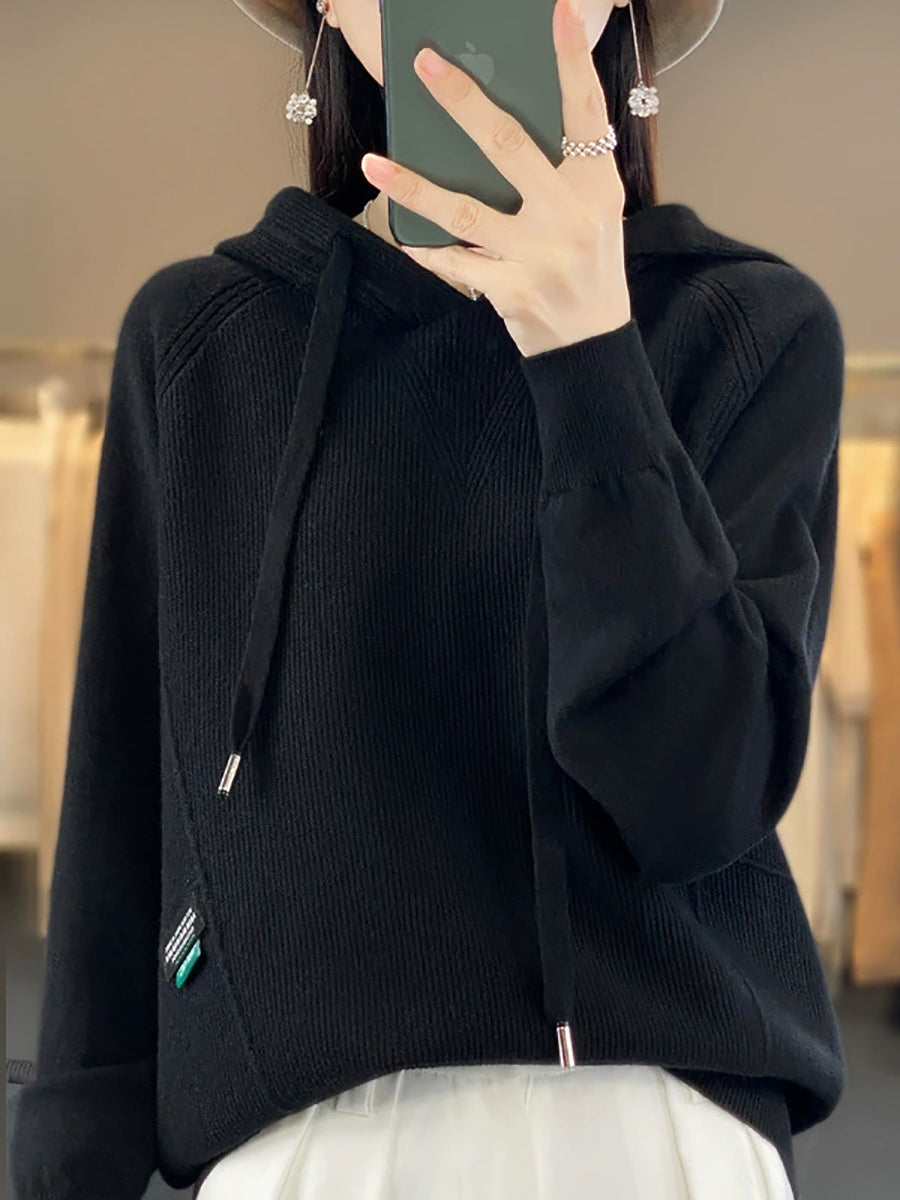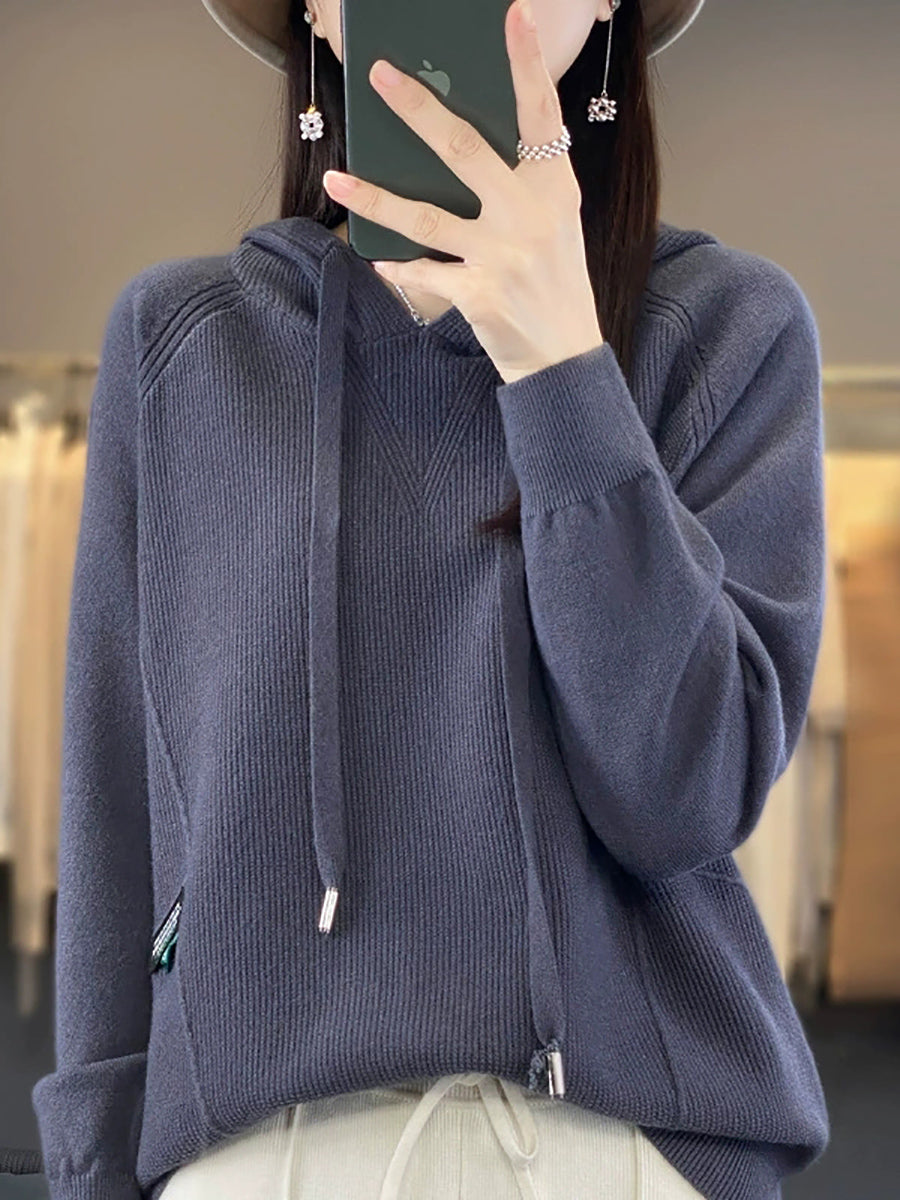 Moletom feminino casual de inverno em tricô de cor lisa com capuz