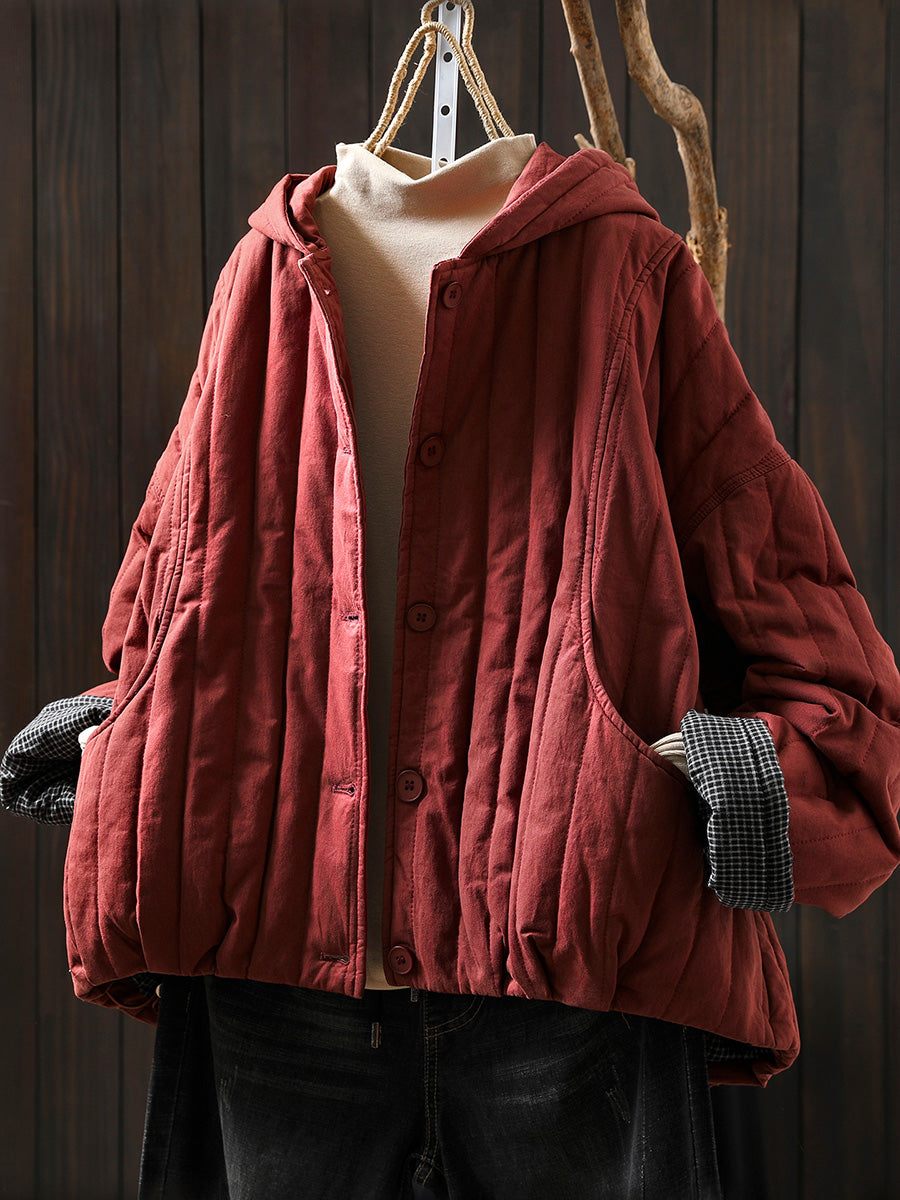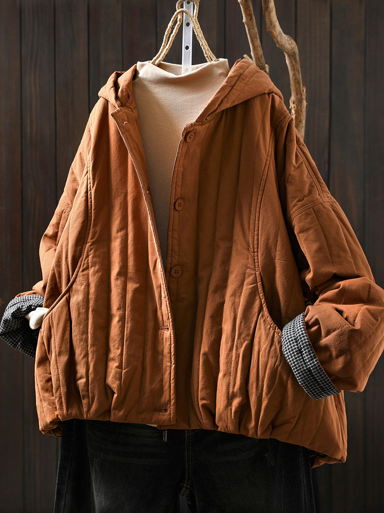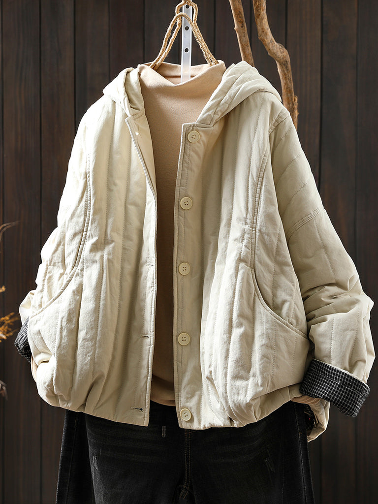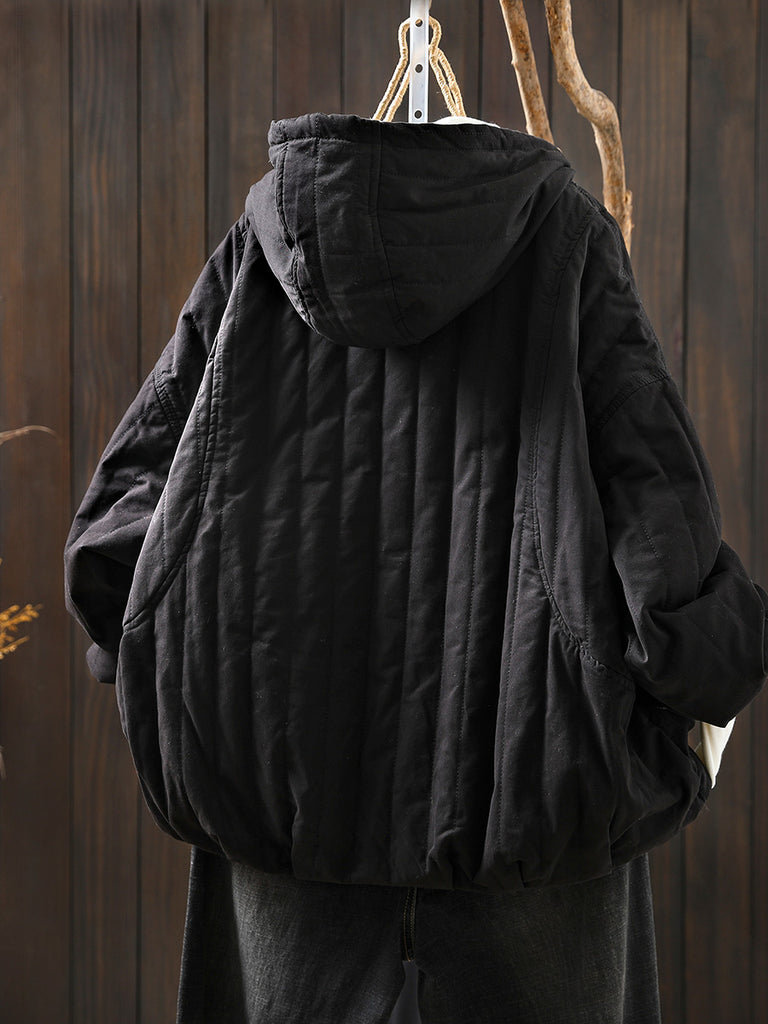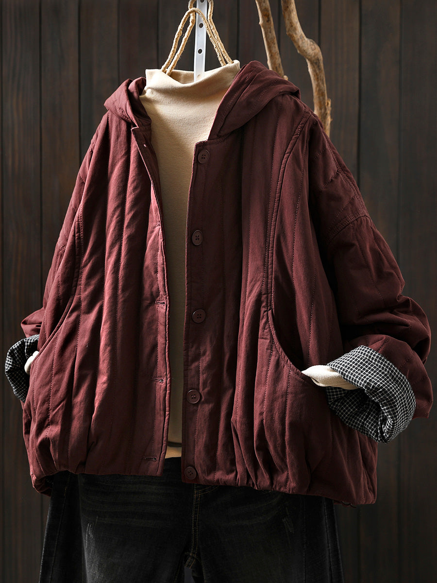 Casaco feminino de inverno casual com capuz e acolchoado em cor lisa.