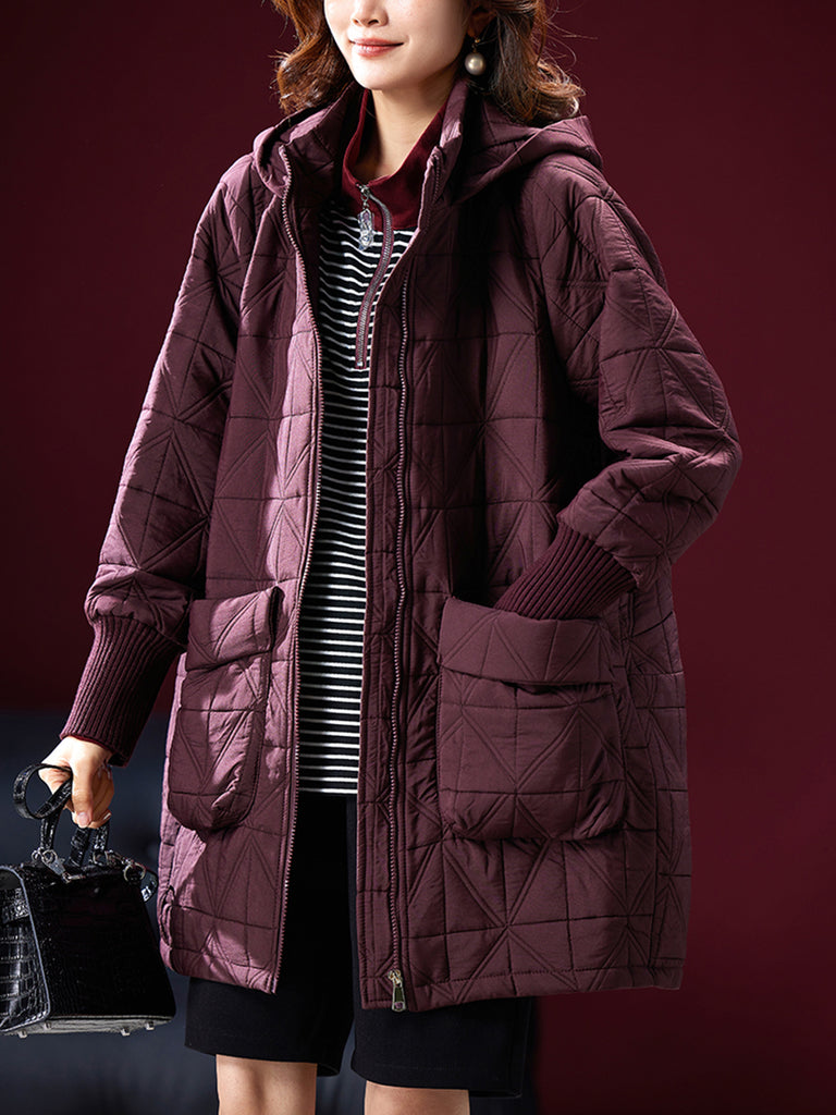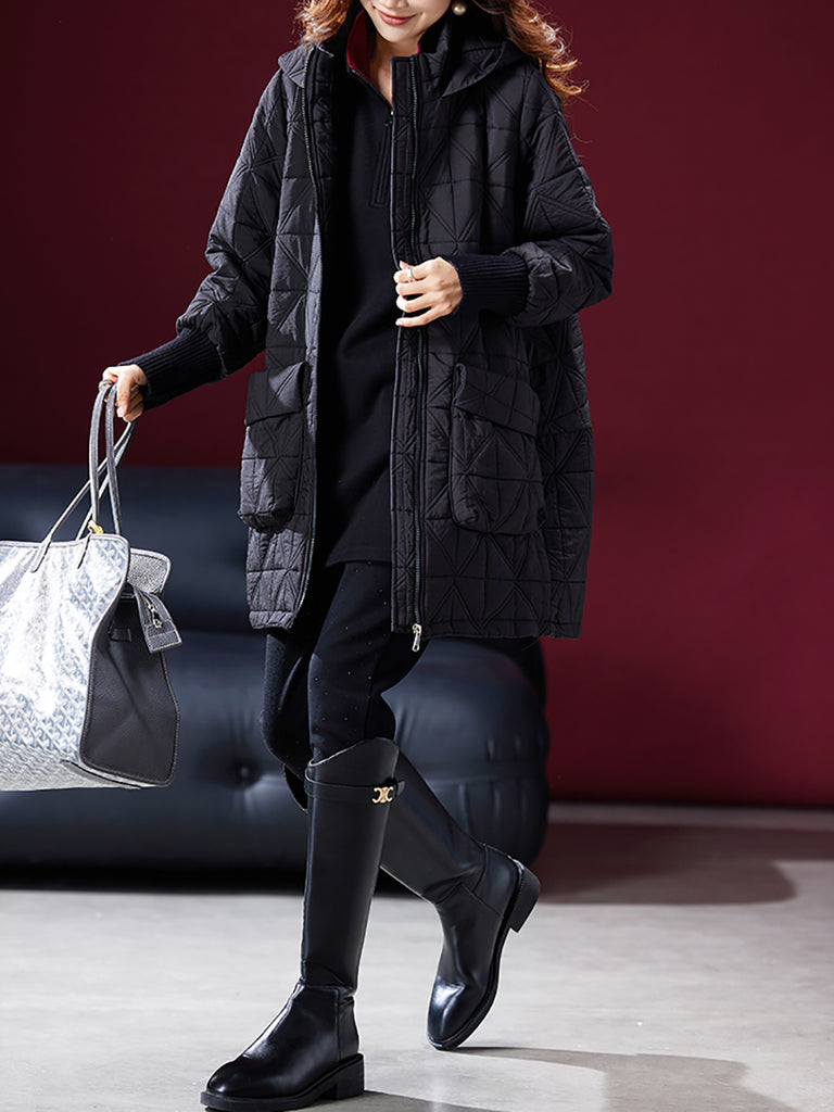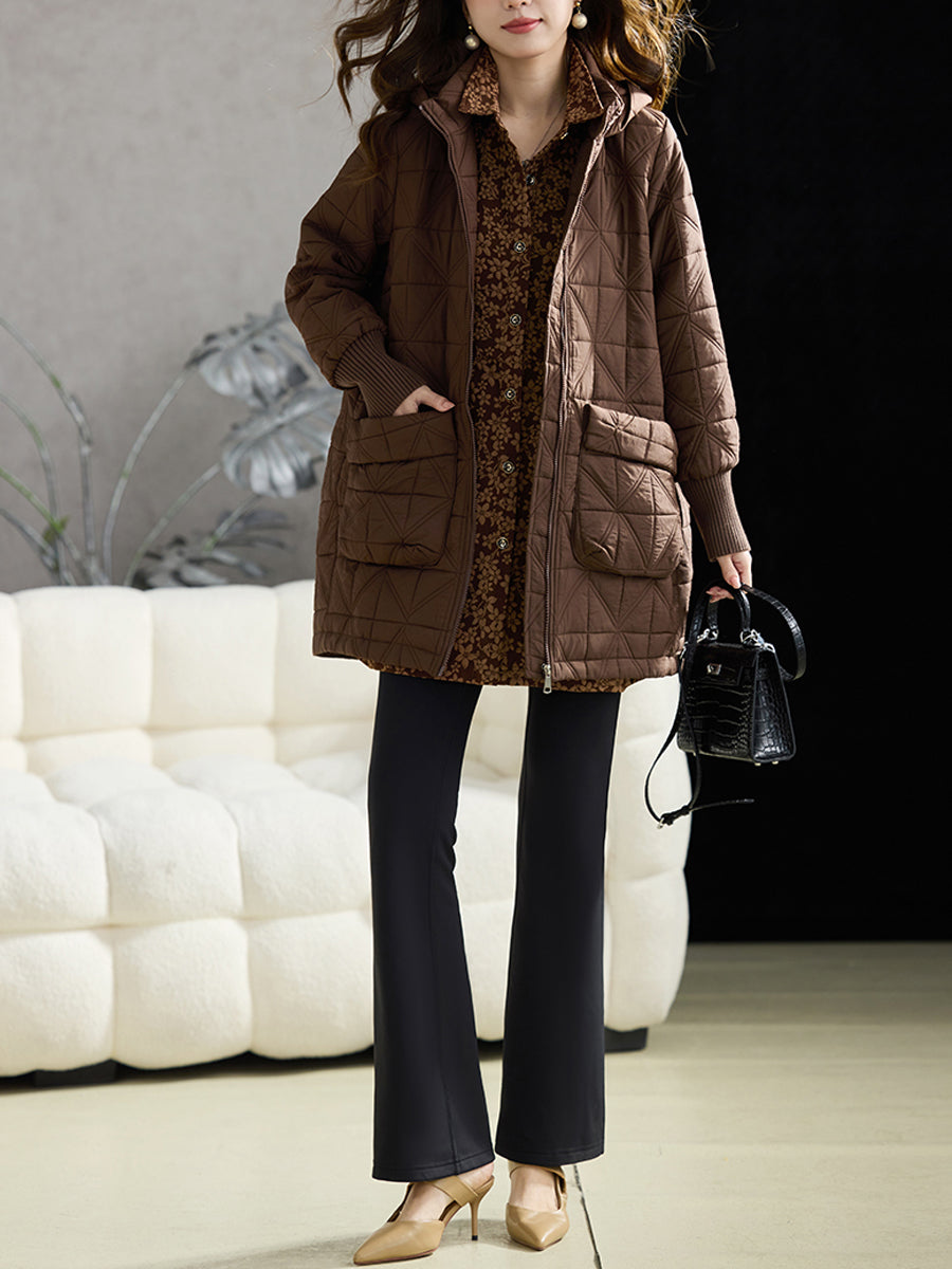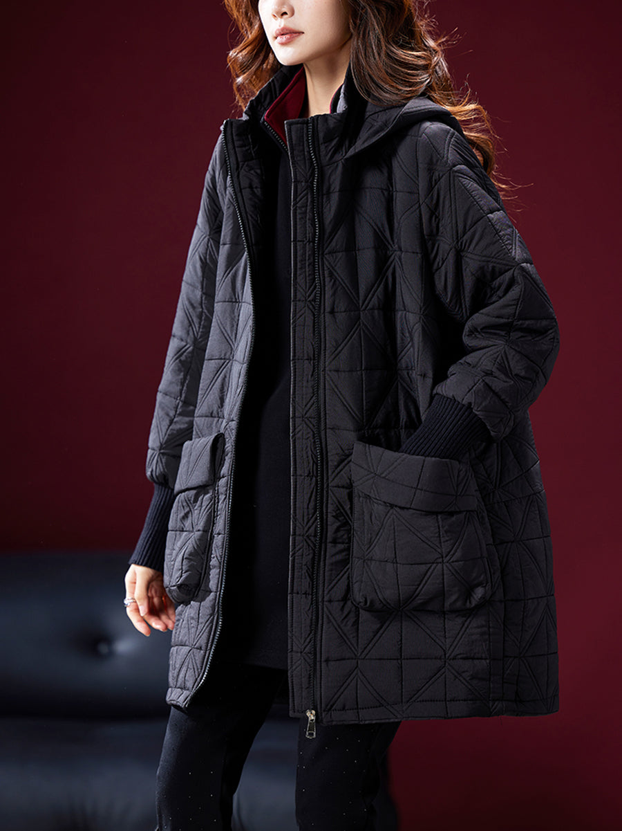 Casaco feminino casual de inverno com capuz acolchoado e estampa de losangos em cor lisa.
