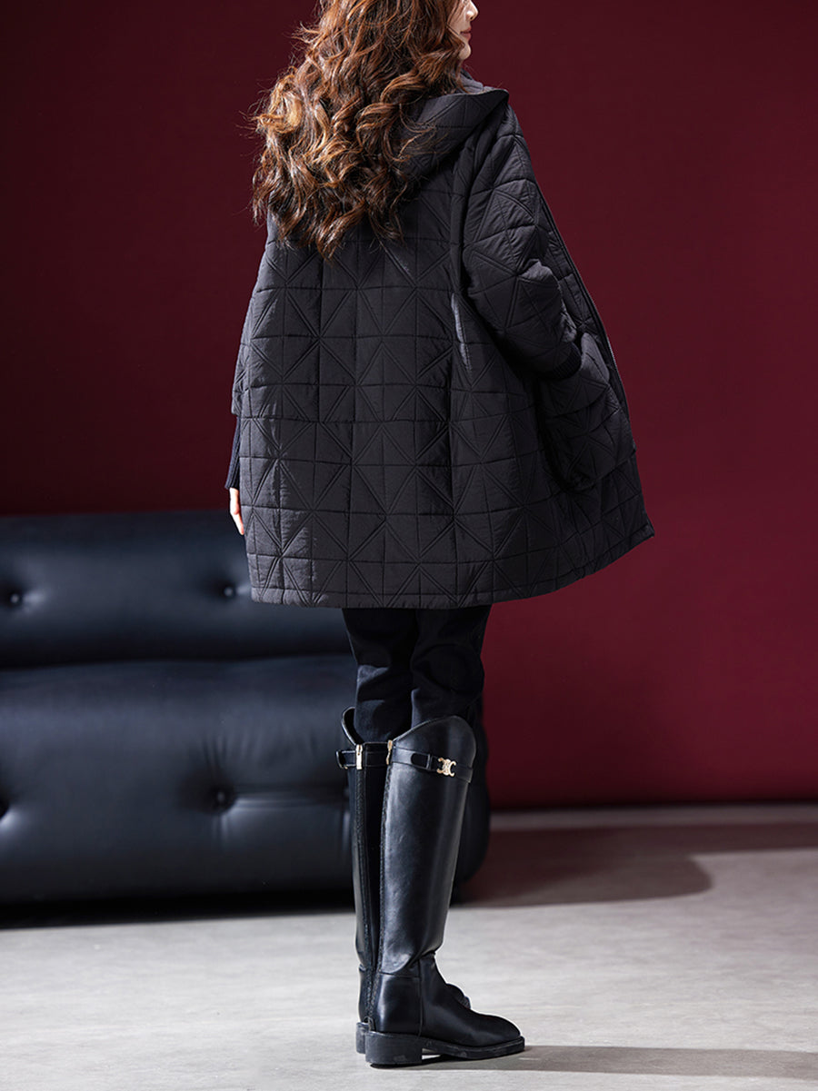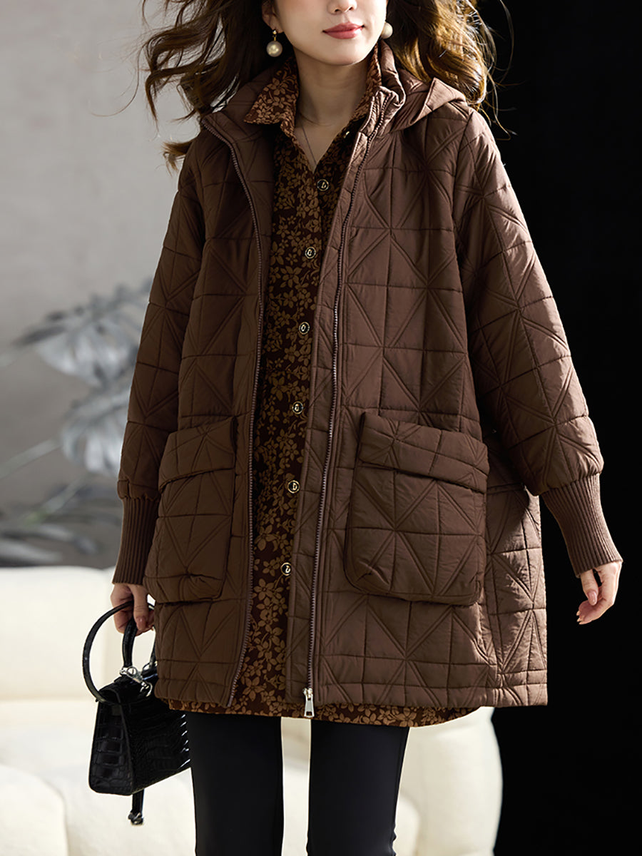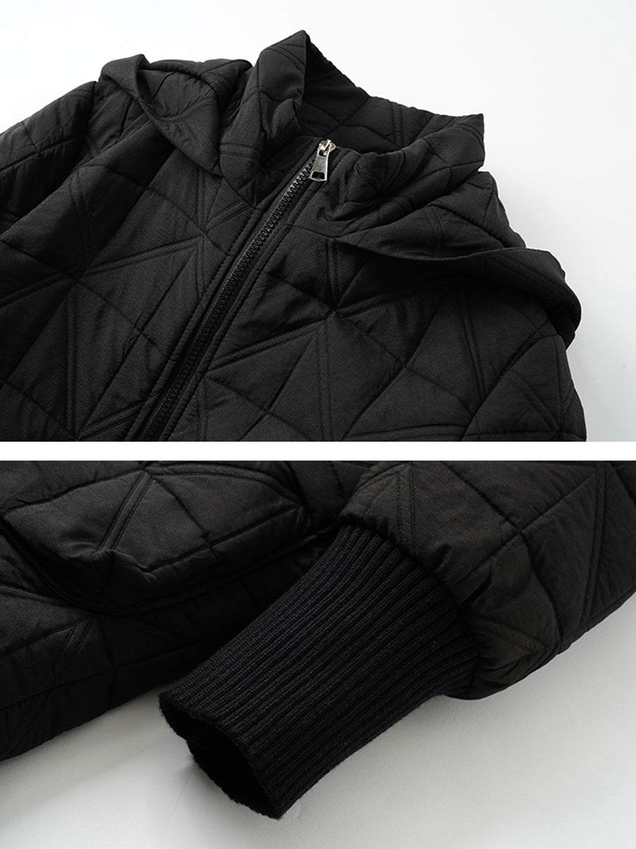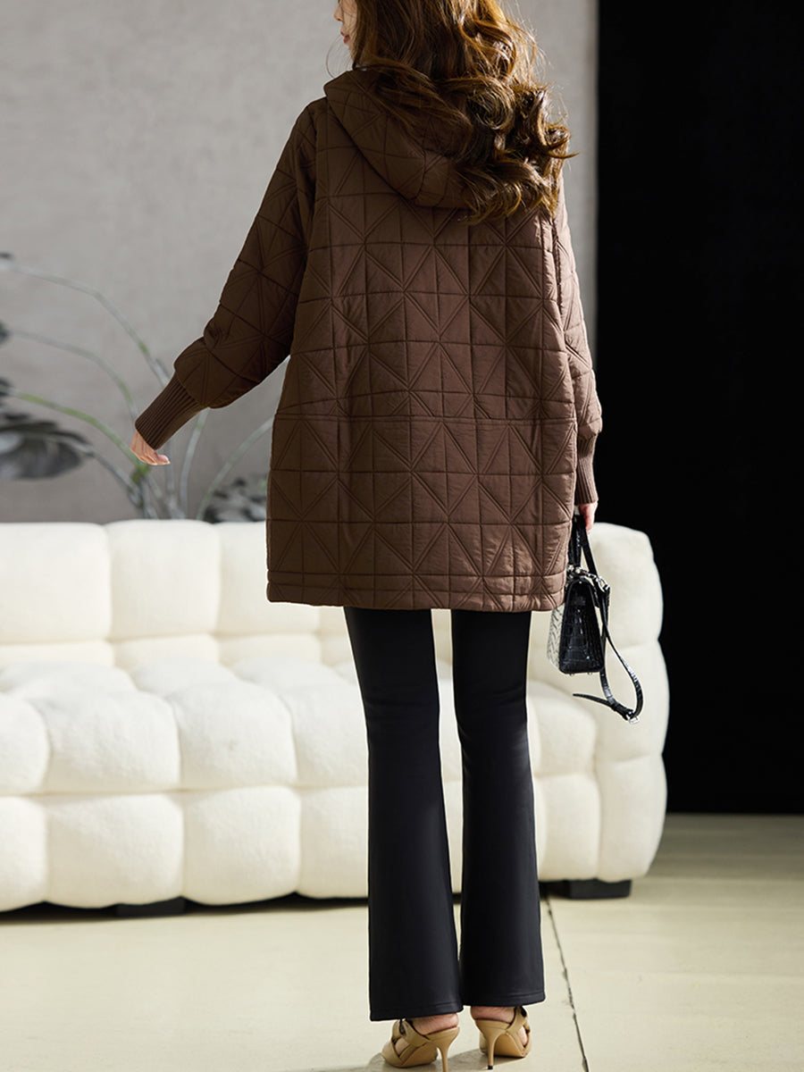 Casaco feminino casual de inverno com capuz acolchoado e estampa de losangos em cor lisa.