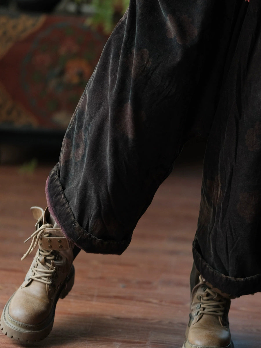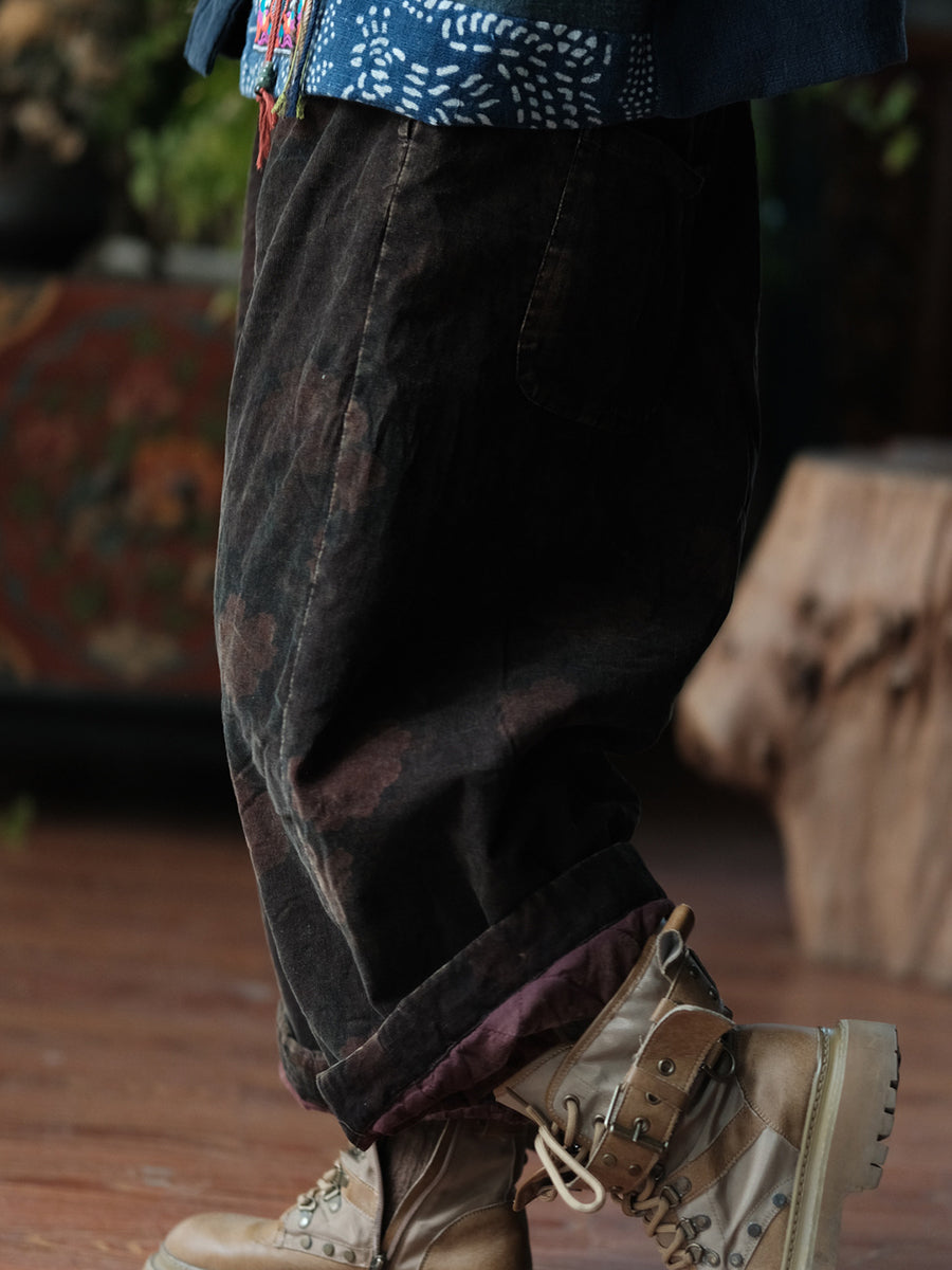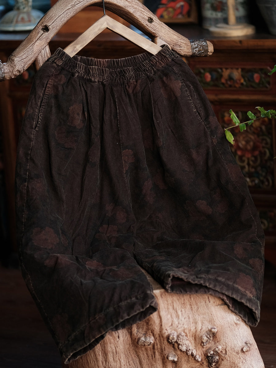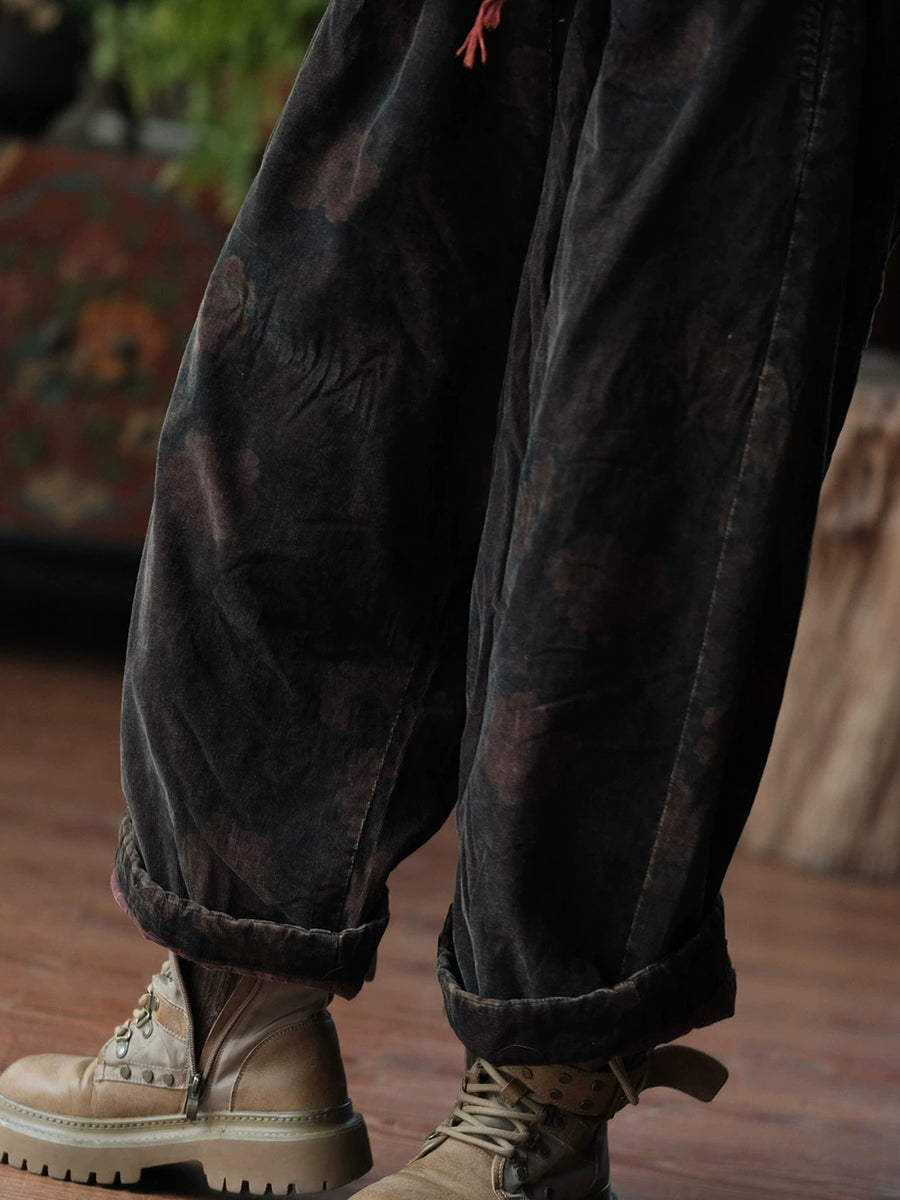 Calças de inverno femininas de algodão acolchoadas com estampa floral e pernas largas.