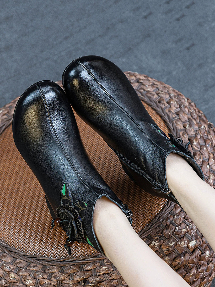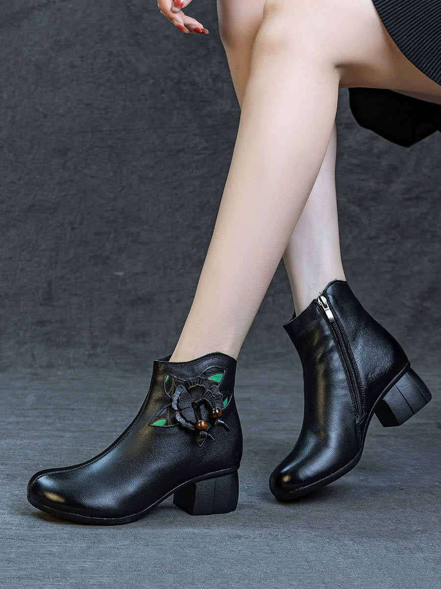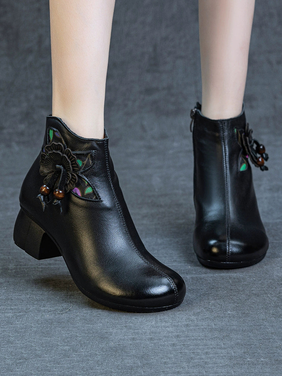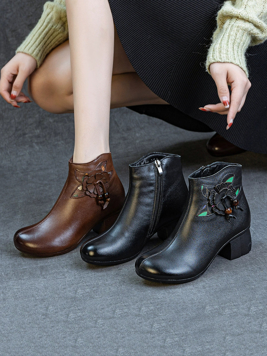 Botas de cano curto femininas de inverno com salto médio e estampa floral em couro.