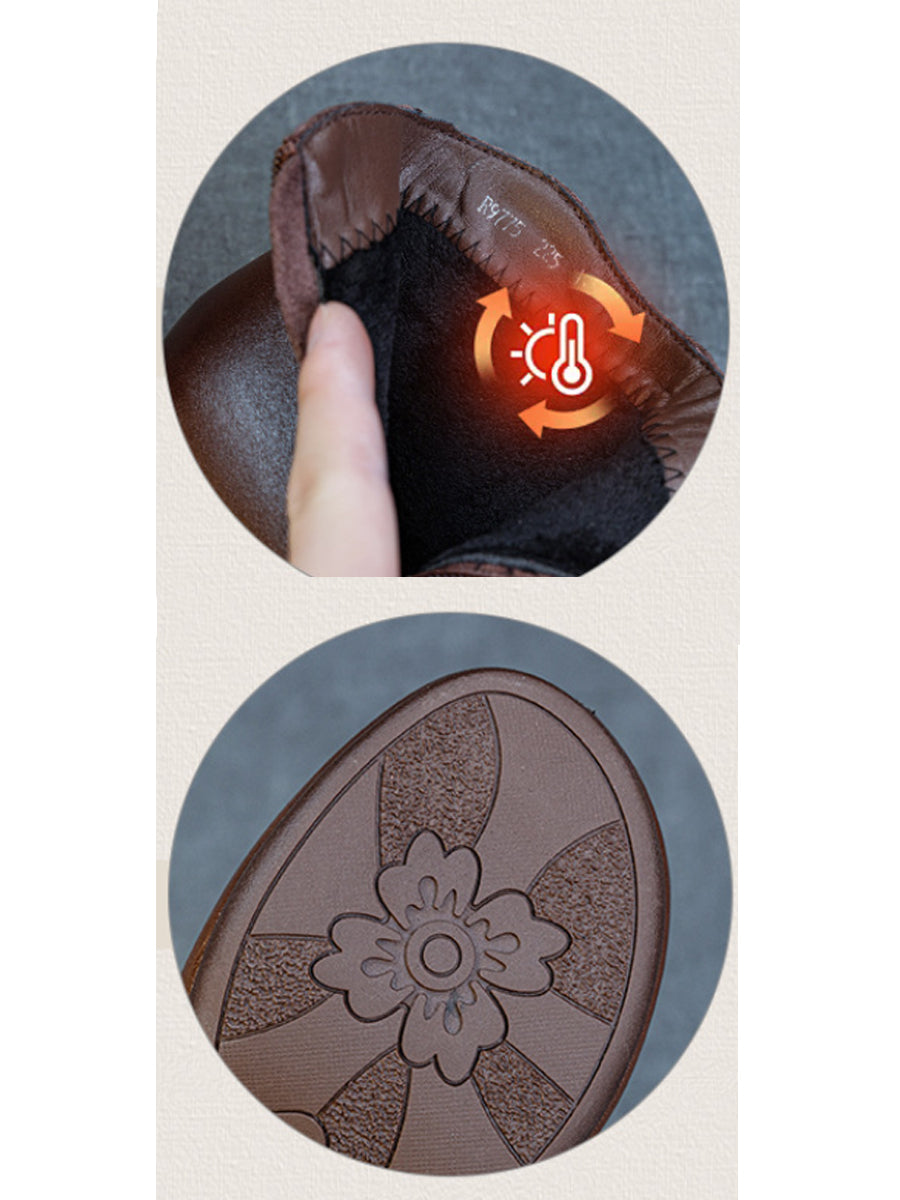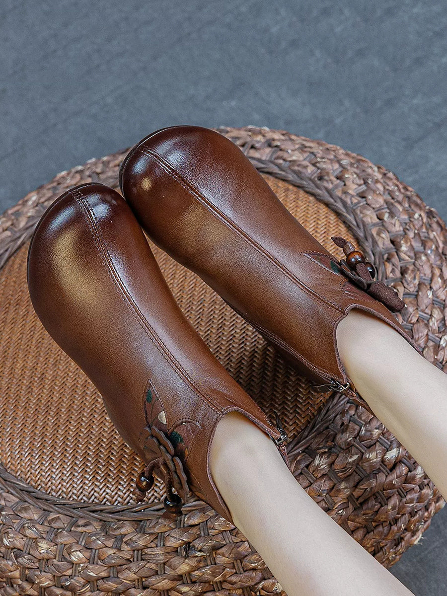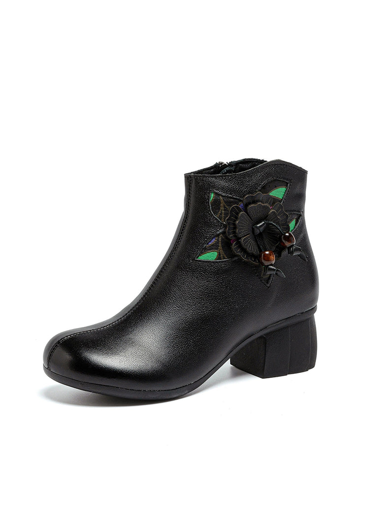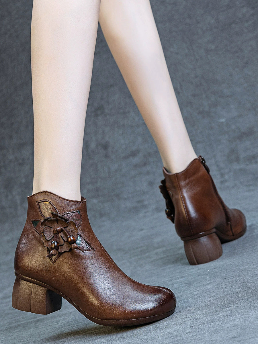 Botas de cano curto femininas de inverno com salto médio e estampa floral em couro.