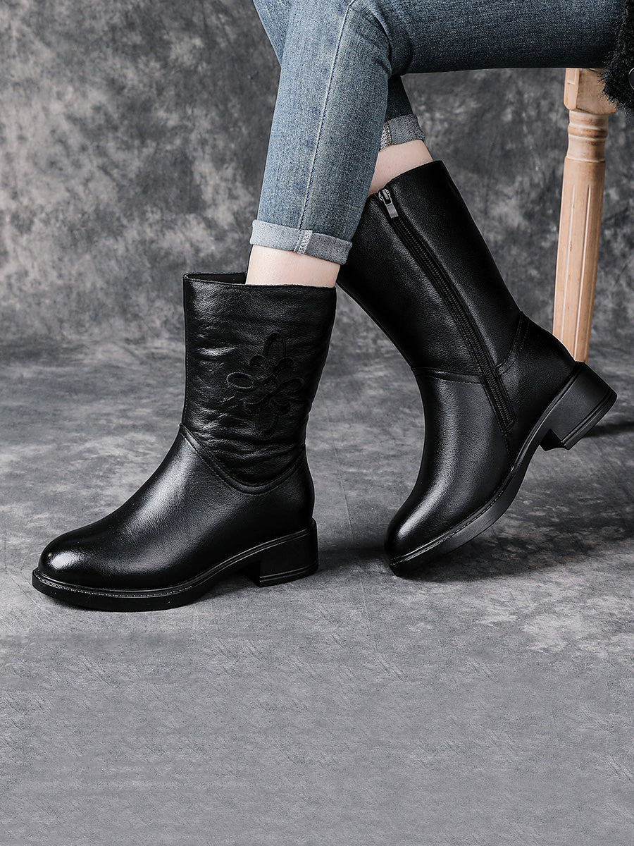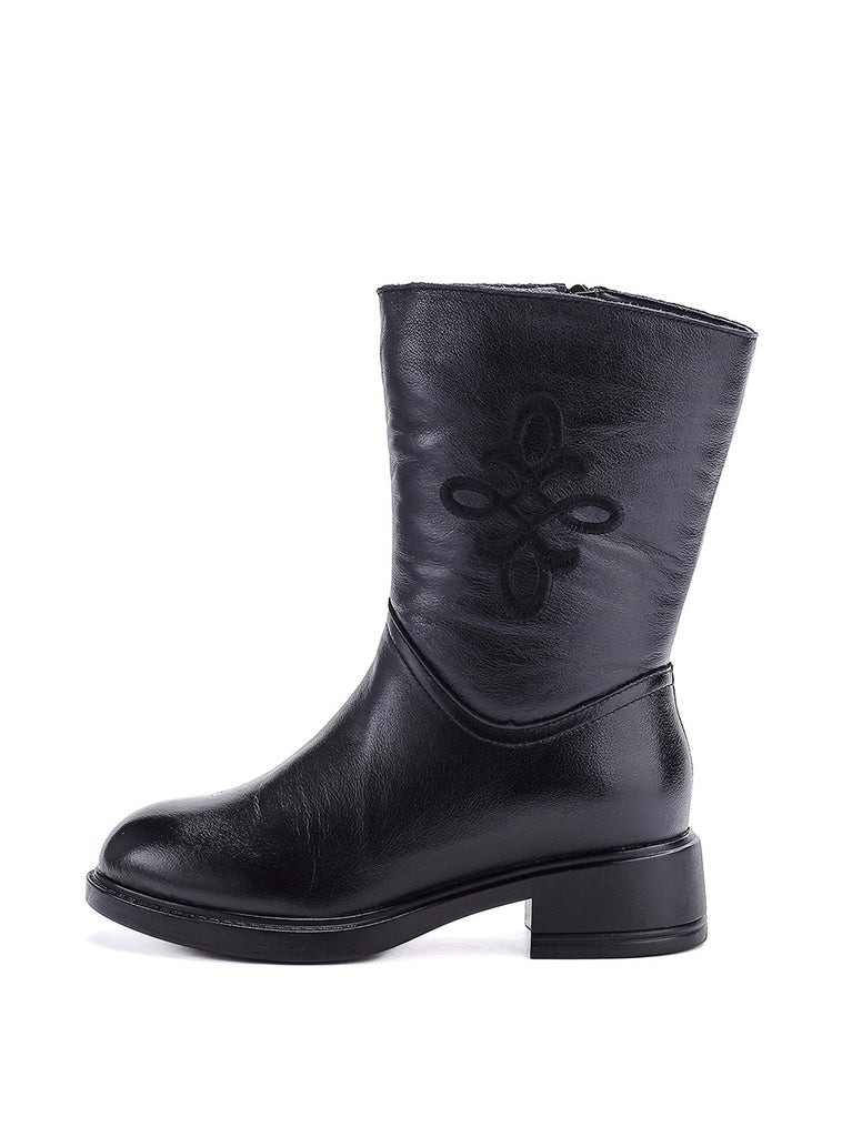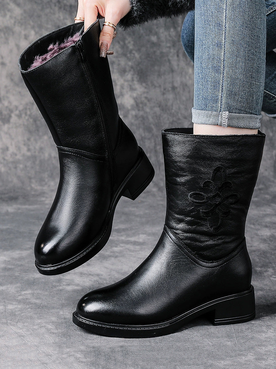 Botas femininas de inverno de couro legítimo com salto médio e forro de lã.