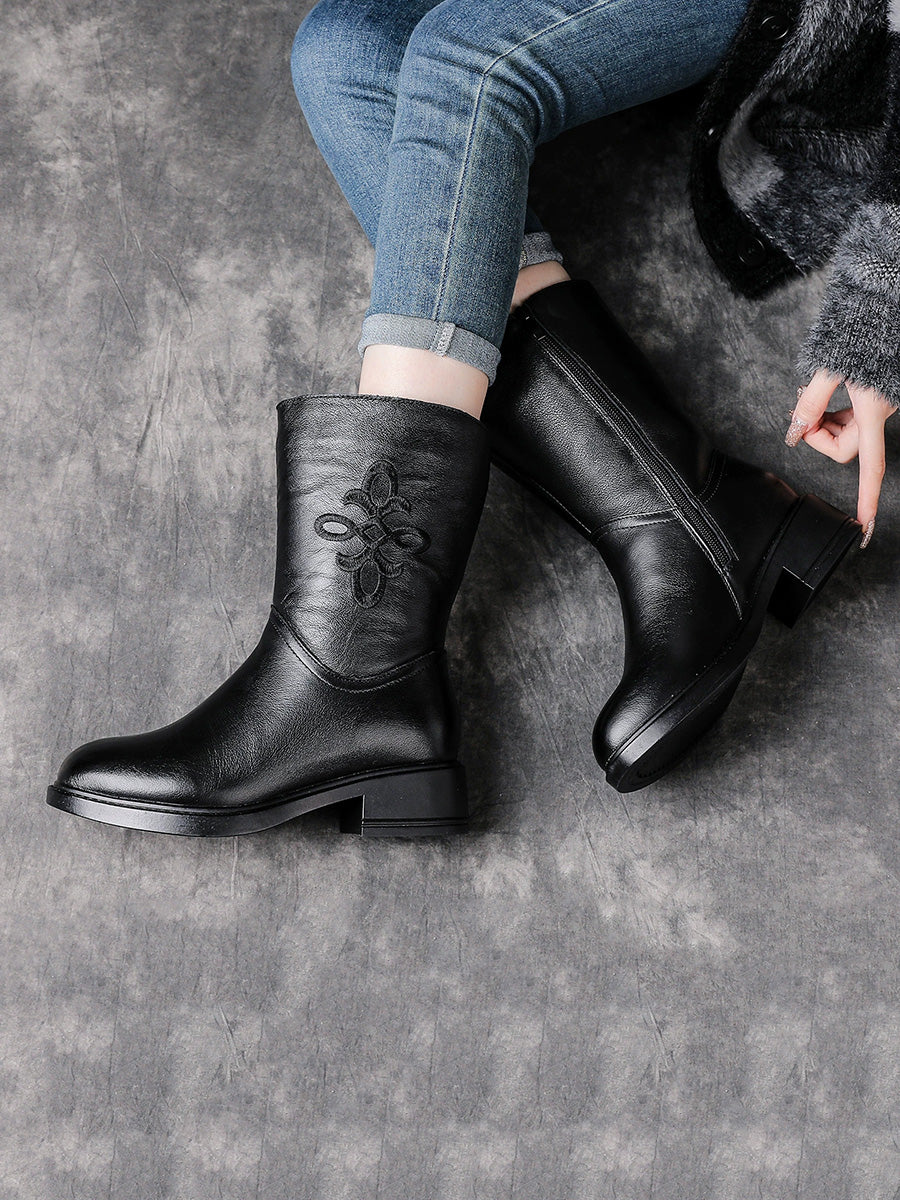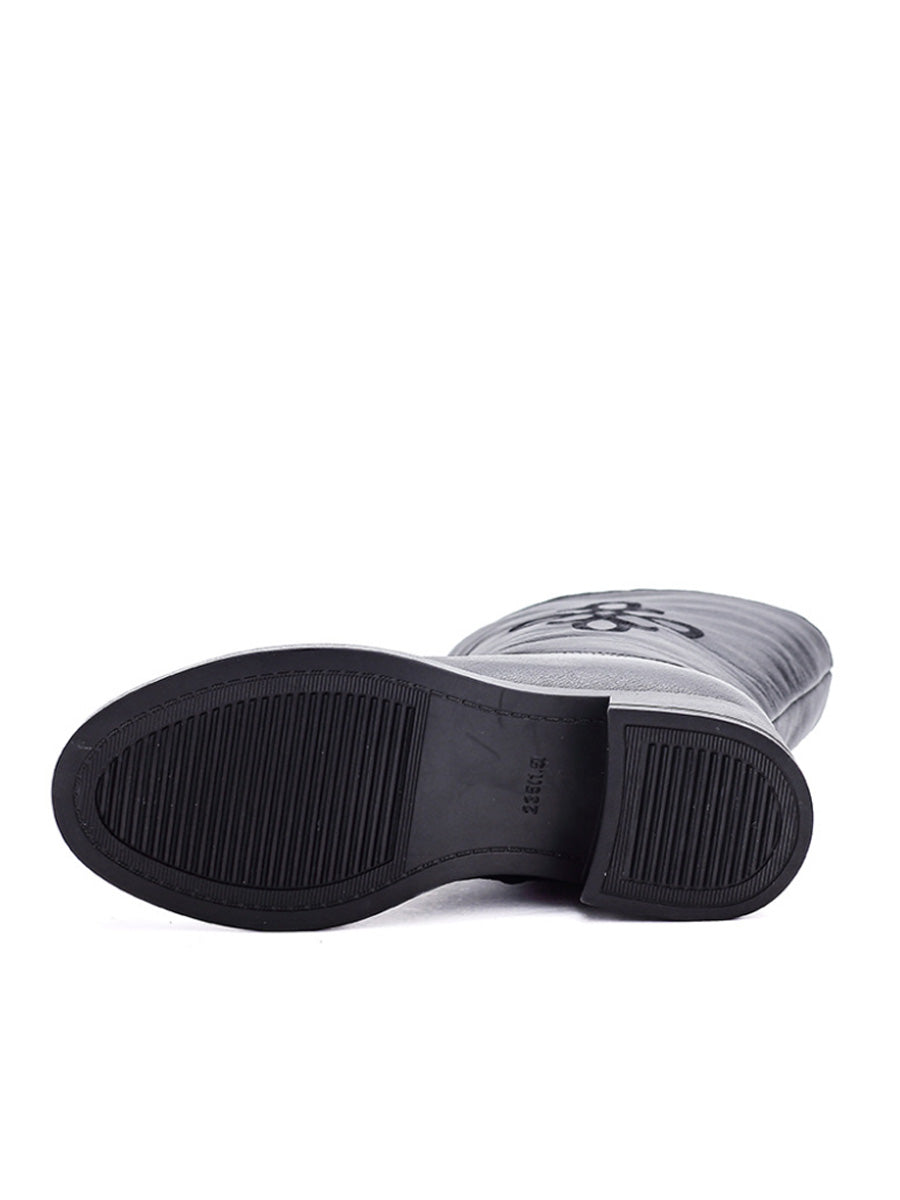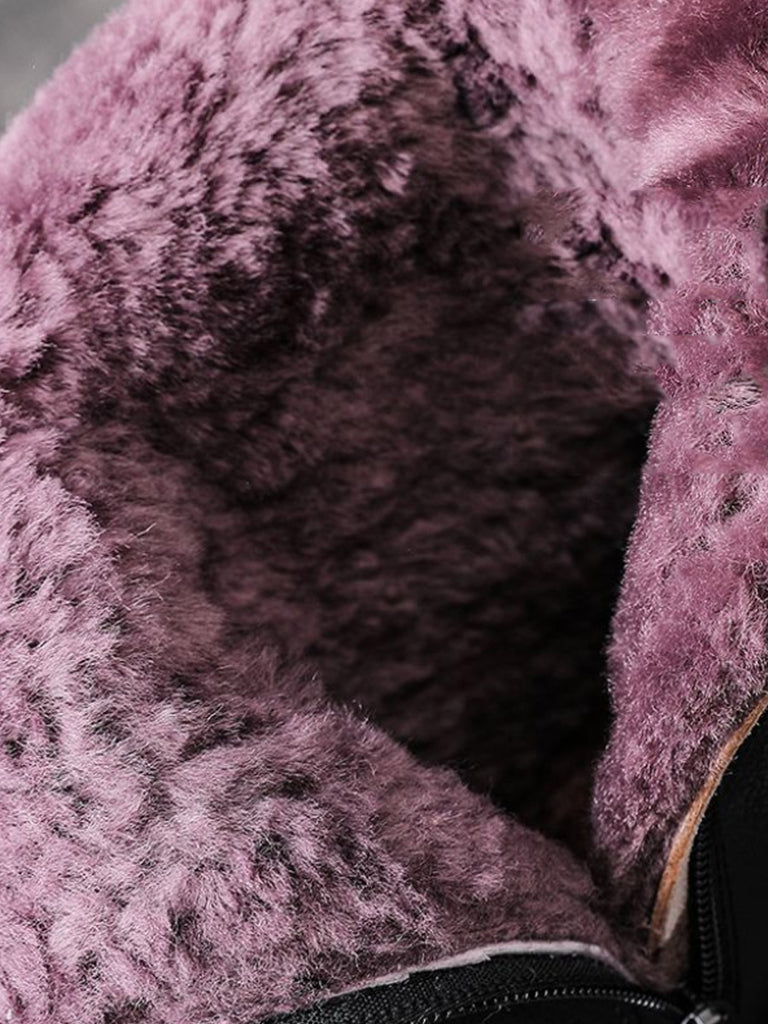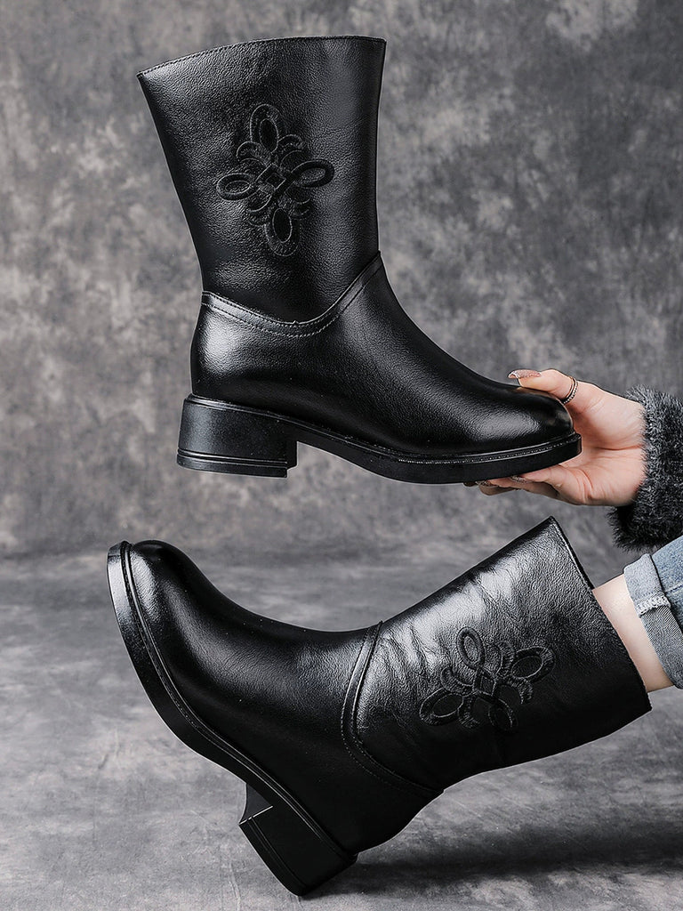 Botas femininas de inverno de couro legítimo com salto médio e forro de lã.
