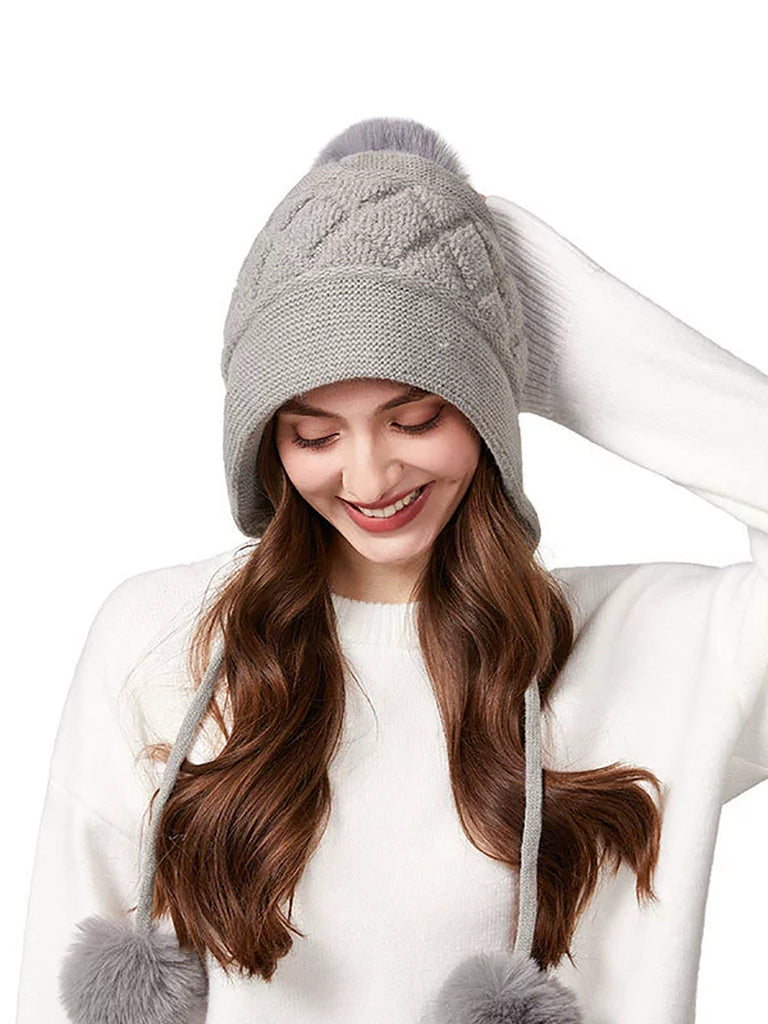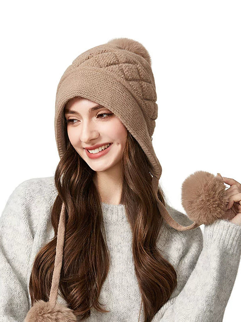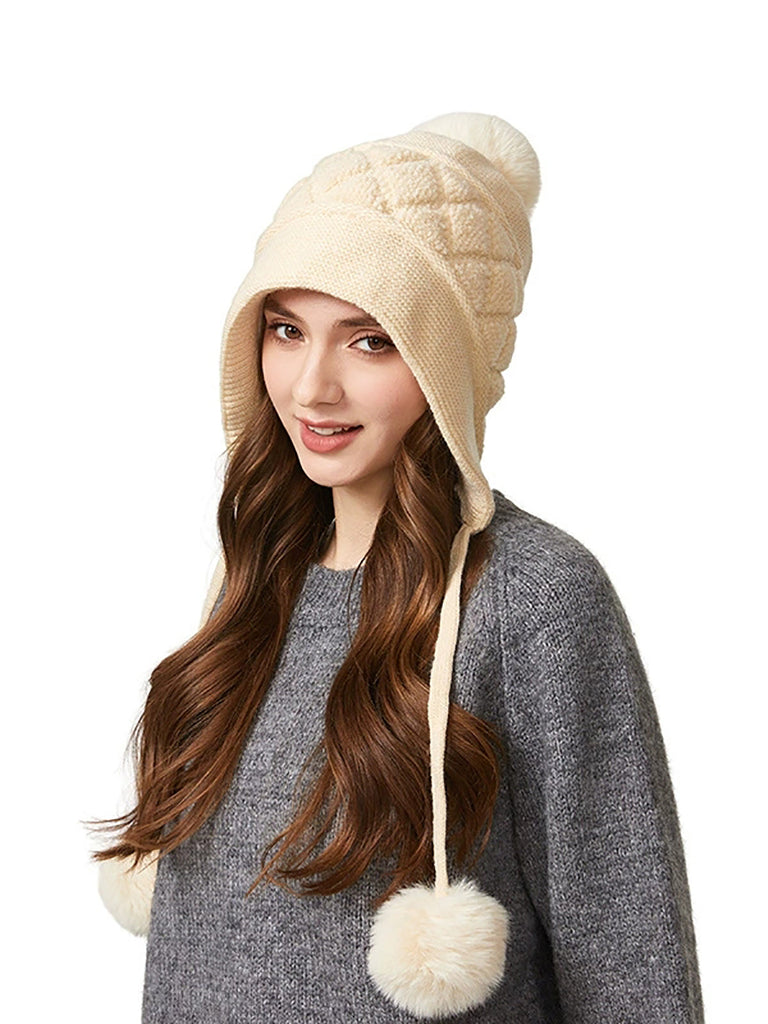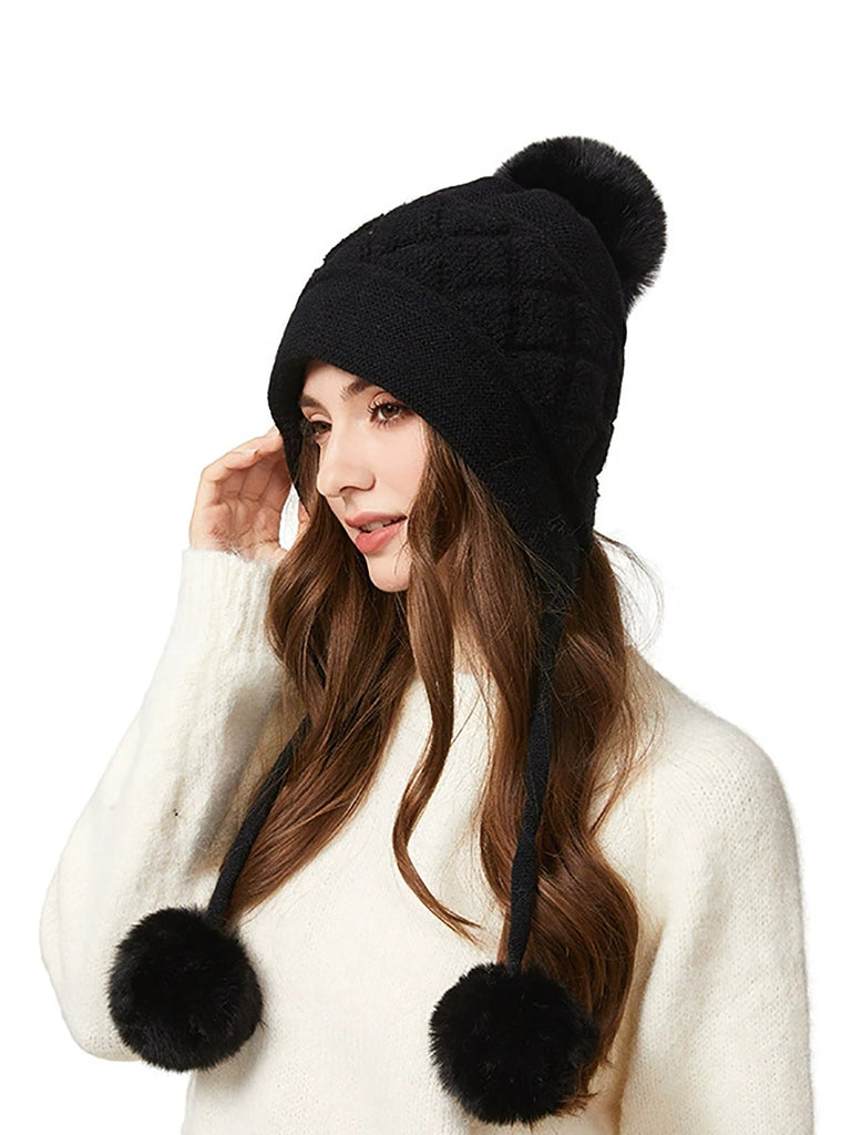 Gorro de malha feminino com bola de pelo de inverno para manter aquecido