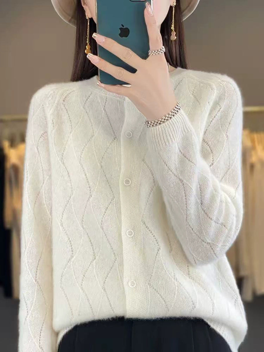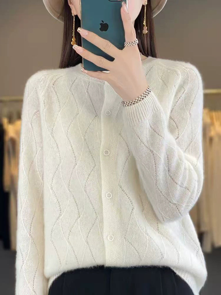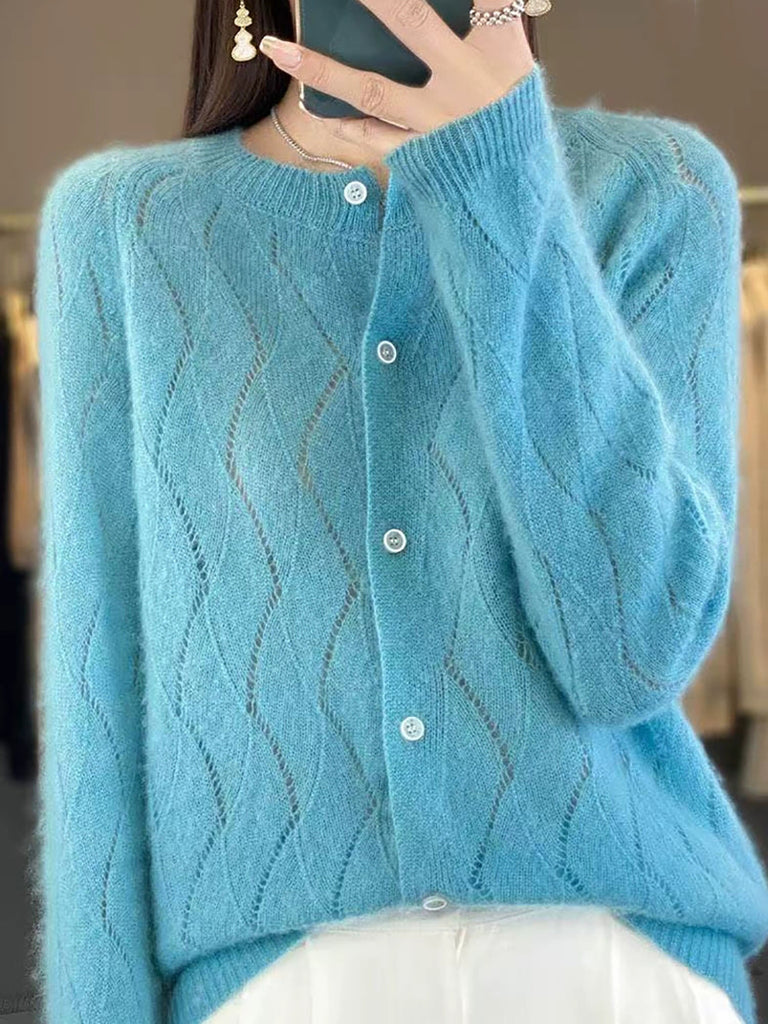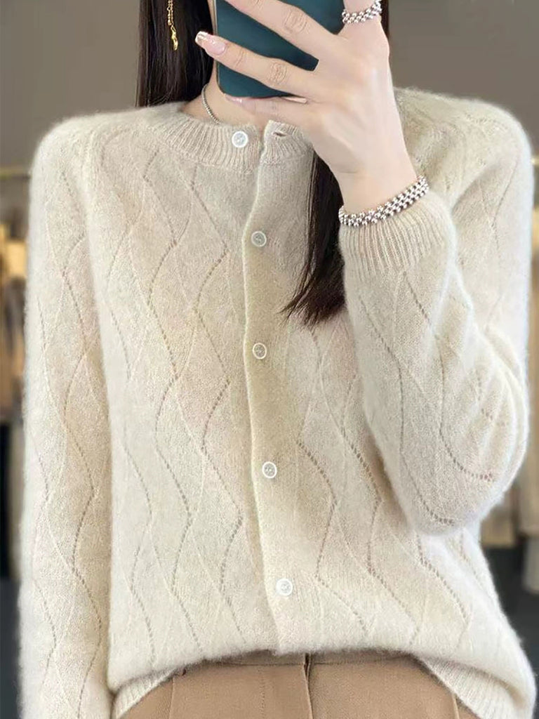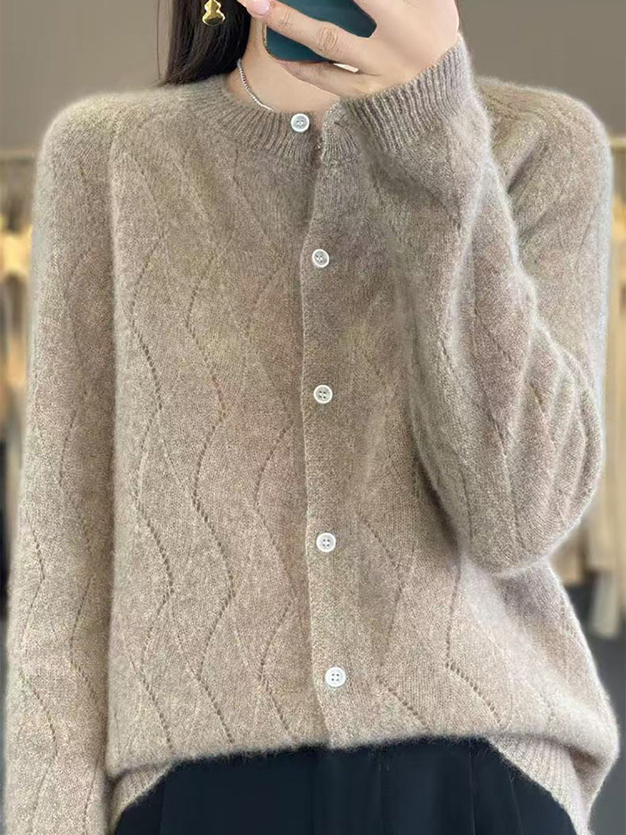 Cardigã feminino de inverno em tricô, cor lisa, gola redonda.