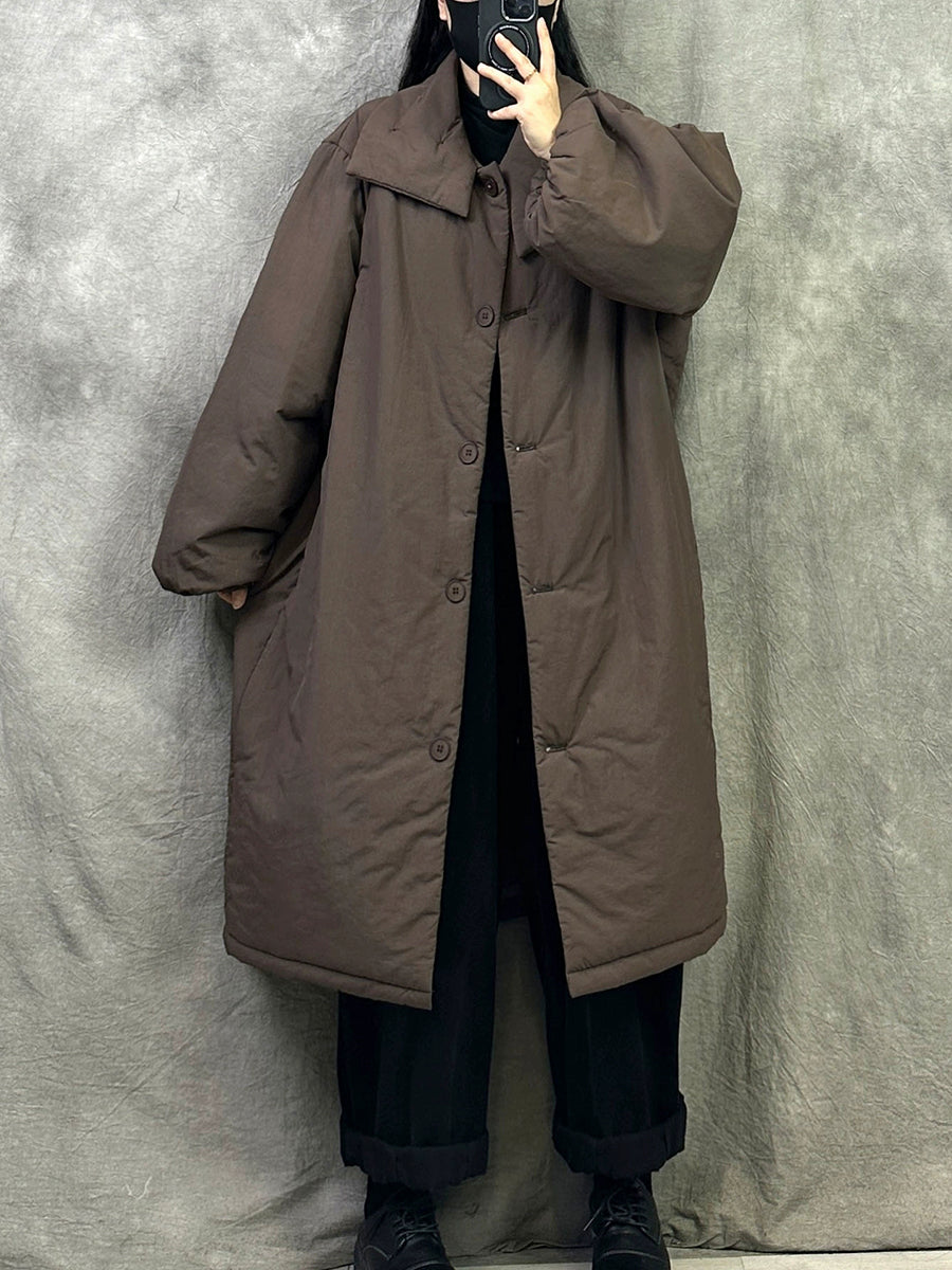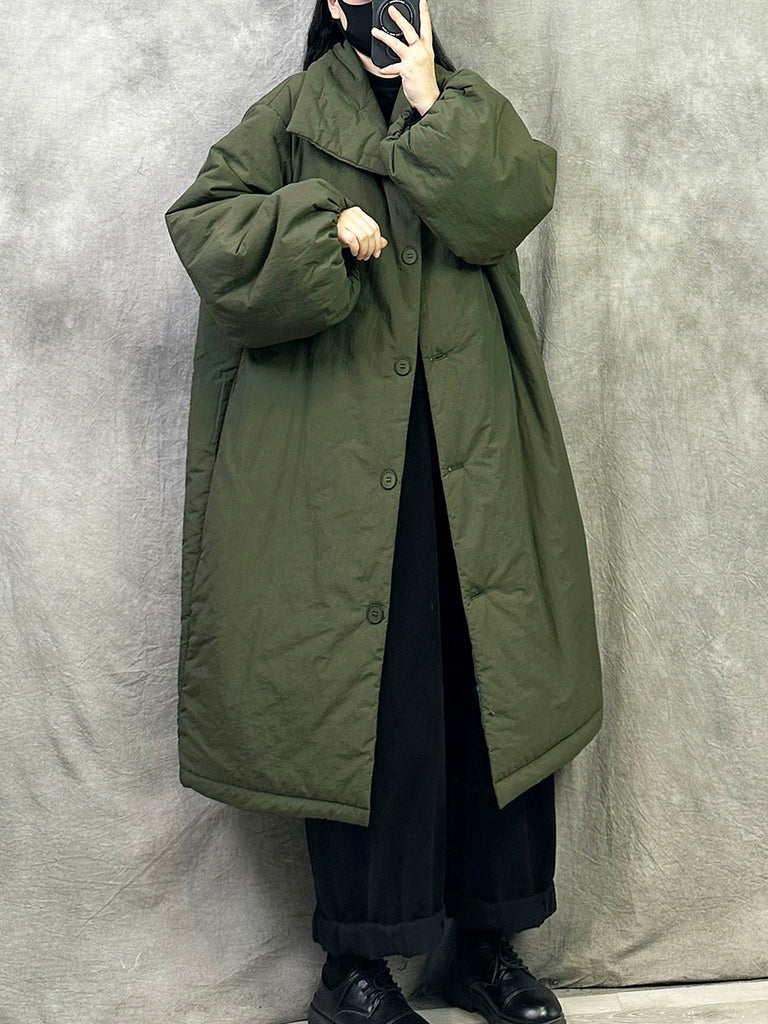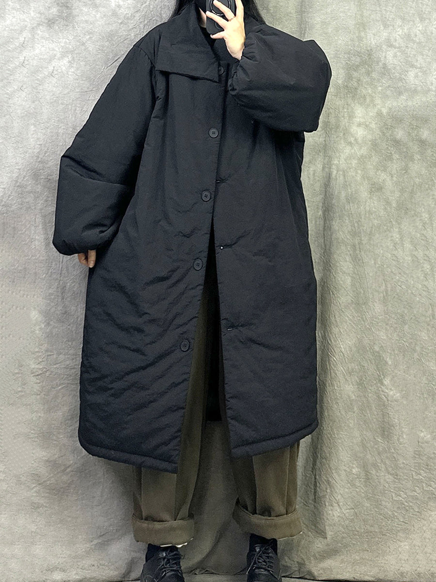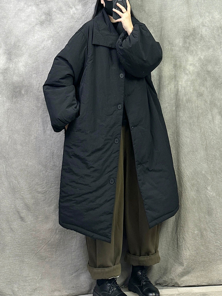 Casaco longo acolchoado feminino de inverno em cor lisa com gola dobrável.