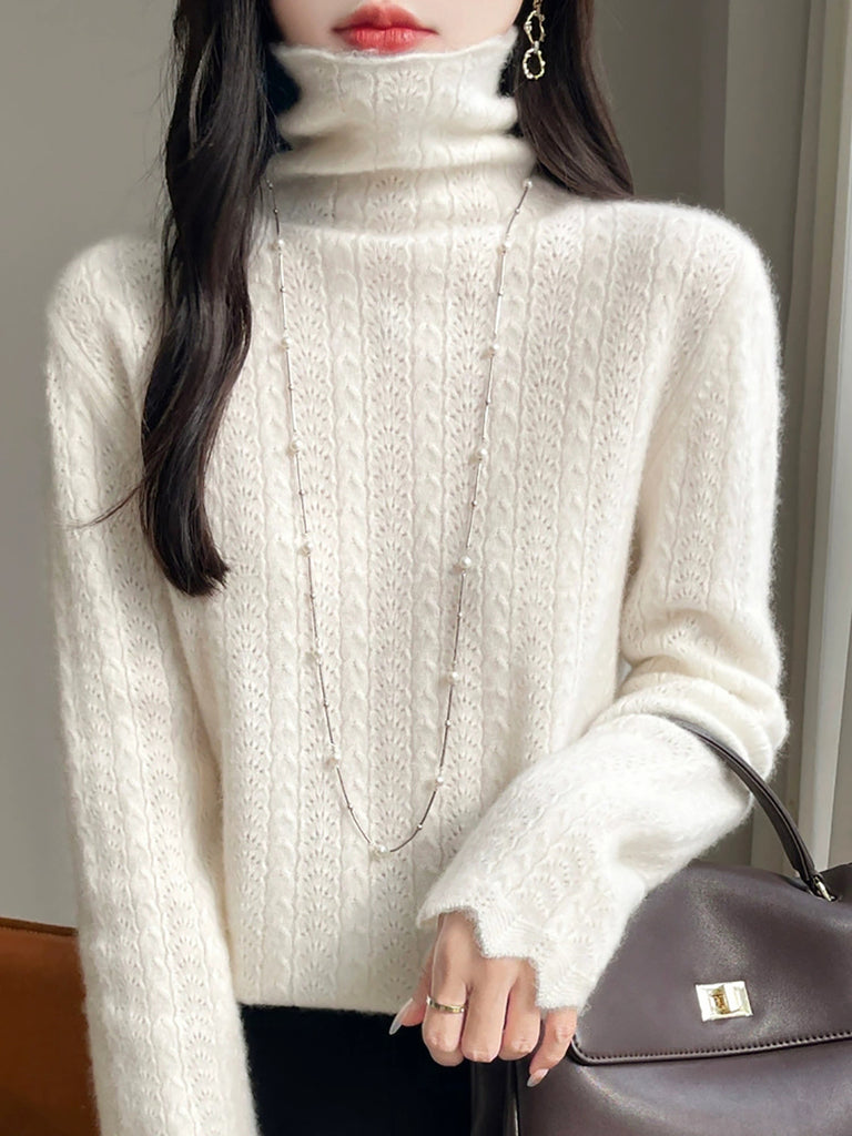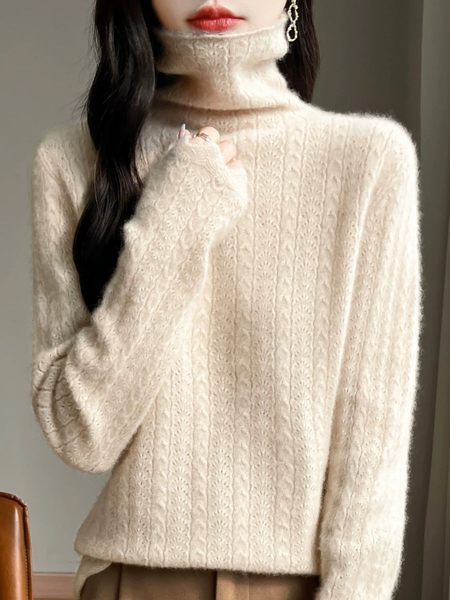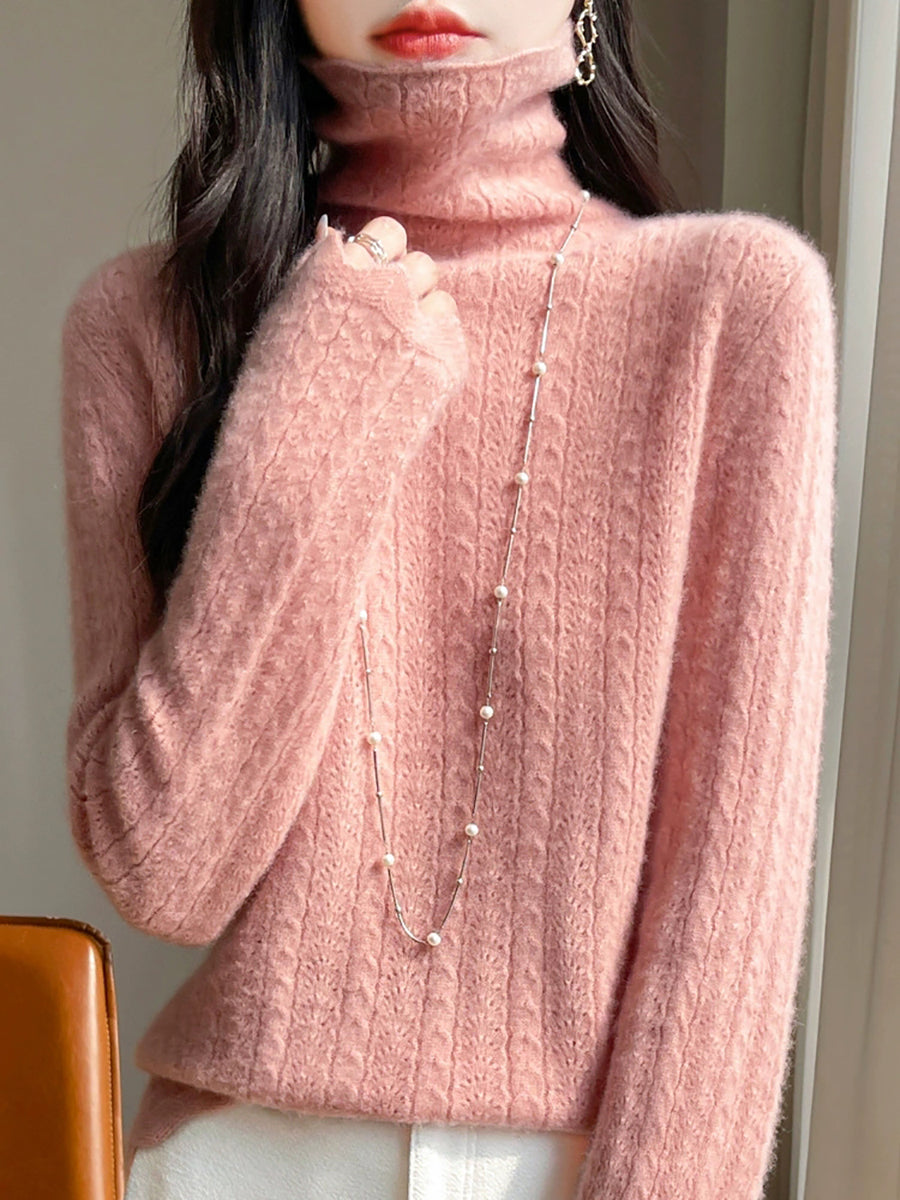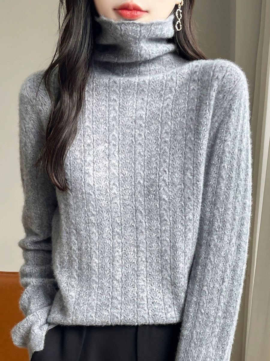 Suéter feminino de inverno com gola alta em lã e cor lisa