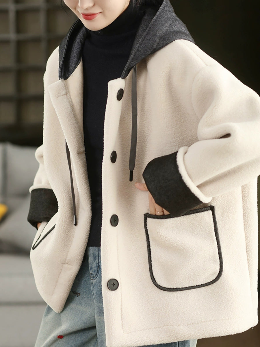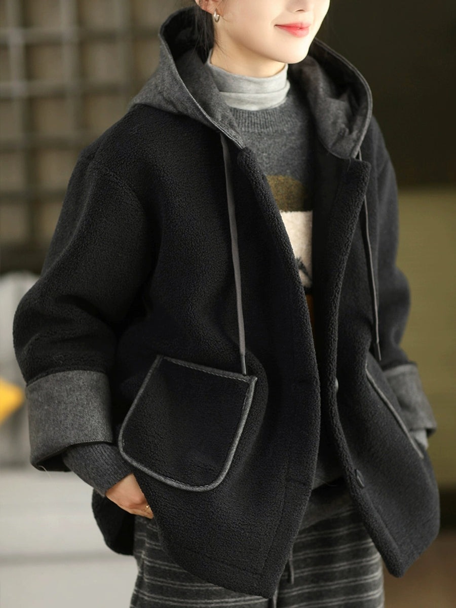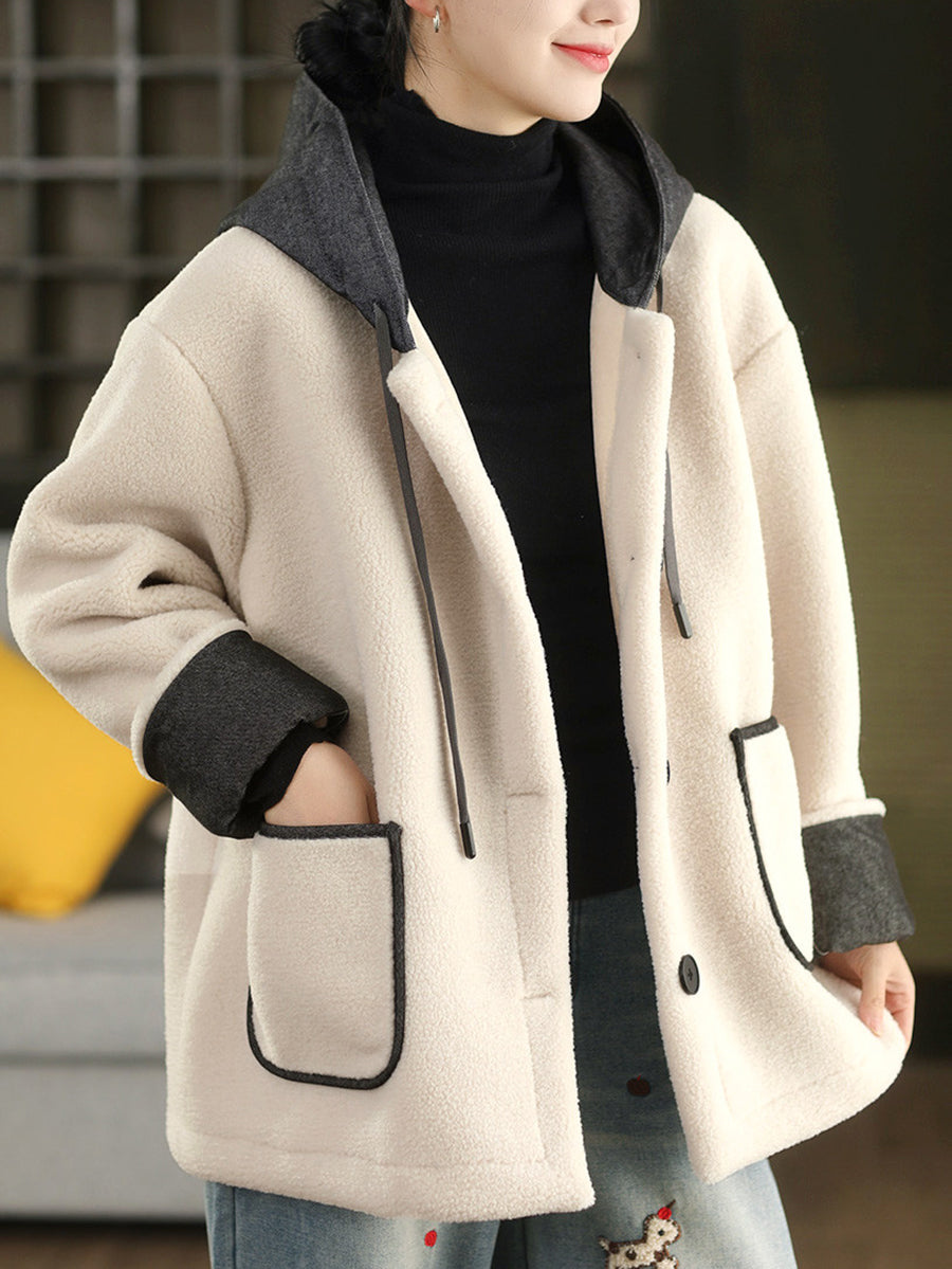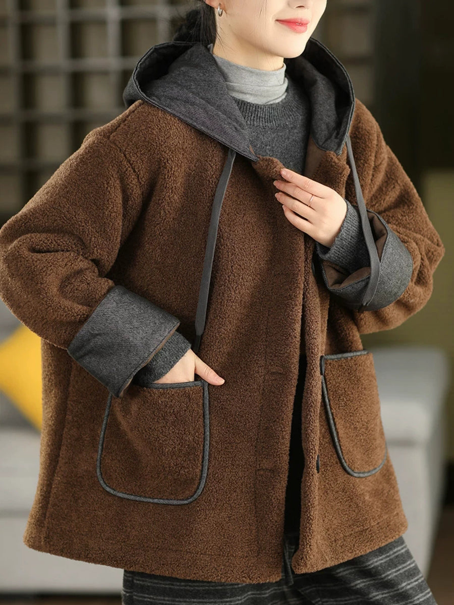 Casaco de lã polar feminino com capuz e blocos de cores retrô para o inverno