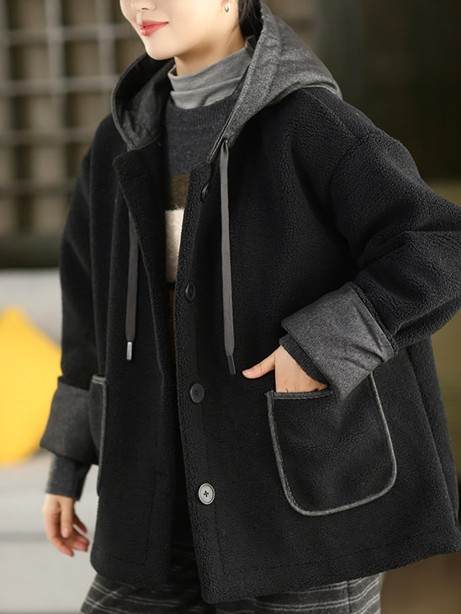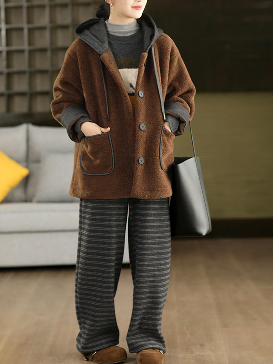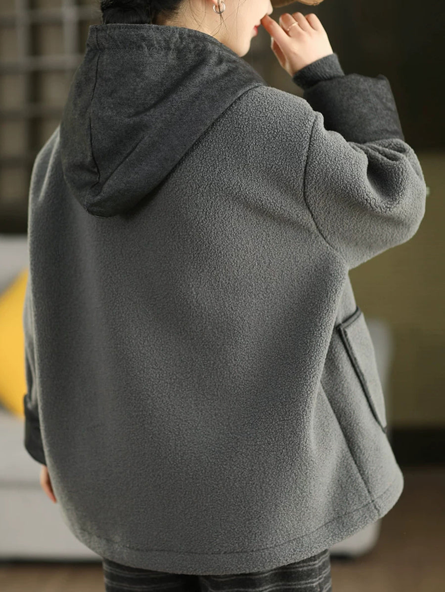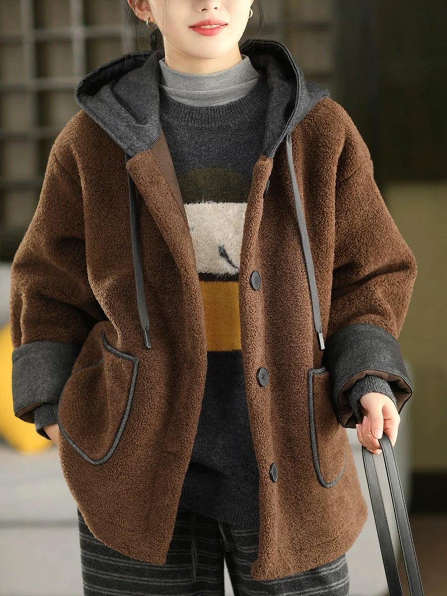 Casaco de lã polar feminino com capuz e blocos de cores retrô para o inverno