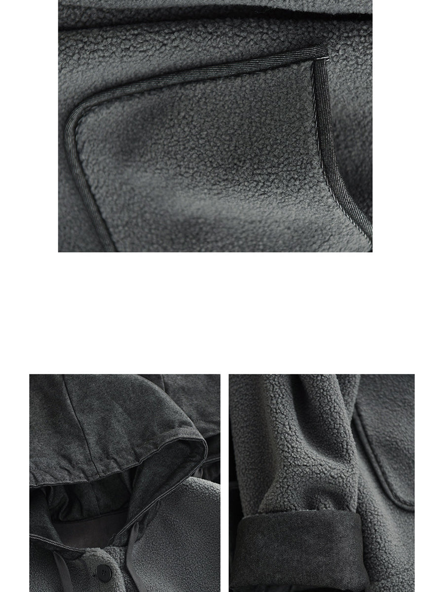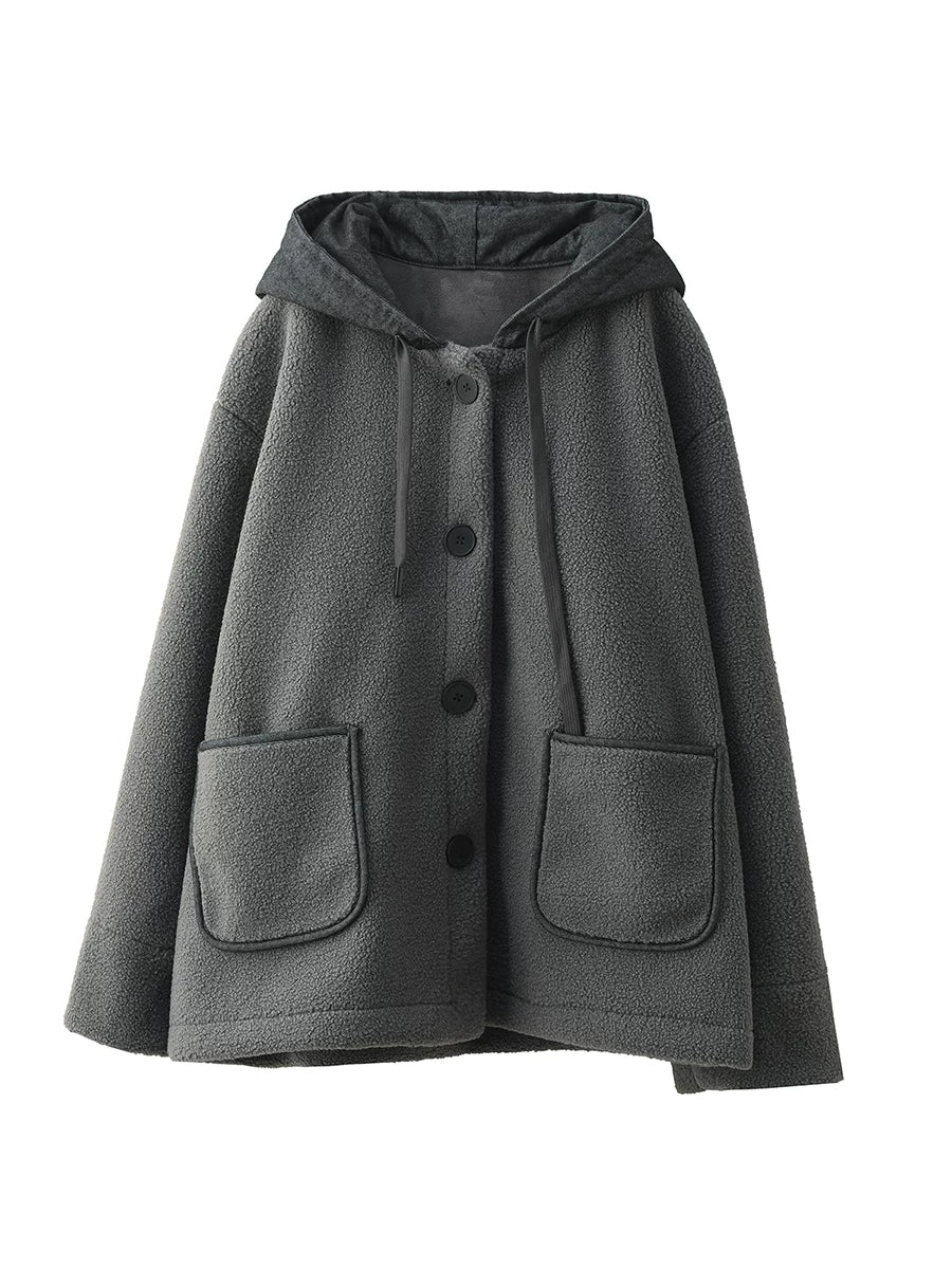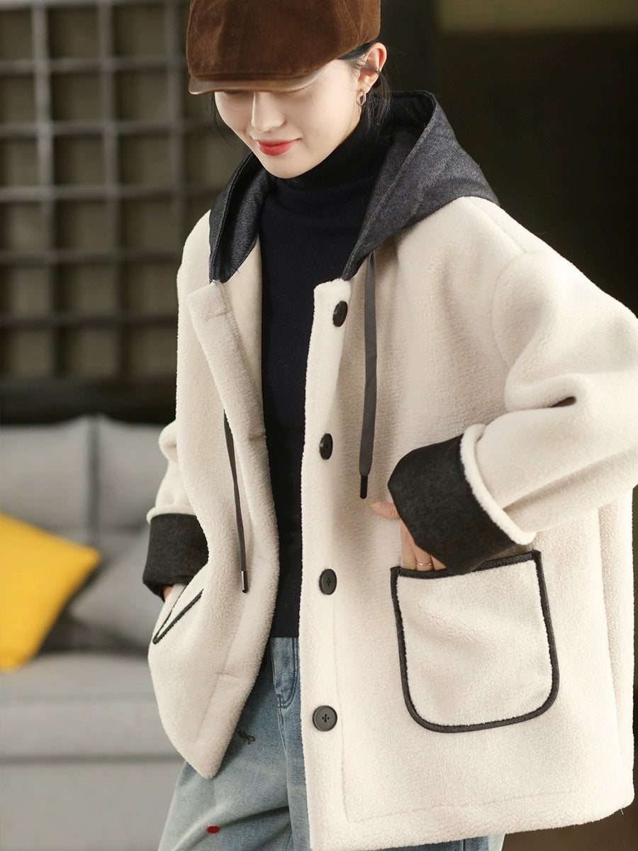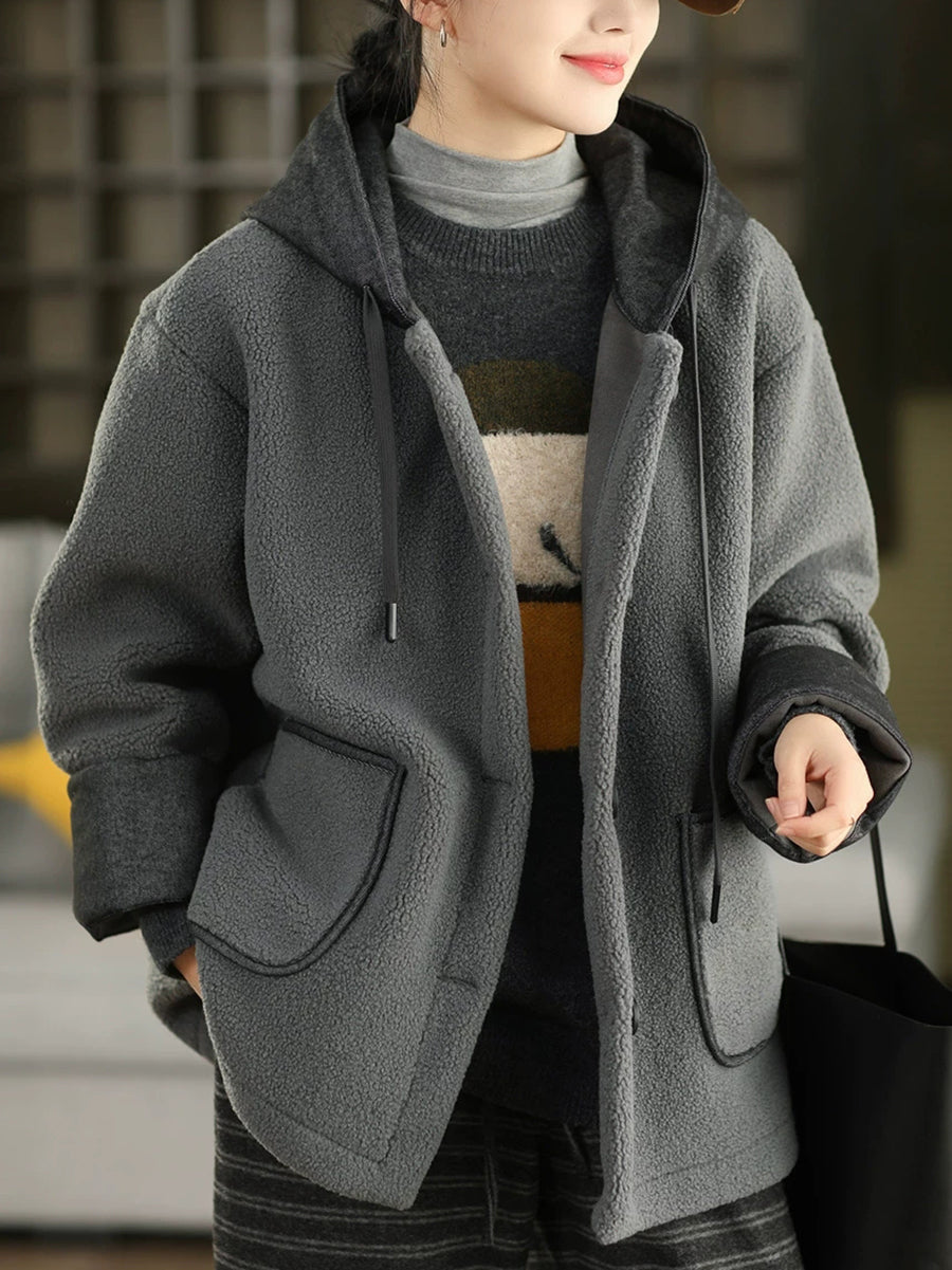 Casaco de lã polar feminino com capuz e blocos de cores retrô para o inverno