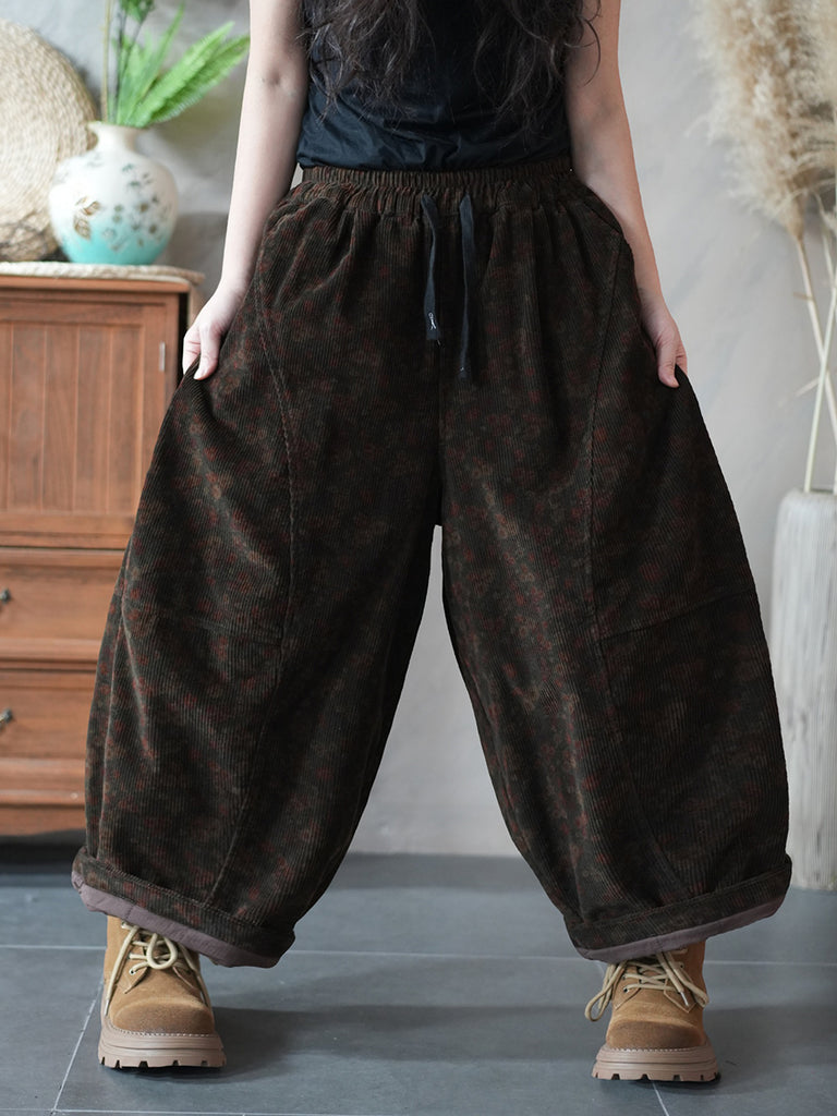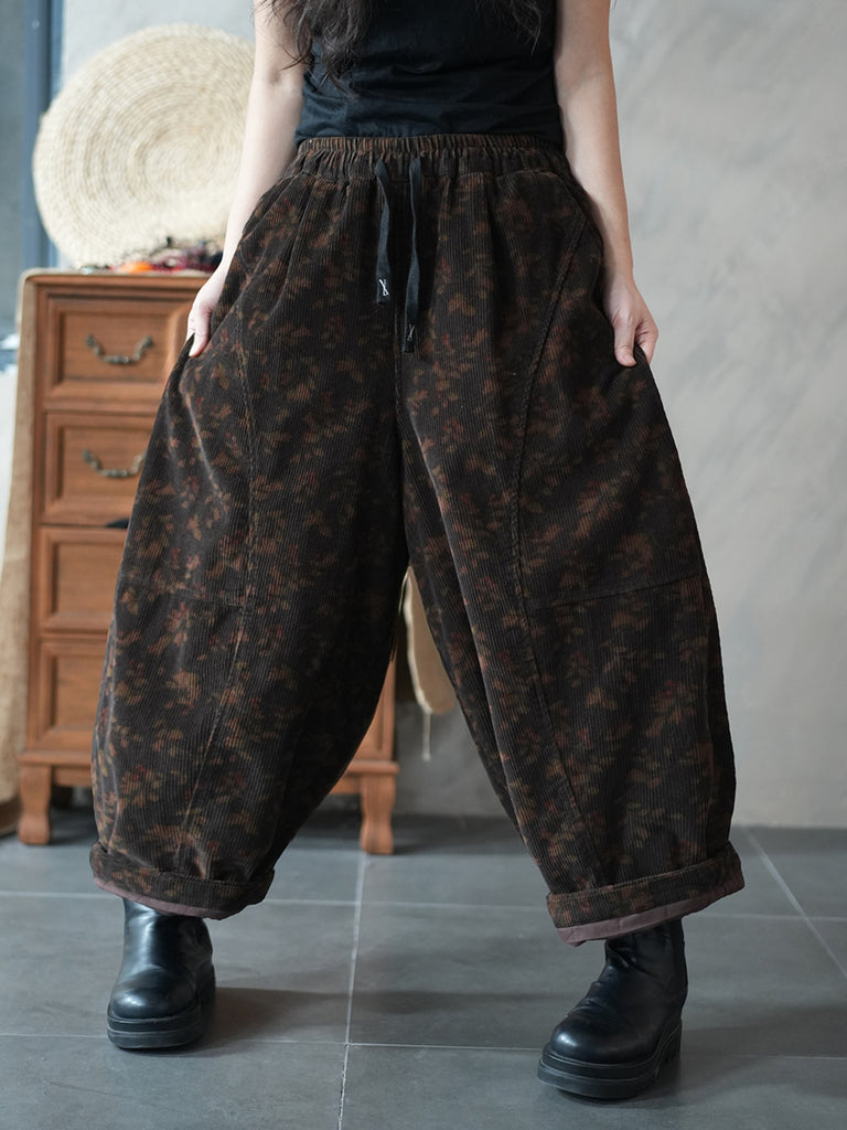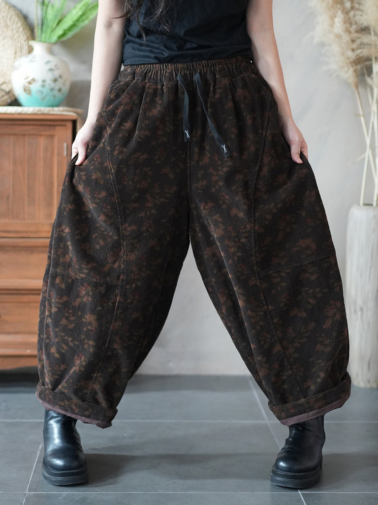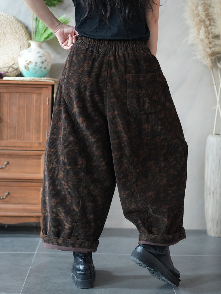 Calça Harem Feminina de Inverno com Estampa Floral Retrô em Veludo Cotelê