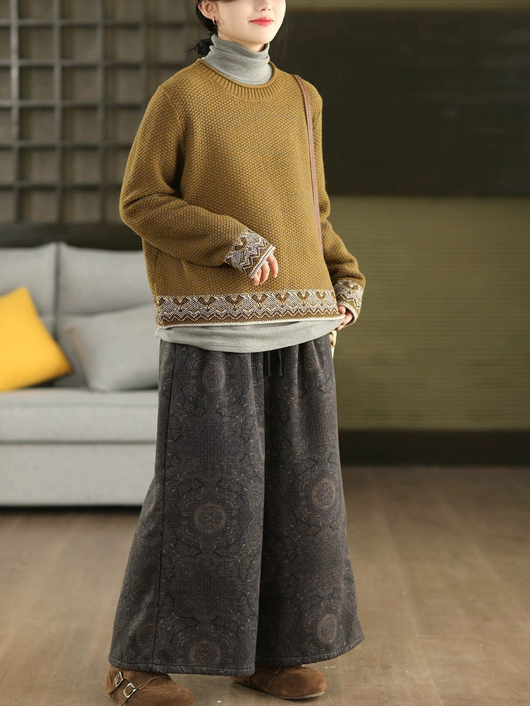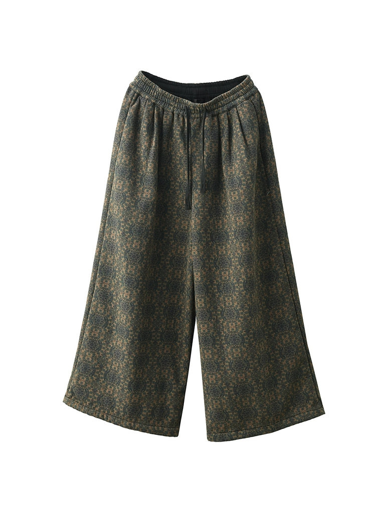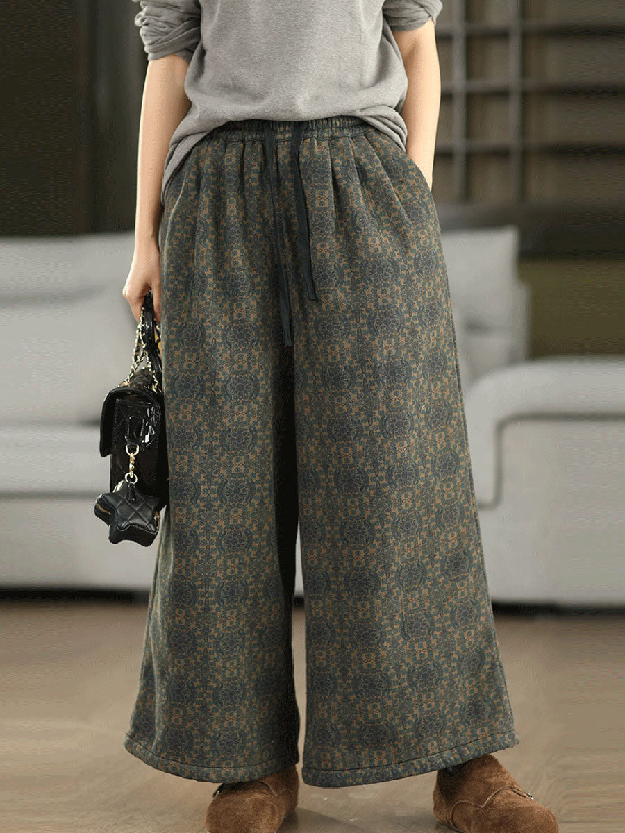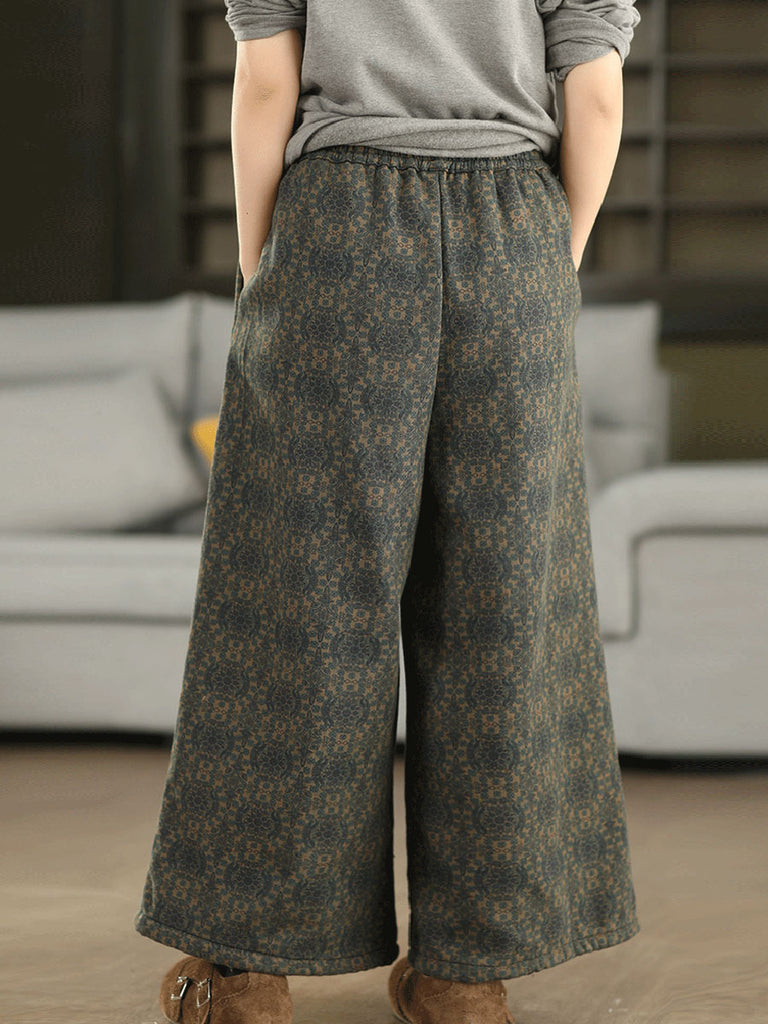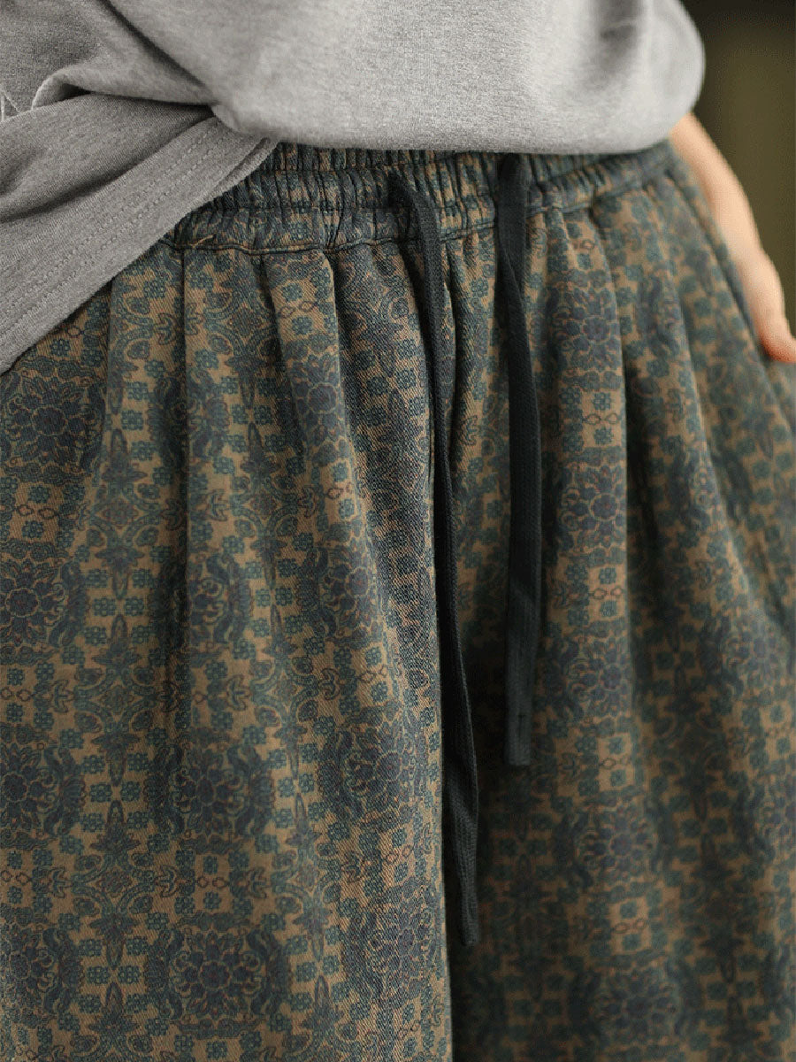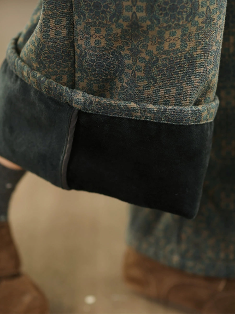 Calça reta feminina de inverno retrô com estampa floral e forro de lã