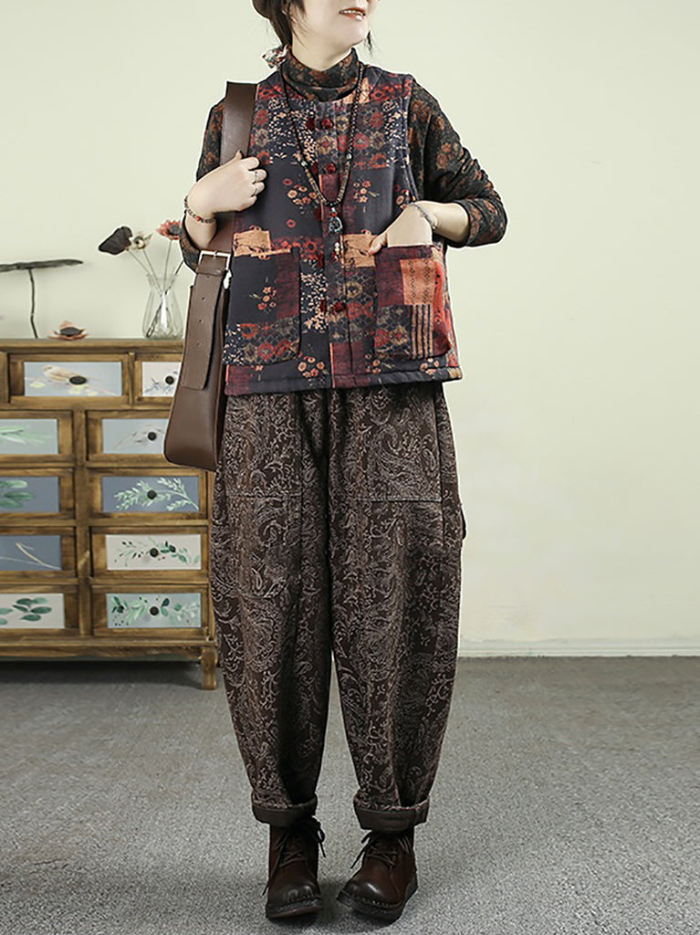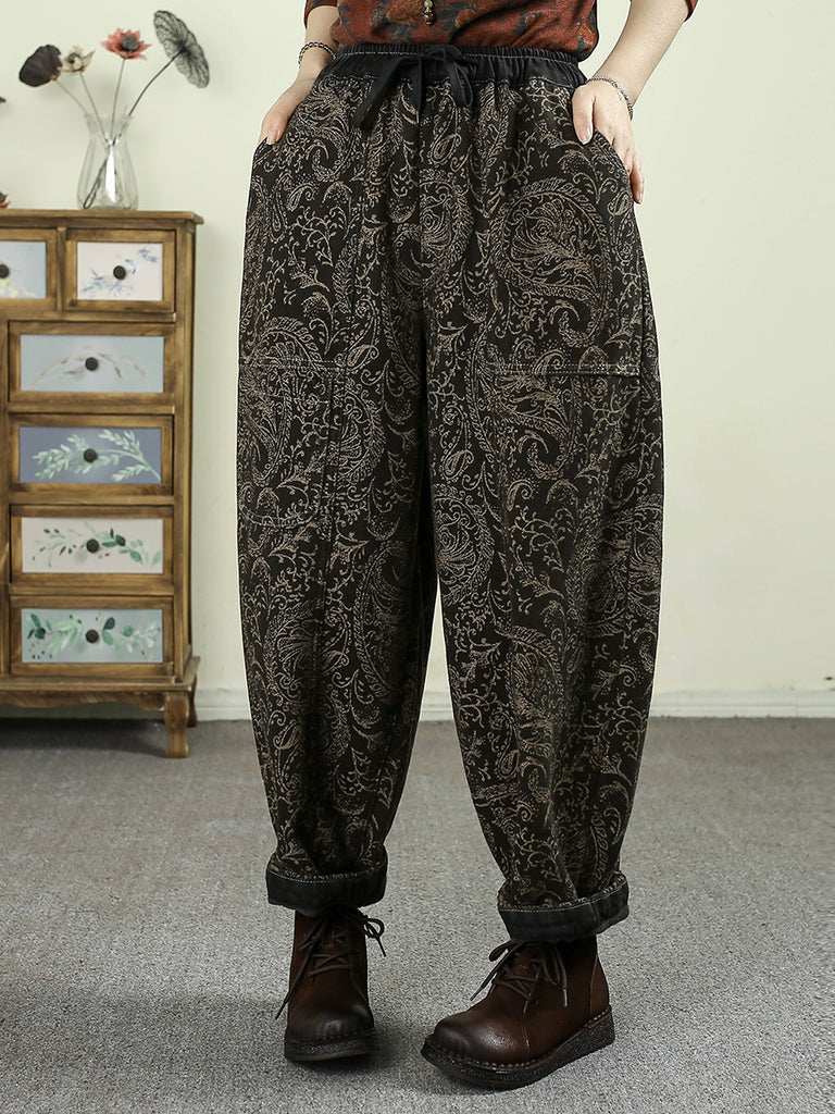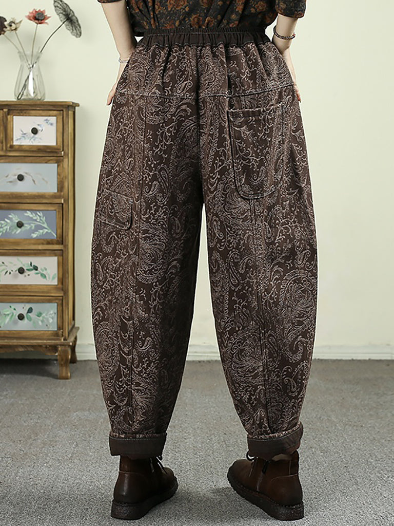 Calças harém femininas de inverno com forro de lã e jacquard retrô com flores