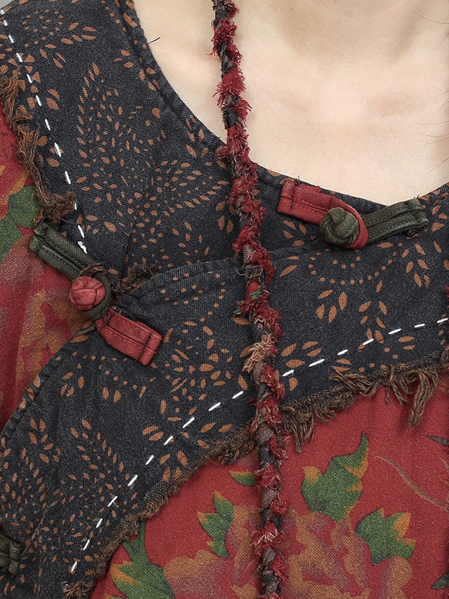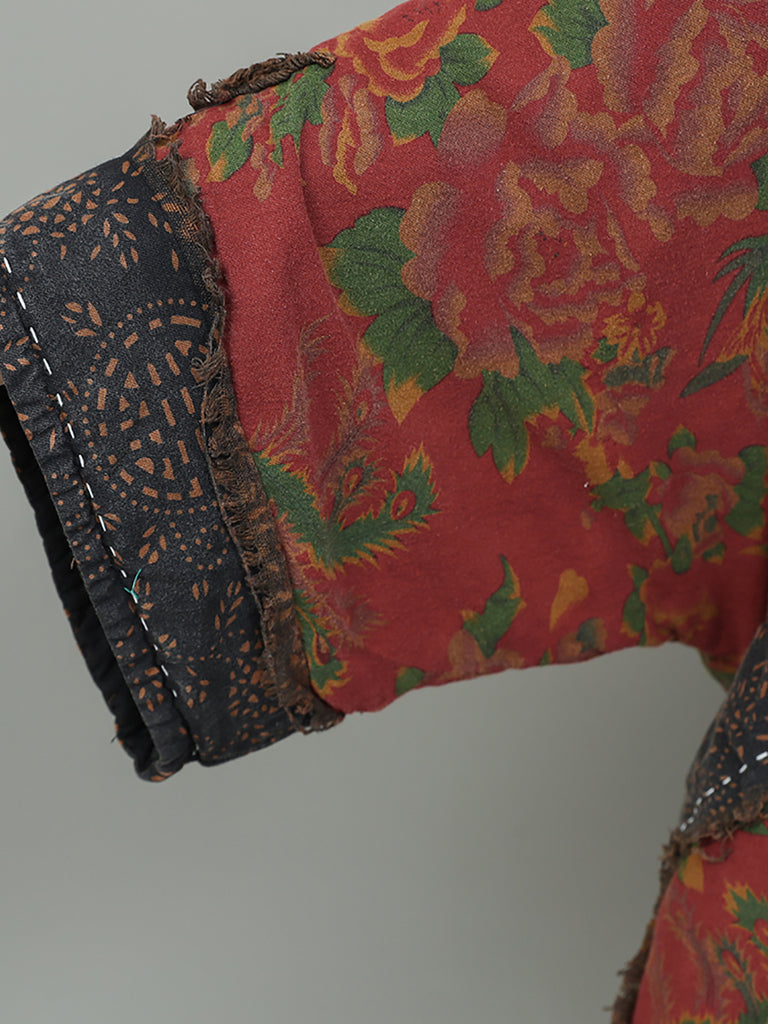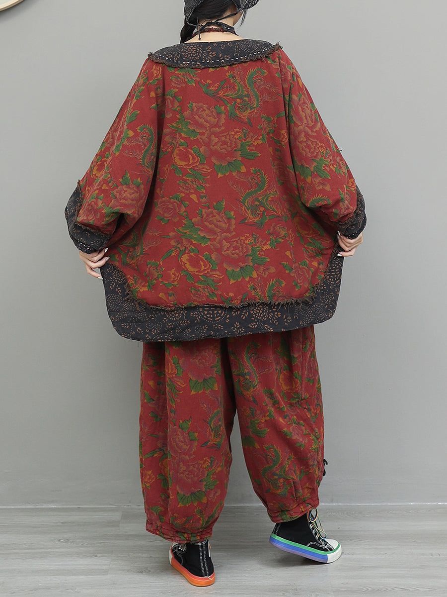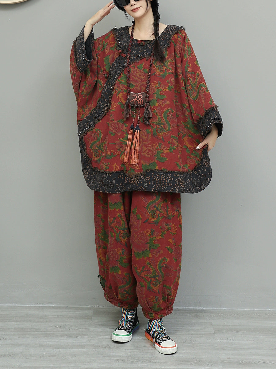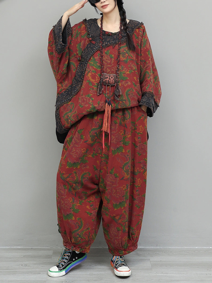 Conjunto feminino de inverno retrô com estampa floral e decote redondo.
