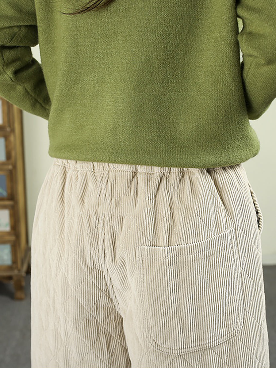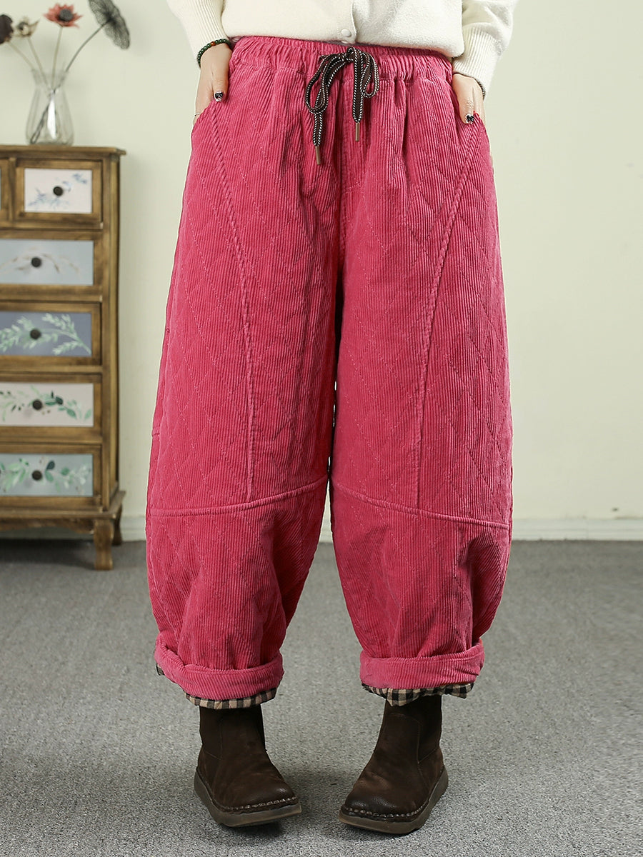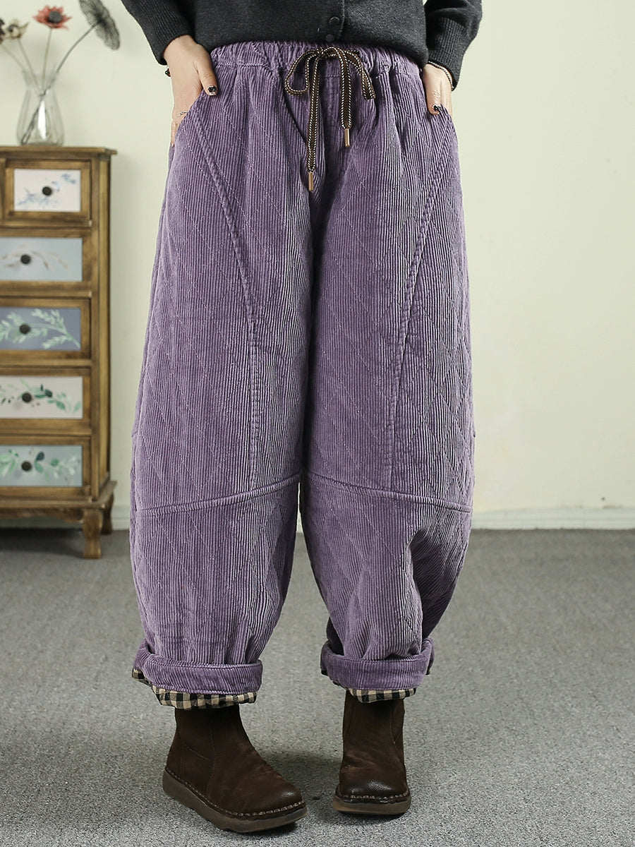 Calça Harem Feminina de Inverno Retrô em Veludo Cotelê Cor Sólida com Acolchoamento