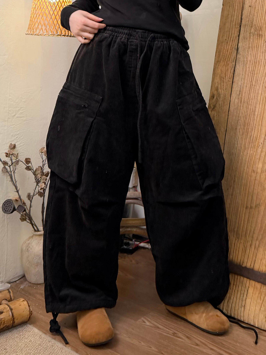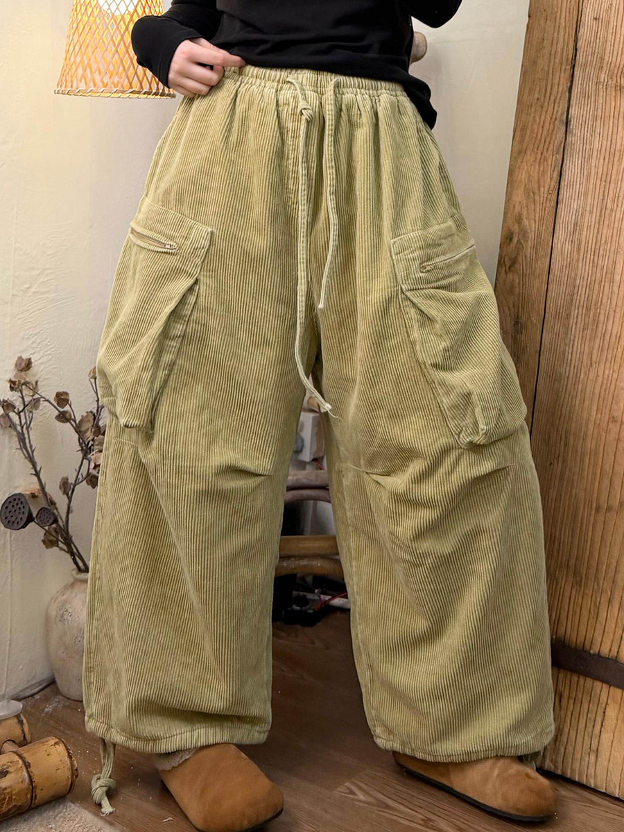 Calça feminina de inverno retrô de veludo cotelê, cor lisa, pernas largas