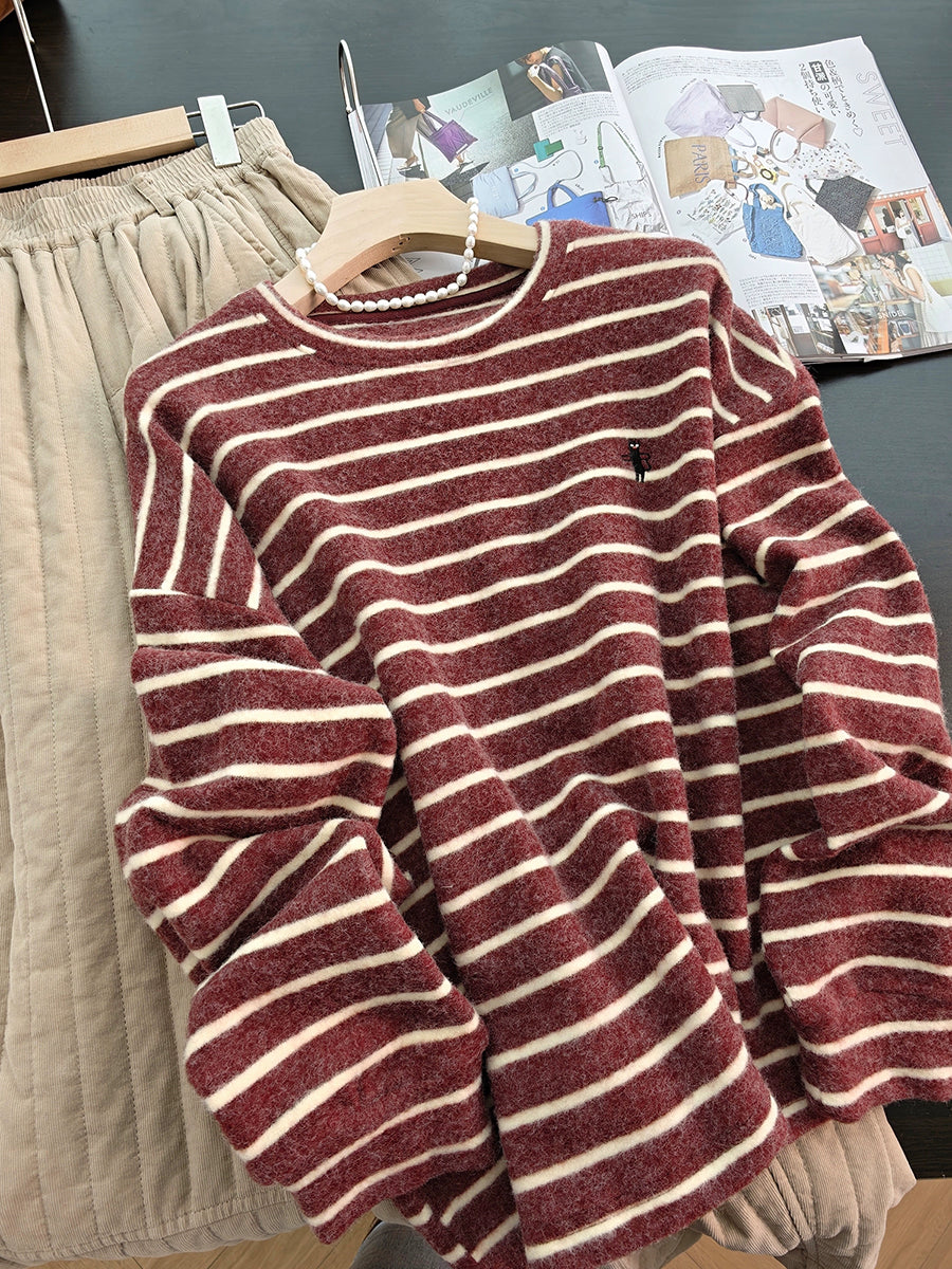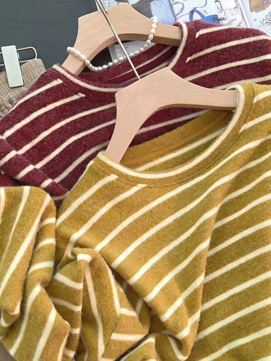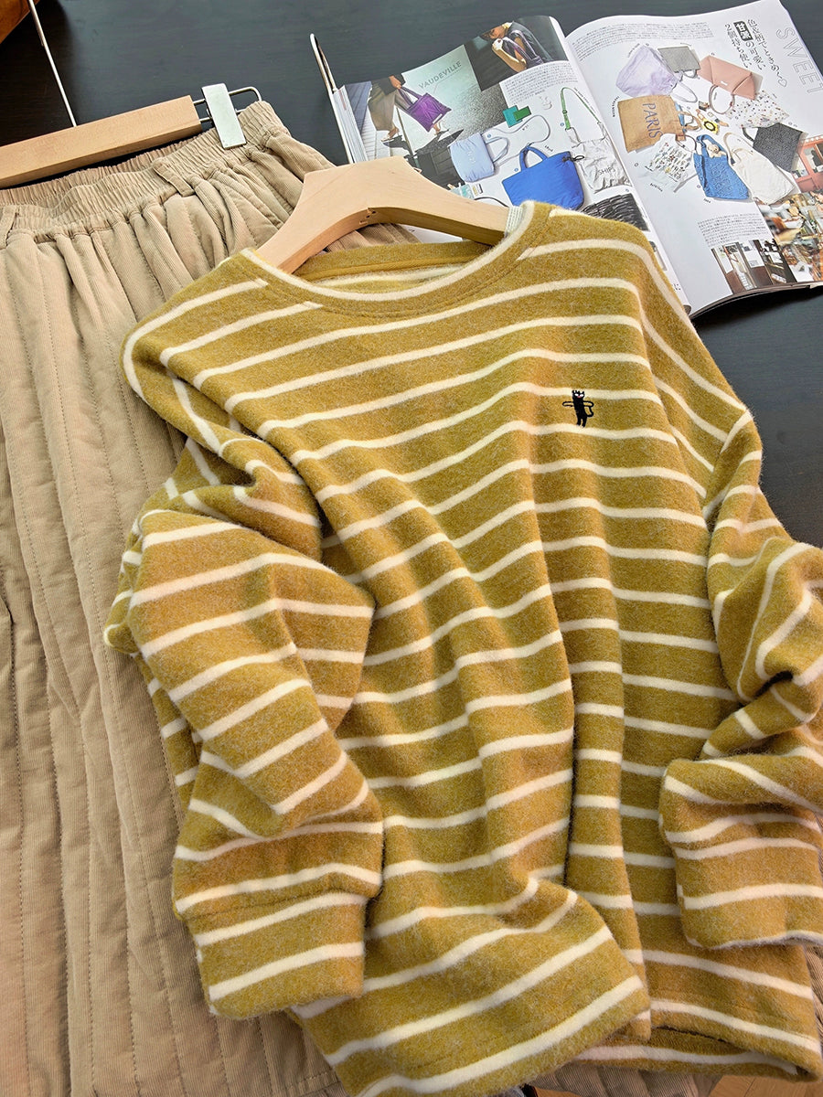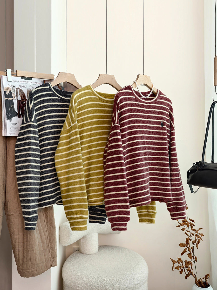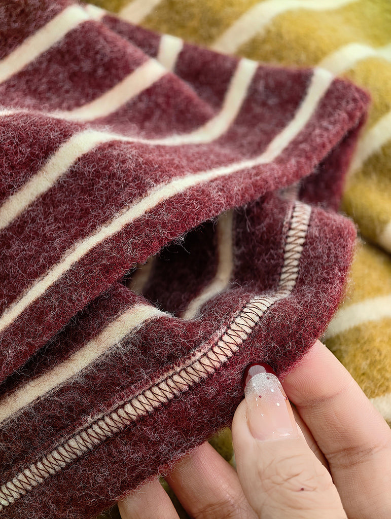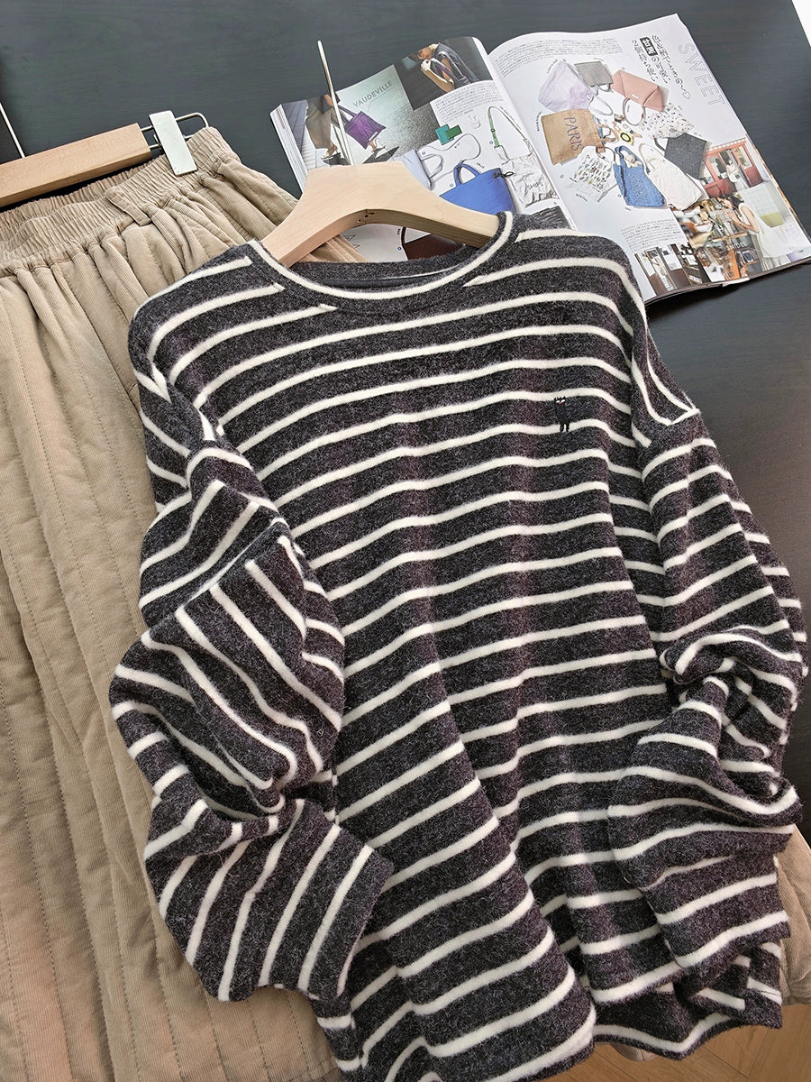 Blusa feminina de inverno com estampa retrô de listras e gola redonda