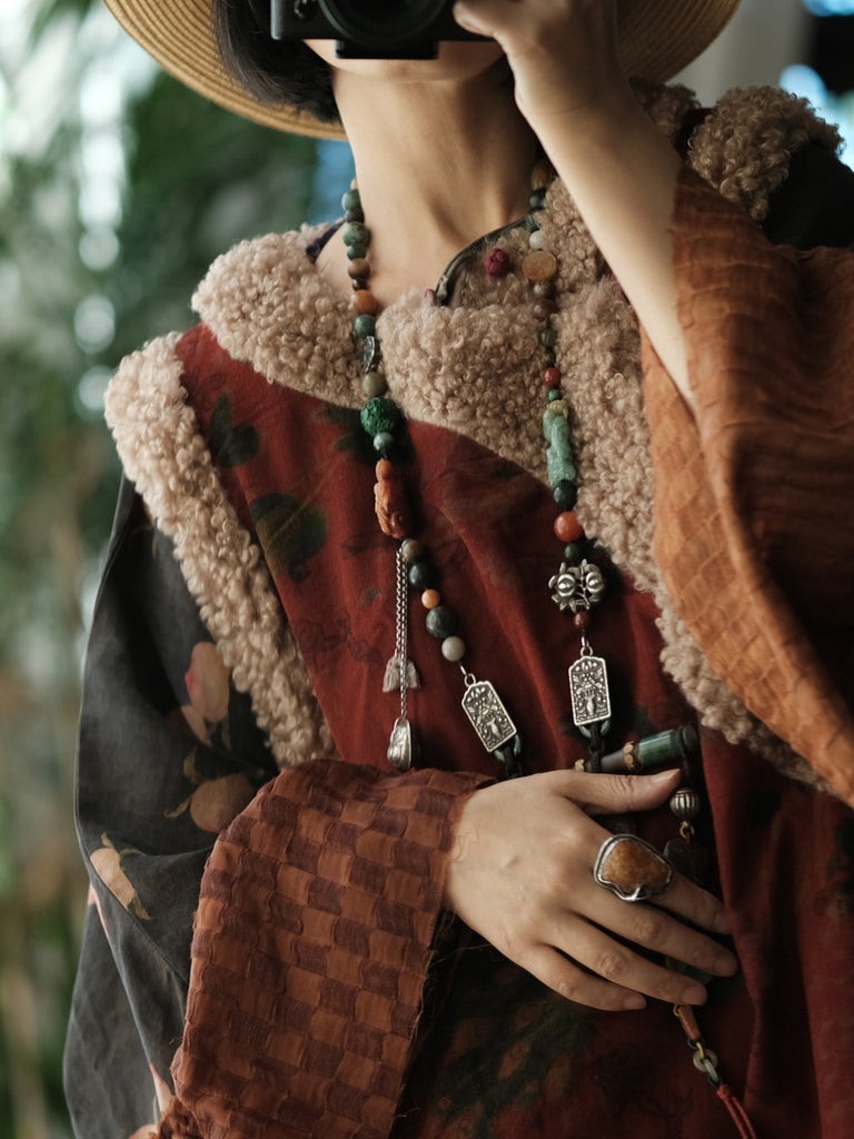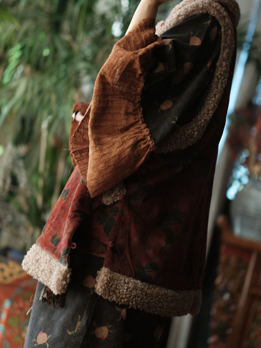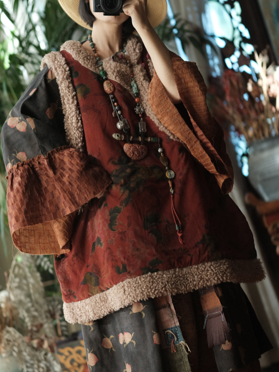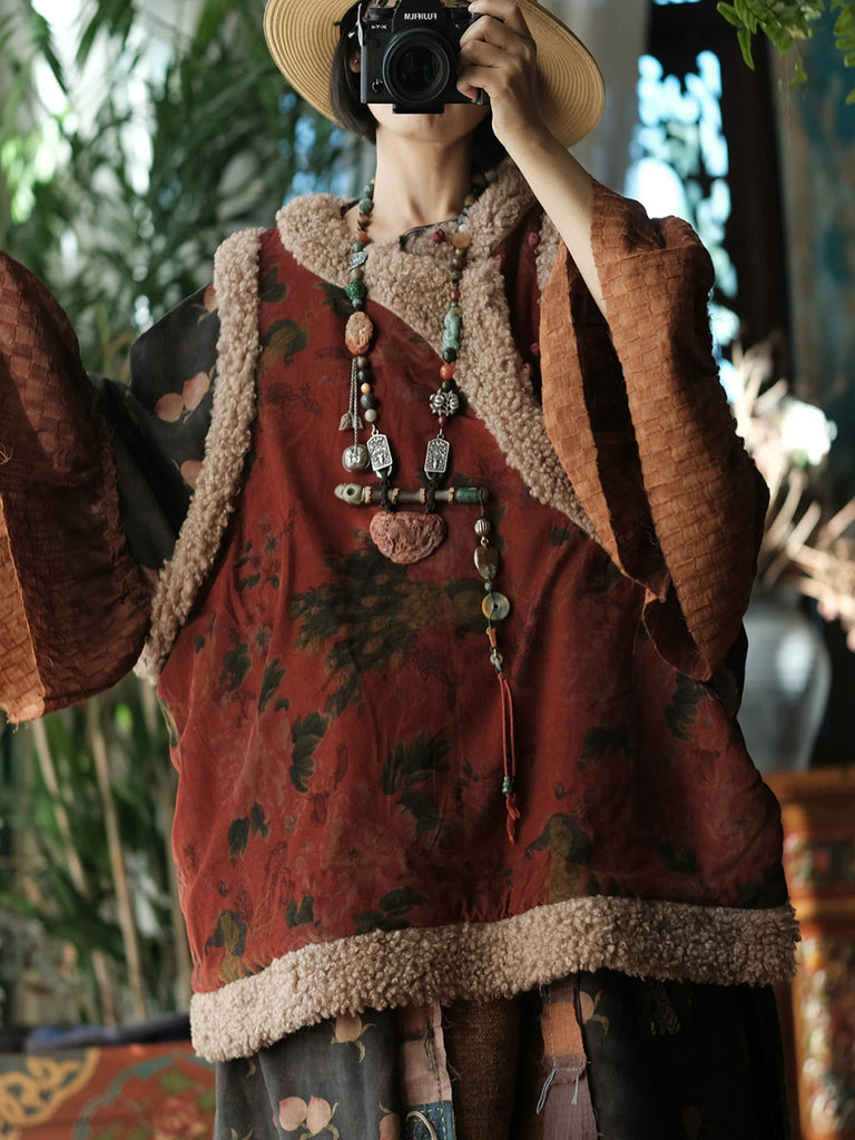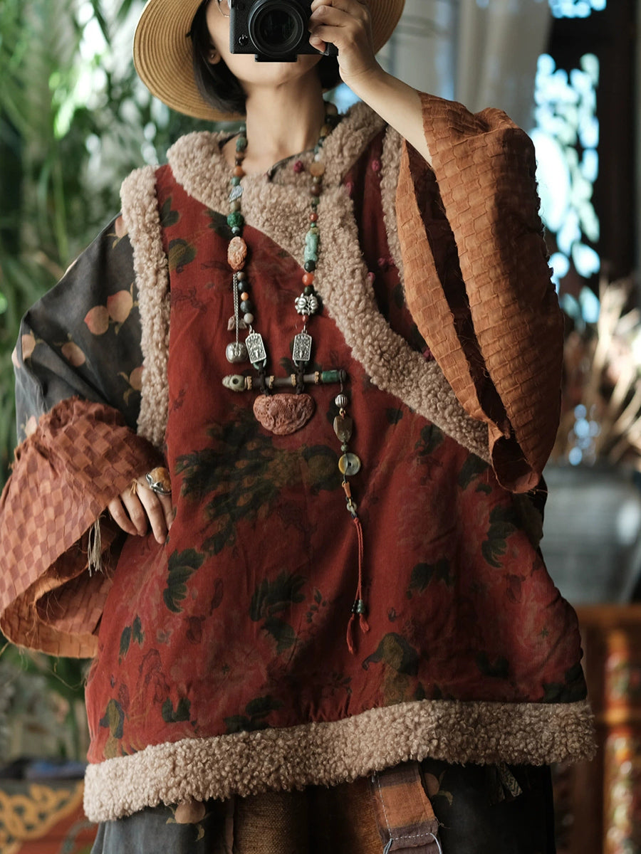 Colete acolchoado feminino de inverno vintage com estampa floral e detalhes em fleece.