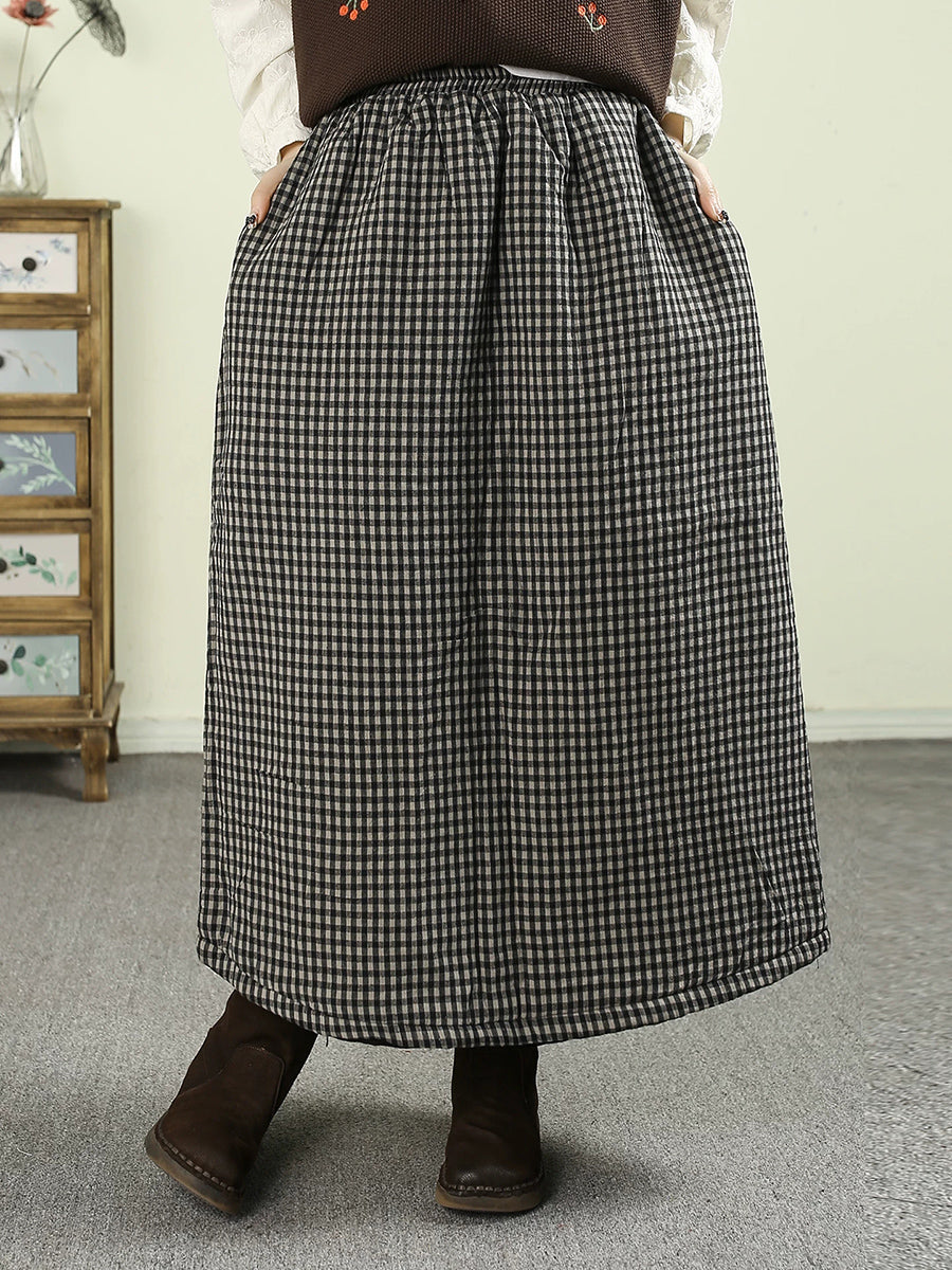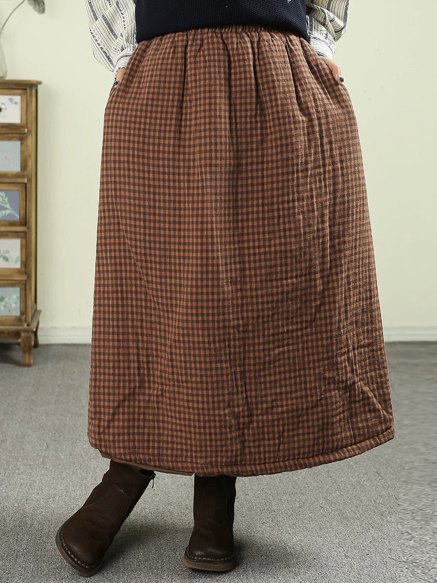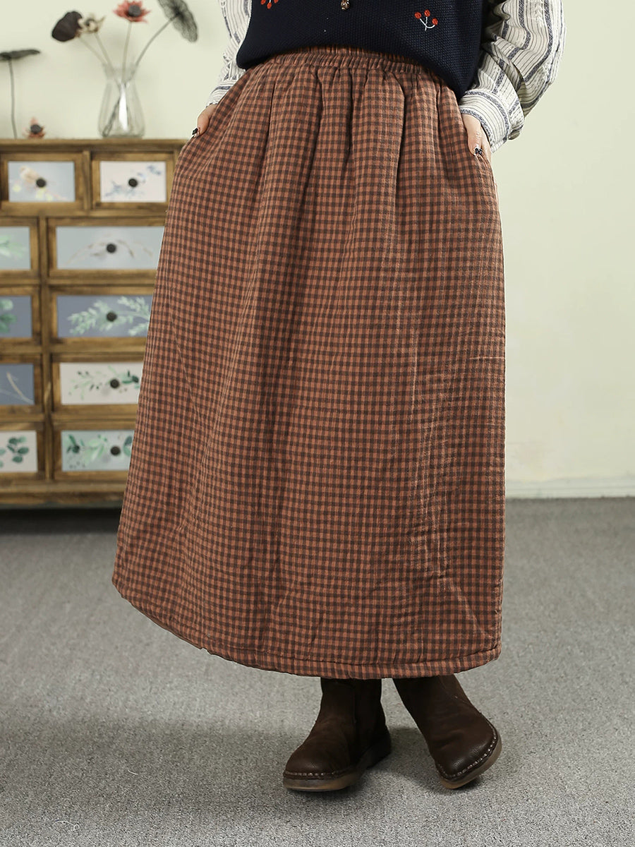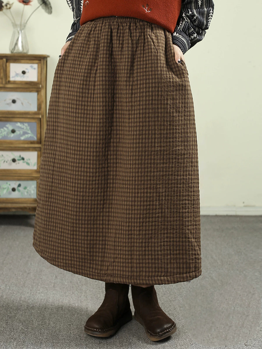 Saia acolchoada feminina vintage de inverno com estampa xadrez, 100% algodão.