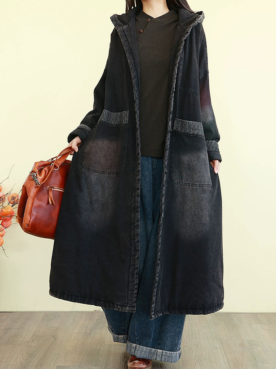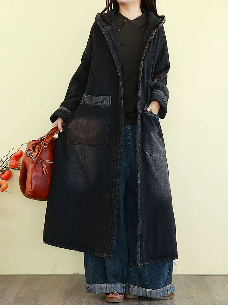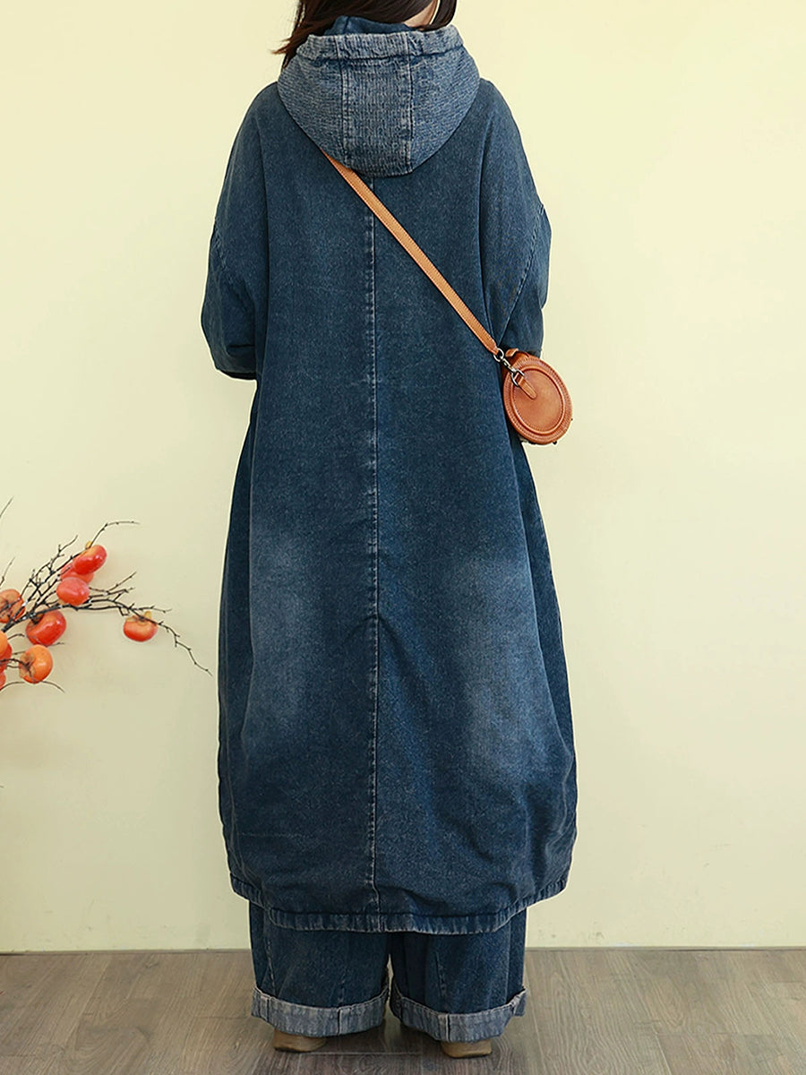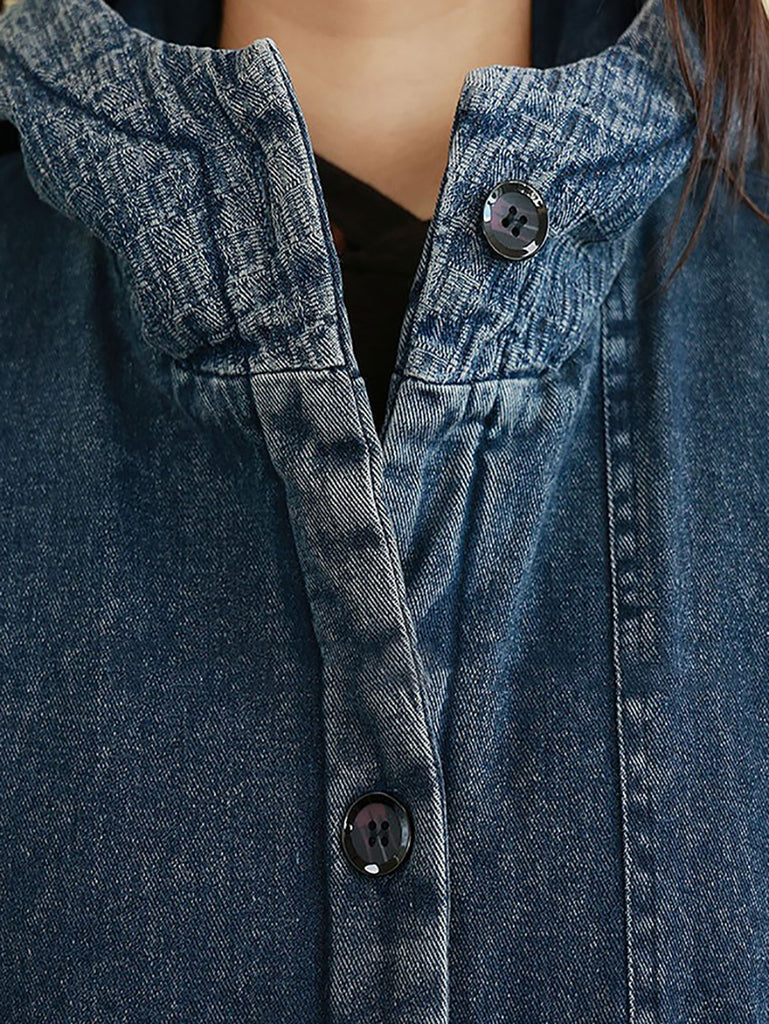 Casaco feminino de inverno vintage com capuz e acolchoado em jeans lavado.