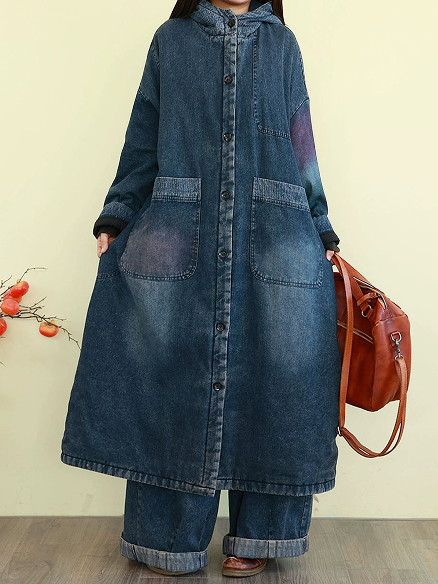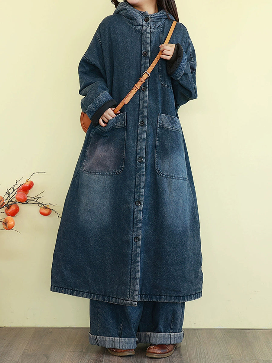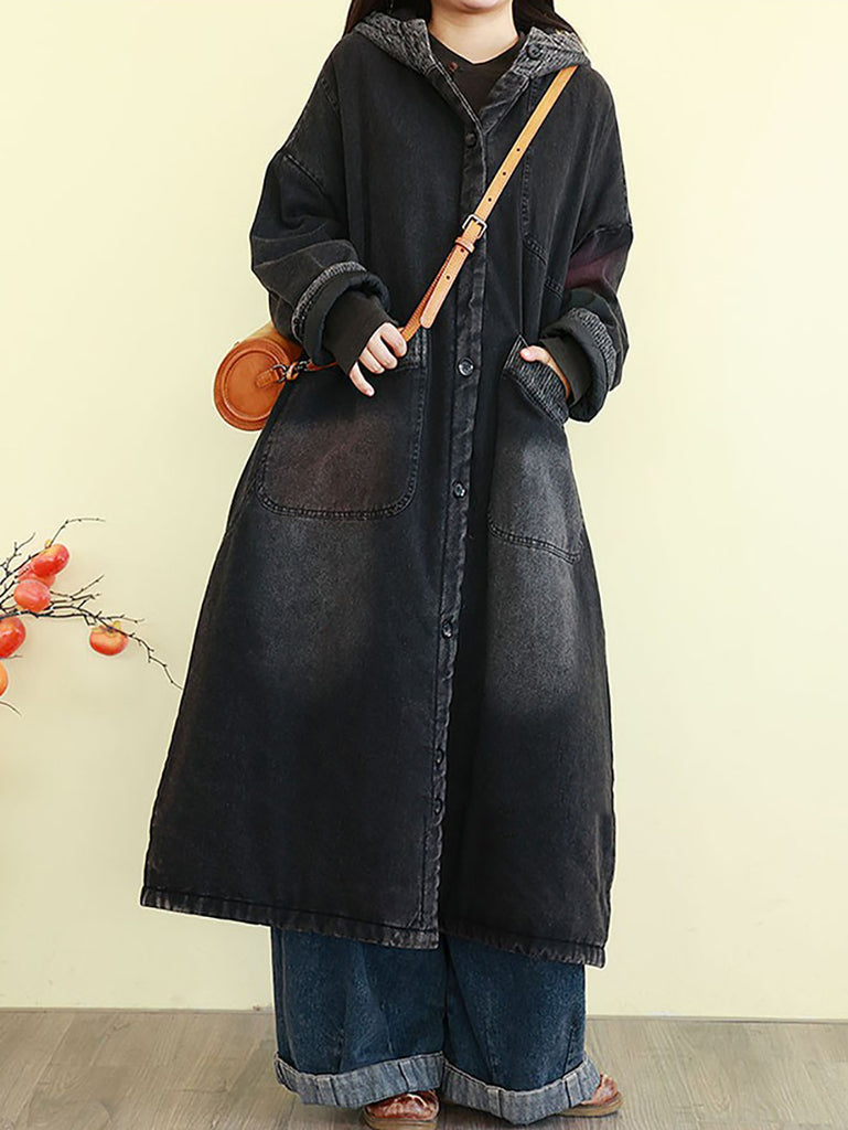 Casaco feminino de inverno vintage com capuz e acolchoado em jeans lavado.